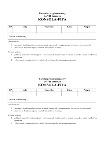 Formularz zg oszeniowy do VII turnieju KONSOLA-FIFA LP Imi Nazwisko Klasa Podpis 1. Telefon kontaktowy : wiadczam, e: 1. zapozna em si z Regulaminem turnieju, akceptuj jego warunki i b 2. znany mi jest Regulamin imprezy, w ramach której odbywa si turniej, przestrzega zawartych w nim postanowie , Wyra am zgod na: 1. publikacj materia ów informacyjnych i audiowizualnych zrealizowanych w oparciu o zawody z moim udzia em bez ogranicze , 2. wykorzystanie moich danych osobowych dla celów zwi zanych z realizacj przedsi wzi cia. Formularz zg oszeniowy do VII turnieju KONSOLA-FIFA LP Imi Nazwisko Klasa Podpis 1. Telefon kontaktowy : wiadczam, e: 3. zapozna em si z Regulaminem turnieju, akceptuj jego warunki i b 4. znany mi jest Regulamin imprezy, w ramach której odbywa si turniej, przestrzega zawartych w nim postanowie , Wyra am zgod na: 3. publikacj materia ów informacyjnych i audiowizualnych zrealizowanych w oparciu o zawody z moim udzia em bez ogranicze , 4. wykorzystanie moich danych osobowych dla celów zwi zanych z realizacj przedsi wzi cia.