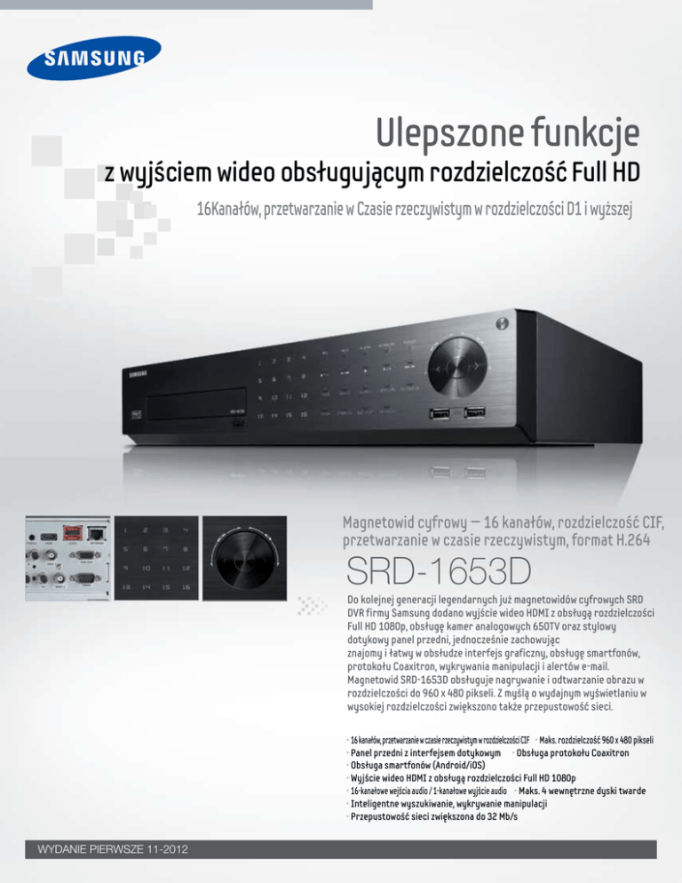 Ulepszone funkcje z wyjściem wideo obsługującym rozdzielczość Full HD 16Kanałów, przetwarzanie w Czasie rzeczywistym w rozdzielczości D1 i wyższej Magnetowid cyfrowy — 16 kanałów, rozdzielczość CIF, przetwarzanie w czasie rzeczywistym, format H.264 SRD-1653D Do kolejnej generacji legendarnych już magnetowidów cyfrowych SRD DVR firmy Samsung dodano wyjście wideo HDMI z obsługą rozdzielczości Full HD 1080p, obsługę kamer analogowych 650TV oraz stylowy dotykowy panel przedni, jednocześnie zachowując znajomy i łatwy w obsłudze interfejs graficzny, obsługę smartfonów, protokołu Coaxitron, wykrywania manipulacji i alertów e-mail. Magnetowid SRD-1653D obsługuje nagrywanie i odtwarzanie obrazu w rozdzielczości do 960 x 480 pikseli. Z myślą o wydajnym wyświetlaniu w wysokiej rozdzielczości zwiększono także przepustowość sieci. • 16 kanałów, przetwarzanie w czasie rzeczywistym w rozdzielczości CIF • Maks. rozdzielczość 960 x 480 pikseli • Panel przedni z interfejsem dotykowym • Obsługa protokołu Coaxitron • Obsługa smartfonów (Android/iOS) • Wyjście wideo HDMI z obsługą rozdzielczości Full HD 1080p • 16-kanałowe wejścia audio / 1-kanałowe wyjście audio • Maks. 4 wewnętrzne dyski twarde • Inteligentne wyszukiwanie, wykrywanie manipulacji • Przepustowość sieci zwiększona do 32 Mb/s WYDANIE PIERWSZE 11-2012 Magnetowid cyfrowy — 16 kanałów, rozdzielczość CIF, przetwarzanie w czasie rzeczywistym, format H.264 SRD-1653D Dane techniczne SRD-1653D Wejścia Rozdzielczość Liczba klatek na sekundę Na żywo Rozdzielczość Wyświetlanie wieloekranowe PARAMETRY PRACY System operacyjny Wbudowany Kompresja Wizja Pamięć Zabezpieczenia Wymiary Jednostka: mm INTERFEJSY Monitorowanie 265.2 (10.44") 246.8 (9.72") Dźwięk Alarm Połączenia 440.0 (17.32") VGA HDMI Obserwacja (złącze kompozytowe) Wejścia/Wyjście Kompresja Częstotliwość próbkowania Wejścia/wyjścia Zdalne powiadamianie Ethernet Interfejs szeregowy USB e-SATA Obsługa zdalna 440.0 (17.32") 88.0 (3.46") 95.9 (3.78") Obsługa protokołów Znak Eco oznacza, że firma Samsung Techwin dba o to, aby jej produkty były przyjazne środowisku oraz, że dany produkt jest zgodny z dyrektywą EU RoHS.. OGÓLNE Parametry elektryczne Warunki środowiskowe Napięcie/prąd wejściowy Pobór mocy Temperatura/wilgotność robocza Wymiary (szer. x wys. x gł.) Parametry fizyczne Waga (z dyskami twardymi) Zestaw do montażu w szafie rack Język 1 VGA (1280x720, 1280x1024, 1920x1080) 1 HDMI (1280x720, 1280x1024, 1920x1080) Obserwacja cyfrowo (2CH) * Ekranowe menu USD , obsługa wielu trybów (1CH) 16-kanałowe wejście liniowe (wbudowane 4 kanały, opcjonalnie: przedłużacz audio) / 1-liniowe wyjście G.711 8KHz 16 wejść zaciskowych (NO/NZ) / 4 zaciskowe wyjścia przekaźnikowe (NO/NZ), wartość znamionowa: 30 V DC/2 A, 250 V AC/0,25 A Powiadamianie pocztą elektroniczną 1 RJ45 10/100/1000 Base-T RS-232/RS-485 do kamer PTZ, klawiatura systemowa Samsung Porty USB 2.0 i 2 2 zewnętrzne porty SATA Mysz, pilot Samsung-T/E, Pelco-D/P / Panasonic / Phillips / AD / DIAMOND / ERNA / KALATEL / VCL TP / VICON / ELMO / GE Sterowanie PTZ za pośrednictwem kabla koncentrycznego (Samsung CCVC, Pelco-C (Coaxitron)) 265.2 (10.44") Smartfon 246.8 (9.72") Sieć (IPv4) Od 100 do 240 V AC ±10%; 50/60 Hz, automatyczny zakres Maks. 60 W (z jednym dyskiem twardym) 88.0 (3.46") Wyszukiwanie i odtwarzanie Linux H.264 NTSC : Do 120kl./s przy960x480 / PAL : Do 100kl./s przy960x576 NTSC : Do 120kl./s przy704x480 / PAL : Do 100kl./s przy704x576 Prędkość rejestracji NTSC : Do 240kl./s przy704x240 / PAL : Do 200kl./s przy704x288 NTSC : Do 480kl./s przy352x240 / PAL : Do 400kl./s przy352x288 NTSC : Ręczny, harmonogram (ciągły/zdarzenia), zdarzenia (przed/po), Szybkość klatek (1~30 kl./s) Tryb PAL : Ręczny, harmonogram (ciągły/zdarzenia), zdarzenia (przed/po), Szybkość klatek (1~25 kl./s) Zdarzenie Utrata obrazu, ruch (poziom 1–10), alarm, manipulacja (poziom 1–3) Tryby nadpisywania Ciągłe Pre-alarm Do 30 s (5,10,20,30 S) Post-alarm Do 6 godz (5,10,20,30 s,1,3,5,10,20 min,1,2,3,4,5,6 godz) Data/godzina, zdarzenie, kopia zapasowa, punkt POS, ruch (* Wszystkie wyszukiwania mają funkcję podglądu) Tryb wyszukiwania Przewijanie do przodu/do tyłu (x2,x4,x8,x16,x32,x64) * Odtwarzanie do tyłu tylko I-frame, Funkcje odtwarzania Odtwarzanie zwolnione do przodu/do tyłu (x1/2,x1/4,x1/8) Przewijanie poklatkowe do przodu/do tyłu (x2, x4,x8,x16,x32,x64) * Odtwarzanie do tyłu tylko I-frame Prędkość transmisji 4CIF/2CIF/CIF (120/240/480kl./s NTSC, 100/200/400kl./s PAL) Pasmo Do 32Mb/s Kontrola pasma Możliwość wyboru Strumienie H.264 (możliwość wyboru spośród 4CIF/2CIF/CIF) Maks. liczba użytkowników zdalnych Wyszukiwanie (3) / Wysyłanie do jednej osoby na żywo (10) / Wysyłanie do wielu osób na żywo (20) Obsługa protokołów TCP/IP, DHCP, PPPoE, SMTP, NTP, HTTP, DDNS, RTP, RTSP, SNMP Monitoring Net-I Viewer, Smart viewer, Webviewer Platforma Android, iOS Obsługa protokołów RTP, RTSP, HTTP, CGI Maks. liczba użytkowników zdalnych Na żywo(1) Wewnętrzne dyski twarde Maks. 4 dyski twarde SATA Zewnętrzne (interfejs e-SATA) Do 2 stacji rozszerzeń (* Model: SVS-5R/5E) Nagrywarka DVD (kopia zapasowa) Tak USB (archiwizacja) 2 porty USB Format plików (archiwizacja) BU (przeglądanie w DVR), EXE (zawiera player) Ochrona hasłem 1 administrator, 10 grup, 10 użytkowników na 1 grupę Uwierzytelnianie danych Znak wodny 95.9 (3.78") Nagrywanie 16 kompozytowych złączy wideo, 0,5–1 Vpp, 75 omów z automatycznym zakończeniem NTSC : 960 x 480, 720 x 480 / PAL : 960 x 576, 720 x 576 NTSC : 480kl./s / PAL : 400kl./s NTSC : 960 x 480, 720 x 480 / PAL : 960 x 576, 720 x 576 1/4/7/9/13/16/16A/PIP/Sekwencja Od +0°C do +40°C / 20% – 85% wilgotności względnej 440 x 88 x 246,8 Ok. 5.2 kg 2 EA Koreański, japoński, chiński (uproszczony/tradycyjny), angielski, francuski, niemieck