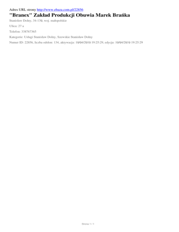 Adres URL strony http://www.ebaza.com.pl/22856 "Branex" Zakład Produkcji Obuwia Marek Brańka Stanisław Dolny, 34-130, woj. małopolskie Ulica: 27 a Telefon: 338767365 Kategorie: Usługi Stanisław Dolny, Szewskie Stanisław Dolny Numer ID: 22856, liczba odsłon: 134, aktywacja: 10/04/2010 19:25:29, edycja: 10/04/2010 19:25:29 Strona 1 / 1