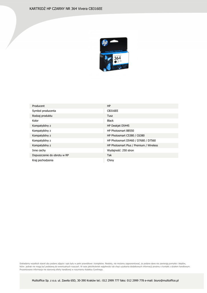 KARTRIDŻ HP CZARNY NR 364 Vivera CB316EE Producent HP Symbol producenta CB316EE Rodzaj produktu Tusz Kolor Black Kompatybilny z HP Deskjet D5445 Kompatybilny z HP Photosmart B8550 Kompatybilny z HP Photosmart C5380 / C6380 Kompatybilny z HP Photosmart D5460 / D7680 / D7560 Kompatybilny z HP Photosmart Plus / Premium / Wireless Inne cechy Wydajność: 250 stron Dopuszczenie do obrotu w RP Tak Kraj pochodzenia Chiny Dokładamy wszelkich starań aby podane zdjęcie i opis były w pełni prawidłowe i kompletne. Niestety, nie możemy zagwarantować, że podane dane nie zawierają pomyłek i błędów, które jednak nie mogą być podstawą do ewentualnych roszczeń. W razie jakichkolwiek wątpliwości lub chęci uzyskania dodatkowych informacji prosimy o kontakt z działem handlowym. Prezentowane informacje nie stanowią oferty handlowej w rozumieniu Kodeksu Cywilnego. Multioffice Sp. z o.o. ul. Zawiła 65D, 30-390 Kraków tel.: 012 2999 777 faks: 012 2999 778 e-mail: [email protected]