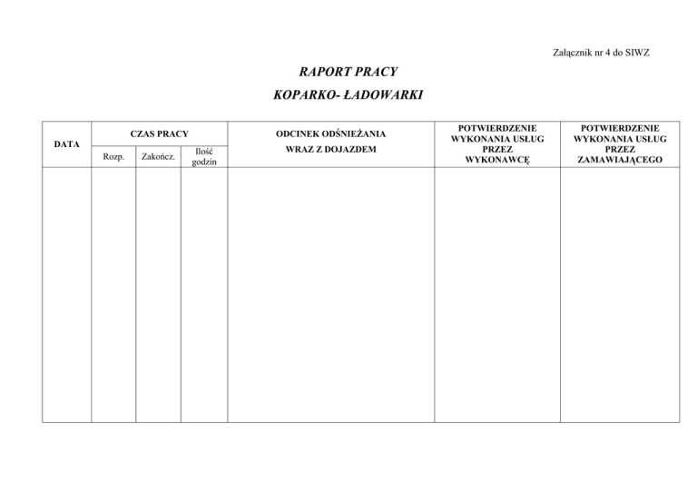 Załącznik nr 4 do SIWZ RAPORT PRACY KOPARKO- ŁADOWARKI CZAS PRACY DATA Rozp. Zakończ. ODCINEK ODŚNIEśANIA Ilość godzin WRAZ Z DOJAZDEM POTWIERDZENIE WYKONANIA USŁUG PRZEZ WYKONAWCĘ POTWIERDZENIE WYKONANIA USŁUG PRZEZ ZAMAWIAJĄCEGO