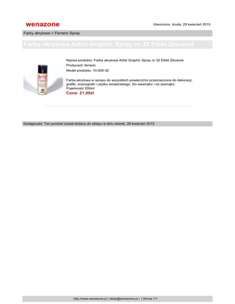 wenazone Utworzono: środa, 29 kwiecień 2015 Farby akrylowe > Ferrario Spray Farba akrylowa Artist Graphic Spray nr 32 Efekt Złocenia Nazwa produktu: Farba akrylowa Artist Graphic Spray nr 32 Efekt Złocenia Producent: ferrario Model produktu: 10-200-32 Farba akrylowa w sprayu do wszystkich powierzchni przeznaczona do dekoracji, grafiki, scenografii i użytku amatorskiego. Do wewnątrz i na zewnątrz. Pojemność 200ml Cena: 21,00zł Dostępność: Ten produkt został dodany do sklepu w dniu wtorek, 28 kwiecień 2015 http://www.wenazone.pl | [email protected] | | Strona 1/1