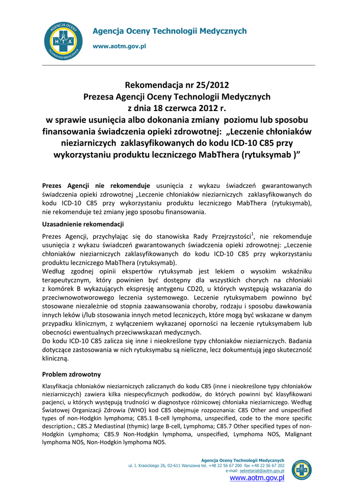 Agencja Oceny Technologii Medycznych www.aotm.gov.pl Rekomendacja nr 25/2012 Prezesa Agencji Oceny Technologii Medycznych z dnia 18 czerwca 2012 r. w sprawie usunięcia albo dokonania zmiany poziomu lub sposobu finansowania świadczenia opieki zdrowotnej: „Leczenie chłoniaków nieziarniczych zaklasyfikowanych do kodu ICD‐10 C85 przy wykorzystaniu produktu leczniczego MabThera (rytuksymab )” Prezes Agencji nie rekomenduje usunięcia z wykazu świadczeń gwarantowanych świadczenia opieki zdrowotnej „Leczenie chłoniaków nieziarniczych zaklasyfikowanych do kodu ICD‐10 C85 przy wykorzystaniu produktu leczniczego MabThera (rytuksymab), nie rekomenduje też zmiany jego sposobu finansowania. Uzasadnienie rekomendacji Prezes Agencji, przychylając się do stanowiska Rady Przejrzystości1, nie rekomenduje usunięcia z wykazu świadczeń gwarantowanych świadczenia opieki zdrowotnej: „Leczenie chłoniaków nieziarniczych zaklasyfikowanych do kodu ICD‐10 C85 przy wykorzystaniu produktu leczniczego MabThera (rytuksymab). Według zgodnej opinii ekspertów rytuksymab jest lekiem o wysokim wskaźniku terapeutycznym, który powinien być dostępny dla wszystkich chorych na chłoniaki z komórek B wykazujących ekspresję antygenu CD20, u których występują wskazania do przeciwnowotworowego leczenia systemowego. Leczenie rytuksymabem powinno być stosowane niezależnie od stopnia zaawansowania choroby, rodzaju i sposobu dawkowania innych leków i/lub stosowania innych metod leczniczych, które mogą być wskazane w danym przypadku klinicznym, z wyłączeniem wykazanej oporności na leczenie rytuksymabem lub obecności ewentualnych przeciwwskazań medycznych. Do kodu ICD‐10 C85 zalicza się inne i nieokreślone typy chłoniaków nieziarniczych. Badania dotyczące zastosowania w nich rytuksymabu są nieliczne, lecz dokumentują jego skuteczność kliniczną. Problem zdrowotny Klasyfikacja chłoniaków nieziarniczych zaliczanych do kodu C85 (inne i nieokreślone typy chłoniaków nieziarniczych) zawiera kilka niespecyficznych podkodów, do których powinni być klasyfikowani pacjenci, u których występują trudności w diagnostyce różnicowej chłoniaka nieziarniczego. Według Światowej Organizacji Zdrowia (WHO) kod C85 obejmuje rozpoznania: C85 Other and unspecified types of non‐Hodgkin lymphoma; C85.1 B‐cell lymphoma, unspecified, code to the more specific description.; C85.2 Mediastinal (thymic) large B‐cell, Lymphoma; C85.7 Other specified types of non‐ Hodgkin Lymphoma; C85.9 Non‐Hodgkin lymphoma, unspecified, Lymphoma NOS, Malignant lymphoma NOS, Non‐Hodgkin lymphoma NOS. Agencja Oceny Technologii Medycznych ul. I. Krasickiego 26, 02-611 Warszawa tel. +48 22 56 67 200 fax +48 22 56 67 202 e-mail: [email protected] www.aotm.gov.pl Rekomendacja nr 25/2012 Prezesa AOTM z dnia 18 czerwca 2012 r. Występują pewne rozbieżności pomiędzy polską klasyfikacją ICD‐10 C85 a edycją WHO, gdzie brak jest kodu C85.0: mięsak limfatyczny. Natomiast w edycji polskiej pominięto kod C85.2: mediastinal (thymic) large B‐cell lymphoma (chłoniak pierwotny śródpiersia z dużych komórek linii B). Oprócz jednego konkretnego podkodu zarówno w edycji polskiej, jak i WHO, wszystkie inne są na tyle niespecyficzne i nieokreślone, że istnieje możliwość zakwalifikowania do nich pacjentów z różnymi typami chłoniaków nieziarniczych. Chłoniaki nieziarnicze (NHL) to nowotwory tkanki limfatycznej, krwiotwórczej i tkanek pokrewnych. Cechą charakterystyczną NHL jest rozrost klonalny komórek limfoidalnych odpowiadających różnym stadiom zróżnicowania prawidłowych limfocytów B, T lub naturalnych komórek cytotoksycznych (NK). Pierwotnym ogniskiem chłoniaków nieziarniczych są najczęściej węzły chłonne, aczkolwiek proces nowotworowy może również rozwijać się od początku w innych narządach, takich jak skóra bądź żołądek. Etiologia NHL nie jest poznana, wśród potencjalnych czynników wpływających na rozwój nowotworów wywodzących się z układu chłonnego wymienia się: wirusy (Epstein‐Barr, HTLV‐1, HIV, HHC‐8, HCV C), bakterie (np.: Helicobacter pylori, Borrelia burgdoferi, Campylobacter jejuni, Chlamydia psitaci), choroby autoimmunologiczne, wrodzone niedobory immunologiczne (zespół Wiskotta i Aldricha, zespół ataksja‐telangiektazja), nabyte niedobory immunologiczne (AIDS, immunosupresyjny zespół poprzeszczepowy), leki cytostatyczne i immunomodulujące, związki chemiczne (np.: aromatyczne związki cykliczne, związki sosowane w ochronie roślin), czynniki fizyczne (np.: promieniowanie jonizujące), aktywacja onkogenów na skutek przełamania mechanizmów supresorowych. Na świecie częstość występowania chłoniaków rośnie o około 5% rocznie i stanowi jeden z najwyższych wskaźników spośród wszystkich rodzajów nowotworów, co w głównej mierze spowodowane jest postępem zaawansowanych technik diagnostycznych zwiększających wykrywalność chłoniaków. Istotny wpływ na częstość występowania chłoniaków ma też wysoka zachorowalność na ten typ nowotworu u młodych mężczyzn z zakażeniem HIV. Nie bez znaczenia jest także fakt, iż chłoniaki mogą rozwijać się także u innych osób z zaburzoną odpornością, a w szczególności u pacjentów poddawanych długotrwałej immunosupresji, np. po przebytej transplantacji, czy leczonych z powodu chorób o podłożu autoimmunologicznym. Ryzyko zachorowań rośnie wraz z wiekiem, osiągając szczyt ok. 70 r.ż.. Wyjątek stanowią chłoniaki limfoblastyczne, które najczęściej występują u dzieci i młodych dorosłych. Chłoniaki nieziarnicze stanowią 4‐5% nowotworów złośliwych w Polsce. W odniesieniu do chłoniaków nieziarniczych zakwalifikowanych do kodu ICD‐10 C85, według danych Krajowego Rejestru Nowotworów w latach 1999 do 2009, rocznie stwierdzono od około 700 do 1100 zachorowań oraz od około 700, poprzez 900, do 800 zgonów w kolejnych latach