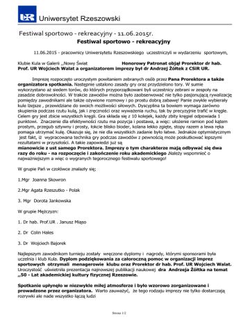Uniwersytet Rzeszowski Festiwal sportowo - rekreacyjny - 11.06.2015r. Festiwal sportowo - rekreacyjny 11.06.2015 - pracownicy Uniwersytetu Rzeszowskiego uczestniczyli w wydarzeniu sportowym, Klubie Kula w Galerii ,,Nowy Świat Honorowy Patronat objął Prorektor dr hab. Prof. UR Wojciech Walat a organizatorem imprezy był dr Andrzej Żółtek z CSiR UR. Imprezę rozpoczęto uroczystym powitaniem zebranych osób przez Pana Prorektora a także organizatora spotkania. Następnie ustalono zasady gry oraz przydzielono tory. W sumie wykorzystano aż siedem torów, do których przyporządkowani byli uczestnicy zebrani w zespoły na zasadzie dobrowolności. W trakcie zawodów można było zaobserwować nie tylko pasjonującą rywalizację pomiędzy zawodnikami ale także ożywione rozmowy i po prostu dobrą zabawę! Panie zwykle wybierały kule lżejsze , przewidziane do swoich możliwości siłowych. Dyscyplina ta bowiem wymaga zarówno skupienia podczas rzutu kulą, jak i zręczności oraz wyważenia ruchu, tak by precyzyjnie trafić w kręgle. Celem gry jest zbicie wszystkich kręgli. Gra składa się z 10 kolejek, każdy zbity kręgiel odpowiada 1 punktowi. Znaczenie dla efektywności rzutu ma pozycja i postawa, a więc: ułożenie ramion pod kątem prostym, przegub sztywny i prosty, łokcie blisko bioder, kolana lekko zgięte, stopy razem a lewa ręka pomaga utrzymać kulę. Okazuje się, że nie dla wszystkich zadanie było łatwe. Jednakże optymistycznym jest fakt, iż wypracowana technika gry podczas zawodów z pewnością może poskutkować lepszymi rezultatami w przyszłości. A takie zapowiedzi już są mianowicie z ust samego Prorektora. Imprezy o tym charakterze mają odbywać się dwa razy do roku - na rozpoczęcie i zakończenie roku akademickiego .Należy wspomnieć o najważniejszym a więc o wygranych tegorocznego festiwalu sportowego! W grupie Pań w czołówce znalazły się; 1.Mgr Joanna Skowron 2.Mgr Agata Rzeszutko - Polak 3. Mgr Dorota Jankowska W grupie Mężczyzn: 1. Dr hab. Prof.UR . Janusz Miąso 2. Dr Colin Hales 3. Dr Wojciech Bajorek Najlepszym zawodnikom turnieju zostały wręczone dyplomy i nagrody, którymi sponsorami była uczelnia i klub Kula. Dyplom podziękowania za całoroczną pomoc w organizacji imprez sportowych otrzymali menagerowie klubu oraz Prorektor dr hab. Prof. UR Wojciech Walat. Uroczystość uświetniła prezentacja najnowszej publikacji naukowej dra Andrzeja Żółtka na temat ,,50 - Lat akademickiej kultury fizycznej Rzeszowie. Spotkanie upłynęło w niezwykle miłej atmosferze i było wzorowo zorganizowane i prowadzone przez organizatora. Warto zauważyć, że tego rodzaju imprezy nie tylko dostarczają rozrywki ale nade wszystko łączą ludzi Strona 1/2 Uniwersytet Rzeszowski Istotą takich wydarzeń nie jest ostra rywalizacja sportowa , która niewątpliwie podnosi możliwość zderzeń interpersonalnych, bo współczesny życzliwych, pogodnych, spontanicznych, prostych relacji międzyludzkich. Takie spotkania sprzyjają tym zaniedbywanym często relacjom. dr Edyta Obodyńska Strona 2/2 Powered by TCPDF (www.tcpdf.org)