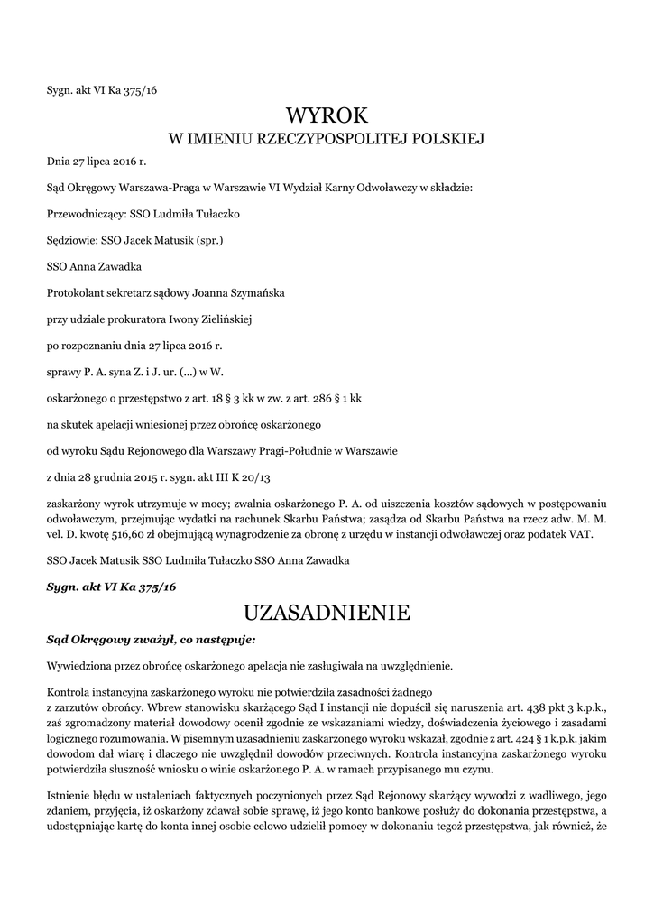 Sygn. akt VI Ka 375/16 WYROK W IMIENIU RZECZYPOSPOLITEJ POLSKIEJ Dnia 27 lipca 2016 r. Sąd Okręgowy Warszawa-Praga w Warszawie VI Wydział Karny Odwoławczy w składzie: Przewodniczący: SSO Ludmiła Tułaczko Sędziowie: SSO Jacek Matusik (spr.) SSO Anna Zawadka Protokolant sekretarz sądowy Joanna Szymańska przy udziale prokuratora Iwony Zielińskiej po rozpoznaniu dnia 27 lipca 2016 r. sprawy P. A. syna Z. i J. ur. (...) w W. oskarżonego o przestępstwo z art. 18 § 3 kk w zw. z art. 286 § 1 kk na skutek apelacji wniesionej przez obrońcę oskarżonego od wyroku Sądu Rejonowego dla Warszawy Pragi-Południe w Warszawie z dnia 28 grudnia 2015 r. sygn. akt III K 20/13 zaskarżony wyrok utrzymuje w mocy; zwalnia oskarżonego P. A. od uiszczenia kosztów sądowych w postępowaniu odwoławczym, przejmując wydatki na rachunek Skarbu Państwa; zasądza od Skarbu Państwa na rzecz adw. M. M. vel. D. kwotę 516,60 zł obejmującą wynagrodzenie za obronę z urzędu w instancji odwoławczej oraz podatek VAT. SSO Jacek Matusik SSO Ludmiła Tułaczko SSO Anna Zawadka Sygn. akt VI Ka 375/16 UZASADNIENIE Sąd Okręgowy zważył, co następuje: Wywiedziona przez obrońcę oskarżonego apelacja nie zasługiwała na uwzględnienie. Kontrola instancyjna zaskarżonego wyroku nie potwierdziła zasadności żadnego z zarzutów obrońcy. Wbrew stanowisku skarżącego Sąd I instancji nie dopuścił się naruszenia art. 438 pkt 3 k.p.k., zaś zgromadzony materiał dowodowy ocenił zgodnie ze wskazaniami wiedzy, doświadczenia życiowego i zasadami logicznego rozumowania. W pisemnym uzasadnieniu zaskarżonego wyroku wskazał, zgodnie z art. 424 § 1 k.p.k. jakim dowodom dał wiarę i dlaczego nie uwzględnił dowodów przeciwnych. Kontrola instancyjna zaskarżonego wyroku potwierdziła słuszność wniosku o winie oskarżonego P. A. w ramach przypisanego mu czynu. Istnienie błędu w ustaleniach faktycznych poczynionych przez Sąd Rejonowy skarżący wywodzi z wadliwego, jego zdaniem, przyjęcia, iż oskarżony zdawał sobie sprawę, iż jego konto bankowe posłuży do dokonania przestępstwa, a udostępniając kartę do konta innej osobie celowo udzielił pomocy w dokonaniu tegoż przestępstwa, jak również, że zakładając konto bankowe oskarżony udzielił pomocy sprawcom w popełnieniu przestępstwa. Autor apelacji podnosi również, iż Sąd meriti błędnie przyjął, że P. A. miał świadomość, że jego konto bankowe zostanie wykorzystane do przestępstwa, przez wpłatę na konto pieniędzy pochodzących z przestępstwa i na to się godził. Z powyższym stanowiskiem skarżącego nie sposób się jednakże zgodzić. Aby dokonać analizy postawy oskarżonego należy zdefiniować jakie znamiona winna spełniać osoba, której przypisuje się popełnienie przestępstwa pomocnictwa. Pomocnictwo polega na ułatwianiu innej osobie popełnienia czynu zabronionego. Ustawa wskazuje na typowe formy pomocnictwa, jakimi są: dostarczenie narzędzia, środka przewozu, a także udzielenie rady lub informacji. Użyty w ustawie zwrot "w szczególności" wskazuje, że w grę mogą wchodzić również inne formy pomocnictwa. Chodzi zatem o takie zachowania, które - obiektywnie rzecz biorąc - ułatwiają popełnienie czynu zabronionego, o czym przesądza określenie ustawowe "ułatwia". Strona podmiotowa pomocnictwa obejmuje obie postacie umyślności: zamiar bezpośredni i ewentualny. O zamiarze ewentualnym mówimy wówczas, gdy pomocnik może nie być w pełni poinformowany o zamiarze sprawcy i jedynie może przewidywać możliwość popełnienia przez niego przestępstwa, na co się godzi, skoro udziela pomocy. Pełna realizacja znamion pomocnictwa – podobnie jak w wypadku podżegania– obejmuje zarówno zachowanie się pomocnika, jak i dokonanie czynu zabronionego przez sprawcę, jest więc też skutkowe (vide, Marek A. Komentarz do art.18 Kodeksu karnego, Lex 2010r.). Reasumując, aby trafnie przypisać oskarżonemu odpowiedzialność za pomocnictwo należy określić czynność wykonawczą jakiej miał się dopuścić oraz udowodnić jakie faktycznie przestępstwo zostało za jakiego pomocą popełnione. Za oszustwo, o którym mowa w art. 286 § 1 k.k., odpowiada ten, kto w celu osiągnięcia korzyści majątkowej doprowadza inną osobę do niekorzystnego rozporządzenia własnym lub cudzym mieniem za pomocą wprowadzenia w błąd (oszustwo czynne), albo wyzyskania błędu tej osoby lub niezdolności do należytego pojmowania przedsiębranego działania (oszustwo bierne). Wprowadzenie w błąd oznacza, że sprawca swoimi podstępnymi zabiegami doprowadza inna osobę do mylnego wyobrażenia o rzeczywistym stanie rzeczy, zaś wyzyskanie błędu polega na wykorzystaniu przez sprawcę już istniejących, niezgodnych z rzeczywistością, opinii lub wyobrażeń osoby pokrzywdzonej. Istotnym elementem przestępstwa oszustwa jest dobrowolność rozporządzenia mieniem, przez pokrzywdzonego na rzecz sprawcy. "Dobrowolność" ta jest oczywiście wynikiem tego, że pokrzywdzony rozporządza mieniem błędnie oceniając znaczenie swojego czynu bądź to właśnie wskutek wprowadzenia go w błąd przez sprawcę, bądź w wyniku wyzyskania przez sprawcę błędu pokrzywdzonego lub też jego niezdolności do należytego pojmowania przedsiębranego działania. Warunkiem koniecznym do zaistnienia przestępstwa z art. 286 § 1 k.k. jest zatem, aby zachowanie sprawcy - o którym mowa wyżej - doprowadziło pokrzywdzonego do niekorzystnego rozporządzenia mieniem, a więc zachowanie to poprzedzało czynność w postaci rozporządzenia mieniem (vide, Wąska Andrzej, Komentarz do Kodeksu karnego. Część szczególna, C.H. Beck, Warszawa 2004, teza 28 do art. 286, tom II, str. 859 i cyt. tam judykat). Przypisując P. A. popełnienie czynu z art. 18§ 3 k.k. w zw. z art. 286§ 1 k.k. Sąd I instancji wskazał, iż oskarżony niewątpliwie wiedział, że przy pomocy jego konta dojdzie do popełnienia przestępstwa oszust