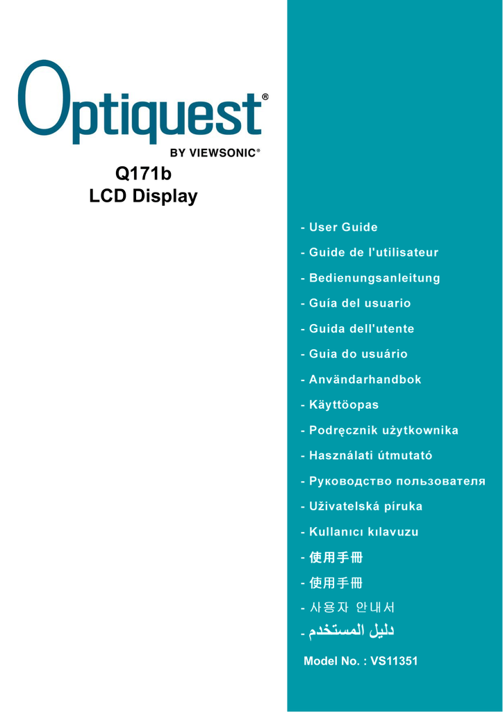 Q171b LCD Display Model No. : VS11351 Spis treúci TCO informacja ................................................................................................ i Oświadczenia o zgodności z przepisami ........................................................1 Ważne instrukcje bezpieczeństwa...................................................................2 Deklaracja zgodności RoHS............................................................................3 Prawo autorskie informacja .............................................................................4 Rejestracja produktu........................................................................................4 Wprowadzenie Zawartość opakowania ...................................................................................5 Środki ostrożności ..........................................................................................5 Szybka instalacja ............................................................................................6 Przygotowanie do montażu na ścianie (Opcja) ..............................................7 Korzystanie z monitora LCD Display Ustawianie trybu synchronizacji .....................................................................8 Ustawienia blokady menu ekranowego OSD i przycisku zasilania ................8 Regulacja obrazu ............................................................................................9 Elementy sterujące menu głównego ............................................................. 11 Inne informacje Dane techniczne ...........................................................................................15 Rozwiązywanie problemów ..........................................................................16 Pomoc techniczna klienta .............................................................................17 Czyszczenie monitora LCD Display .............................................................18 Limited Warranty ..........................................................................................19 ViewSonic Q171b TCO informacja Congratulations! The display you have just purchased carries the TCO’03 Displays label. This means that your display is designed, manufactured and tested according to some of the strictest quality and environmental requirements in the world. This makes for a high performance product, designed with the user in focus that also minimizes the impact on our natural environment. Some of the features of the TCO’03 Display requirements: Ergonomics Good visual ergonomics and image quality in order to improve the working environment for the user and to reduce sight and strain problems. Important parameters are luminance, contrast, resolution, reflectance, colour rendition and image stability. Energy • Energy-saving mode after a certain time - beneficial both for the user and the environment • Electrical safety Emissions • Electromagnetic fields • Noise emissions Ecology • The product must be prepared for recycling and the manufacturer must have a certified environmental management system such as EMAS or ISO 14000 • Restrictions on a. chlorinated and brominated flame retardants and polymers b. heavy metals such as cadmium, mercury and lead. The requirements included in this label have been developed by TCO Development in cooperation with scientists, experts, users as well as manufacturers all over the world. Since the end of the 1980s TCO has been involved in influencing the development of IT equipment in a more user-friendly direction. Our labelling system started with displays in 1992 and is now requested by users and IT-manufacturers all over the world. For more information, please visit www.tcodevelopment.com ViewSonic Q171b i Oświadczenia o zgodności z przepisami Oświadczenie FCC To urządzenie jest zgodne z częścią 15 zasad FCC. Jego działanie podlega następującym dwóm warunkom: (1) urządzenie to nie może powodować szkodliwych zakłóceń oraz (2) urządzenie to musi akceptować wszystkie odbierane zakłócenia, włącznie z zakłóceniami, które mogą powodować nieoczekiwane działanie. Urządzenie to zostało poddane testom, które stwierdziły, że spełnia ono ograniczenia dla urządzeń cyfrowych klasy B, zgodnie z częścią 15 Zasad FCC. Ograniczenia te określono w celu zapewnienia stosownego zabezpieczenia przed szkodliwymi zakłóceniami w instalacjach domowych. Urządzenie to generuje, wykorzystuje i może emitować energię o częstotliwości radiowej i w przypadku instalacji oraz stosowania niezgodnie z instrukcjami może powodować uciążliwe zakłócenia komunikacji radiowej. Jednakże, nie gwarantuje się, że zakłócenia nie wystąpią w danej instalacji. Jeżeli urządzenie to powoduje uciążliwe zakłócenia odbioru radia i telewizji, co można sprawdzić poprzez włączenie i wyłączenie sprzętu, użytkownik może podjąć próbę usunięcia zakłóceń poprzez jeden lub więcej następujących środków: • Zmiana kierunku lub pooenia anteny odbiorczej. • Zwikszenie odstpu pomidzy urzdzeniem i odbiornikiem. • Podczenie urzdzenia do gniazda zasilanego z innego obwodu ni odbiornik. • Kontakt ze sprzedawc lub dowiadczonym technikiem RTV w celu uzyskania pomocy. Ostrzeżenie: Ostrzega się, zmiany lub modyfikacje wykonywane bez wyraźnej zgody strony odpowiedzialnej za zgodność, mogą spowodować unieważnienie prawa do używania tego urządzenia. Dla Kanady To urządzenie cyfrowe klasy B jest zgodne z przepisami kanadyjskimi ICES-003. Cet appareil numérique de la classe B est conforme à la norme NMB-003 du Canada. Zgodność z CE dla krajów europejskich To urządzenie jest zgodne z wymaganiami dyrektywy EEC 89/336/EEC zmodyfikowanymi przez 92/31/EEC i 93/68/EEC Art.5 w odniesieniu do “Electromagnetic compatibility (Kompatybilności elektromagnetycznej)” i 73/ 23/EEC zmodyfikowanej przez 93/68/EEC Art.13 w odniesieniu do “Safety (Bezpiec