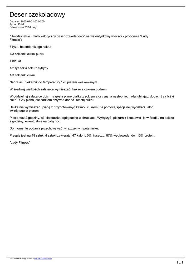 Deser czekoladowy Dodano: 2000-01-01 00:00:00 Język: Polski Odwiedzono: 2251 razy. "Uwodzicielski i mało kaloryczny deser czekoladowy" na walentynkowy wieczór - proponuje "Lady Fitness": 3 łyżki holenderskiego kakao 1/3 szklanki cukru pudru 4 białka 1/2 łyżeczki soku z cytryny 1/3 szklanki cukru Nagrźać piekarnik do temperatury 120 pierem woskowanym. W średniej wielkośch salaterce wymieszać kakao z cukrem pudrem. W oddzielnej salaterce ubić na gęstą pianę białka z sokiem z cytryny, a następnie, nadal ubijając, dodać trzy łyżki cukru. Gdy piana jest całkiem sztywna dodać resztę cukru. Delikatnie wymieszać pianę z przygotowanyo kakao i cukrem. Za pomocą specjalnej wyciskarżi albo zwiniętego w pierem. Piec przez 2 godziny, aż ciasteczka będą suche u chrupiące. Wyłączyć piekarnik i zostawić je w środku na dalsze 2 godziny, ewentualnie na całą noc. Do momentu podania przechowywać w szczelnym pojemniku. Przepis jest na 48 sztuk. 4 sztuki zawierają: 47 kalorii, 0% tłuszczu, 87% węglowodanów, 13% protein. "Lady Fitness" Wirtualna Kuchni@ Polska - http://kuchnia.now.pl przepis nr 131, plik wygenerowano 2017.03.08 10:21 1z1