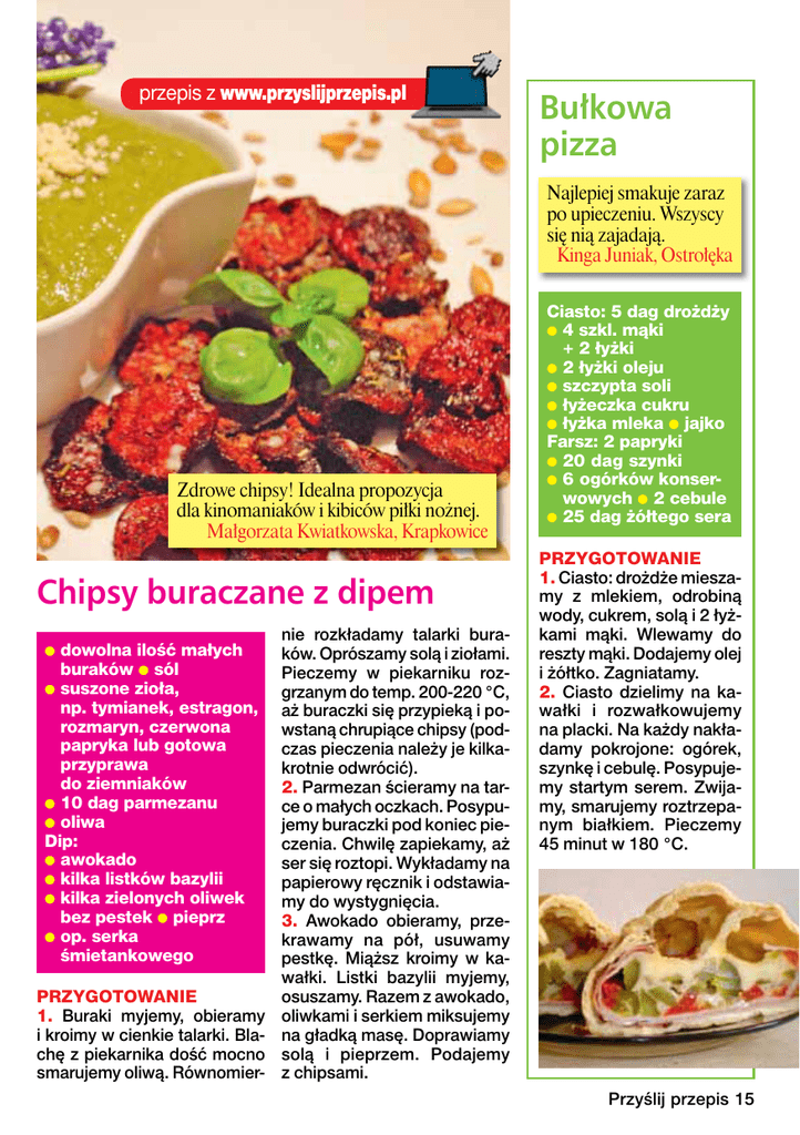 przepis z www.przyslijprzepis.pl Bułkowa pizza Najlepiej smakuje zaraz po upieczeniu. Wszyscy się nią zajadają. Kinga Juniak, Ostrołęka Zdrowe chipsy! Idealna propozycja dla kinomaniaków i kibiców piłki nożnej. Małgorzata Kwiatkowska, Krapkowice Chipsy buraczane z dipem dowolna ilość małych buraków ● sól ● suszone zioła, np. tymianek, estragon, rozmaryn, czerwona papryka lub gotowa przyprawa do ziemniaków ● 10 dag parmezanu ● oliwa Dip: ● awokado ● kilka listków bazylii ● kilka zielonych oliwek bez pestek ● pieprz ● op. serka śmietankowego ● PRZYGOTOWANIE 1. Buraki myjemy, obieramy i kroimy w cienkie talarki. Blachę z piekarnika dość mocno smarujemy oliwą. Równomier- nie rozkładamy talarki buraków. Oprószamy solą i ziołami. Pieczemy w piekarniku rozgrzanym do temp. 200-220 °C, aż buraczki się przypieką i powstaną chrupiące chipsy (podczas pieczenia należy je kilkakrotnie odwrócić). 2. Parmezan ścieramy na tarce o małych oczkach. Posypujemy buraczki pod koniec pieczenia. Chwilę zapiekamy, aż ser się roztopi. Wykładamy na papierowy ręcznik i odstawiamy do wystygnięcia. 3. Awokado obieramy, przekrawamy na pół, usuwamy pestkę. Miąższ kroimy w kawałki. Listki bazylii myjemy, osuszamy. Razem z awokado, oliwkami i serkiem miksujemy na gładką masę. Doprawiamy solą i pieprzem. Podajemy z chipsami. Ciasto: 5 dag drożdży ● 4 szkl. mąki + 2 łyżki ● 2 łyżki oleju ● szczypta soli ● łyżeczka cukru ● łyżka mleka ● jajko Farsz: 2 papryki ● 20 dag szynki ● 6 ogórków konserwowych ● 2 cebule ● 25 dag żółtego sera PRZYGOTOWANIE 1. Ciasto: drożdże mieszamy z mlekiem, odrobiną wody, cukrem, solą i 2 łyżkami mąki. Wlewamy do reszty mąki. Dodajemy olej i żółtko. Zagniatamy. 2. Ciasto dzielimy na kawałki i rozwałkowujemy na placki. Na każdy nakładamy pokrojone: ogórek, szynkę i cebulę. Posypujemy startym serem. Zwijamy, smarujemy roztrzepanym białkiem. Pieczemy 45 minut w 180 °C. Przyślij przepis 15