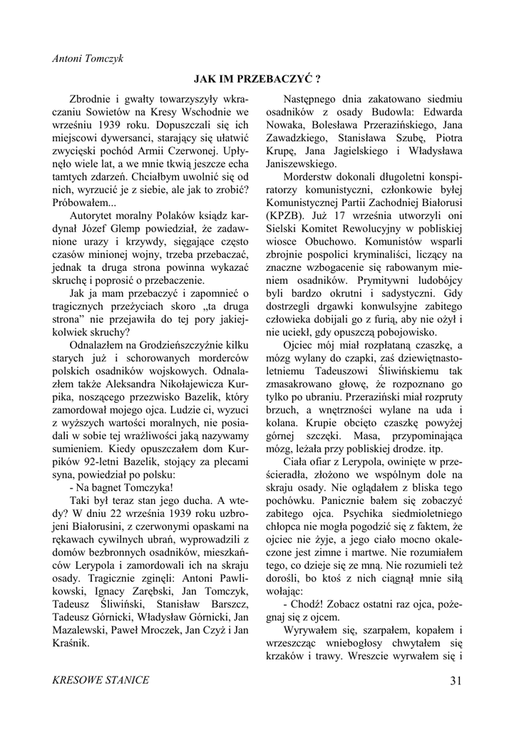 Antoni Tomczyk JAK IM PRZEBACZYĆ ? Zbrodnie i gwałty towarzyszyły wkraczaniu Sowietów na Kresy Wschodnie we wrześniu 1939 roku. Dopuszczali się ich miejscowi dywersanci, starający się ułatwić zwycięski pochód Armii Czerwonej. Upłynęło wiele lat, a we mnie tkwią jeszcze echa tamtych zdarzeń. Chciałbym uwolnić się od nich, wyrzucić je z siebie, ale jak to zrobić? Próbowałem... Autorytet moralny Polaków ksiądz kardynał Józef Glemp powiedział, że zadawnione urazy i krzywdy, sięgające często czasów minionej wojny, trzeba przebaczać, jednak ta druga strona powinna wykazać skruchę i poprosić o przebaczenie. Jak ja mam przebaczyć i zapomnieć o tragicznych przeżyciach skoro „ta druga strona” nie przejawiła do tej pory jakiejkolwiek skruchy? Odnalazłem na Grodzieńszczyźnie kilku starych już i schorowanych morderców polskich osadników wojskowych. Odnalazłem także Aleksandra Nikołajewicza Kurpika, noszącego przezwisko Bazelik, który zamordował mojego ojca. Ludzie ci, wyzuci z wyższych wartości moralnych, nie posiadali w sobie tej wrażliwości jaką nazywamy sumieniem. Kiedy opuszczałem dom Kurpików 92-letni Bazelik, stojący za plecami syna, powiedział po polsku: - Na bagnet Tomczyka! Taki był teraz stan jego ducha. A wtedy? W dniu 22 września 1939 roku uzbrojeni Białorusini, z czerwonymi opaskami na rękawach cywilnych ubrań, wyprowadzili z domów bezbronnych osadników, mieszkańców Lerypola i zamordowali ich na skraju osady. Tragicznie zginęli: Antoni Pawlikowski, Ignacy Zarębski, Jan Tomczyk, Tadeusz Śliwiński, Stanisław Barszcz, Tadeusz Górnicki, Władysław Górnicki, Jan Mazalewski, Paweł Mroczek, Jan Czyż i Jan Kraśnik. KRESOWE STANICE Następnego dnia zakatowano siedmiu osadników z osady Budowla: Edwarda Nowaka, Bolesława Przerazińskiego, Jana Zawadzkiego, Stanisława Szubę, Piotra Krupę, Jana Jagielskiego i Władysława Janiszewskiego. Morderstw dokonali długoletni konspiratorzy komunistyczni, członkowie byłej Komunistycznej Partii Zachodniej Białorusi (KPZB). Już 17 września utworzyli oni Sielski Komitet Rewolucyjny w pobliskiej wiosce Obuchowo. Komunistów wsparli zbrojnie pospolici kryminaliści, liczący na znaczne wzbogacenie się rabowanym mieniem osadników. Prymitywni ludobójcy byli bardzo okrutni i sadystyczni. Gdy dostrzegli drgawki konwulsyjne zabitego człowieka dobijali go z furią, aby nie ożył i nie uciekł, gdy opuszczą pobojowisko. Ojciec mój miał rozpłataną czaszkę, a mózg wylany do czapki, zaś dziewiętnastoletniemu Tadeuszowi Śliwińskiemu tak zmasakrowano głowę, że rozpoznano go tylko po ubraniu. Przeraziński miał rozpruty brzuch, a wnętrzności wylane na uda i kolana. Krupie obcięto czaszkę powyżej górnej szczęki. Masa, przypominająca mózg, leżała przy pobliskiej drodze. itp. Ciała ofiar z Lerypola, owinięte w prześcieradła, złożono we wspólnym dole na skraju osady. Nie oglądałem z bliska tego pochówku. Panicznie bałem się zobaczyć zabitego ojca. Psychika siedmioletniego chłopca nie mogła pogodzić się z faktem, że ojciec nie żyje, a jego ciało mocno okaleczone jest zimne i martwe. Nie rozumiałem tego, co dzieje się ze mną. Nie rozumieli też dorośli, bo ktoś z nich ciągnął mnie siłą wołając: - Chodź! Zobacz ostatni raz ojca, pożegnaj się z ojcem. Wyrywałem się, szarpałem, kopałem i wrzeszcząc wniebogłosy chwytałem się krzaków i trawy. Wreszcie wyrwałem się i 31 uciekłem w ustronne miejsce, gdzie długi płacz rozładował napięcie wewnętrzne i uspokoił mnie trochę. Uratowałem wspomnienie ojca takie, jakim był, gdy brał mnie na kolana. Jednak w mojej psychice nastąpiło jakieś przeciążenie emocji, bo przez kilka następnych miesięcy nawiedzały mnie koszmarne sny. W snach przeżywałem sceny mordowania ojca i naszej całej rodziny. Było to tak silne, że nawet przy zapalonym świetle nie mogłem rozpoznać uspakajającej mnie mamy i powstrzymać płaczu. Komunistyczni zwycięzcy nieustannie demonstrowali swoją obecność i rewolucyjną władzę. Nie tylko jawnie plądrowali i grabili domy osadników, ale też systematycznie profanowali miejsce pochówku swoich ofiar. Bywało tak, że jednego dnia gromadką dzieci przystroiliśmy mogiłę kwiatami z przydomowych ogródków, a nazajutrz znajdowaliśmy mogiłę zadeptaną, a kwiaty rozrzucone między otaczające krzaki. Po pierwszej deportacji, gdy wywieziono na Sybir rodziny osadników, spiłowano wysoki drewniany krzyż, a mogiłę skazano na zagładę i wieczne zapomnienie. Jesienią 1939 roku, wraz z mamą i bratem Lucjanem, uciekliśmy do Kowla. Tu, w gąszczu polskiej ludności miejskiej, znaleźliśmy życzliwą pomoc i w miarę bezpieczne schronienie. Jednak ukrywanie się w mieście bez środków do życia, w nieustannej obawie przed aresztowaniem i deportacją, było bardzo uciążliwe. Oprócz pospolitej biedy codziennie przeżywałem upokorzenia, gdy publicznie naśmiewano się z Polski i Polaków, kiedy w gazetach zamieszczano ohydne karykatury generałów i dostojników państwowych, a sołdaci śpiewali: - „Becki prodały Polszu...” Niektóre dzieci na ulicy, przenosząc rozmowy i nastroje rodziców, zaczepiały mnie. - Ty polskaja morda! Ja tiebie nożykom zareżu! 32 Mrok zwątpienia i rozpaczy ogarniał nas coraz bardziej. Czasem nocą budził mnie tłumiony szloch mamy, wyczerpanej beznadziejną walką o przeżycie każdego dnia. Bardzo chciałem pomóc jej, pocieszyć, ale czego mógł dokonać mały, wymizerowany chłopiec? Sowiecka brutalna przemoc nie dawała nam żadnych szans, nie znała litości, ani współczucia. Zapiekał się we mnie bunt przeciw tej krzywdzie jaka spotykała nas po najeździe Sowietów. Przysięgałem sobie, że kiedyś, jak przeżyję zły czas i będę silny, to upomnę się o sprawiedliwość, a może nawet sam ją wymierzę. Rozmyślania o wyrównaniu rachunków za doznane krzywdy przynosiły 