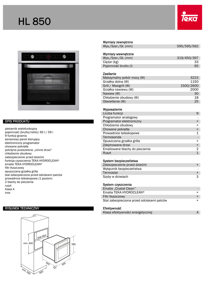 HL 850 Wymiary zewnętrzne Wys./Szer./Gł. (mm) 595/595/562 Wymiary wewnętrzne Wys./Szer./Gł. (mm) Ciężar (kg) Pojemność brutto (l) 319/450/397 33 65 Zasilanie Maksymalny pobór mocy (W) Grzałka dolna (W) Grill / Maxigrill (W) Grzałka nawiewu (W) Nawiew (W) Chłodzenie obudowy (W) Oświetlenie (W) OPIS PRODUKTU piekarnik wielofunkcyjny pojemność (brutto/netto): 65 l / 59 l 9 funkcji grzania sensorowy panel sterujący elektroniczny programator chowane pokrętła potrójnie przeszklone „zimne drzwi” chłodzenie obudowy zabezpieczenie przed dziećmi funkcja czyszczenia TEKA HYDROCLEAN® emalia TEKA HYDROCLEAN® filtr tłuszczowy opuszczana grzałka grilla stal zabezpieczona przed odciskami palców prowadnice teleskopowe (1 poziom) 2 blachy do pieczenia ruszt klasa A inox RYSUNEK TECHNICZNY 3223 1150 1500/2600 2000 30 18 25 Wyposażenie Liczba funkcji Programator analogowy Programator elektroniczny Chłodzenie obudowy Chowane pokrętła Prowadnice teleskopowe Termosonda Opuszczana grzałka grilla Zdejmowane drzwi Emaliowane blachy do pieczenia Ruszt 9 + + + 1 + + 2 1 System bezpieczeństwa Zabezpieczenie przed dziećmi Wyłącznik bezpieczeństwa Termostat Szyby w drzwiach + + 3 System czyszczenia Emalia „Crystal Clean” Emalia TEKA HYDROCLEAN® Filtr tłuszczowy Stal zabezpieczona przed odciskami palców + + + Efektywność Klasa efektywności energetycznej A