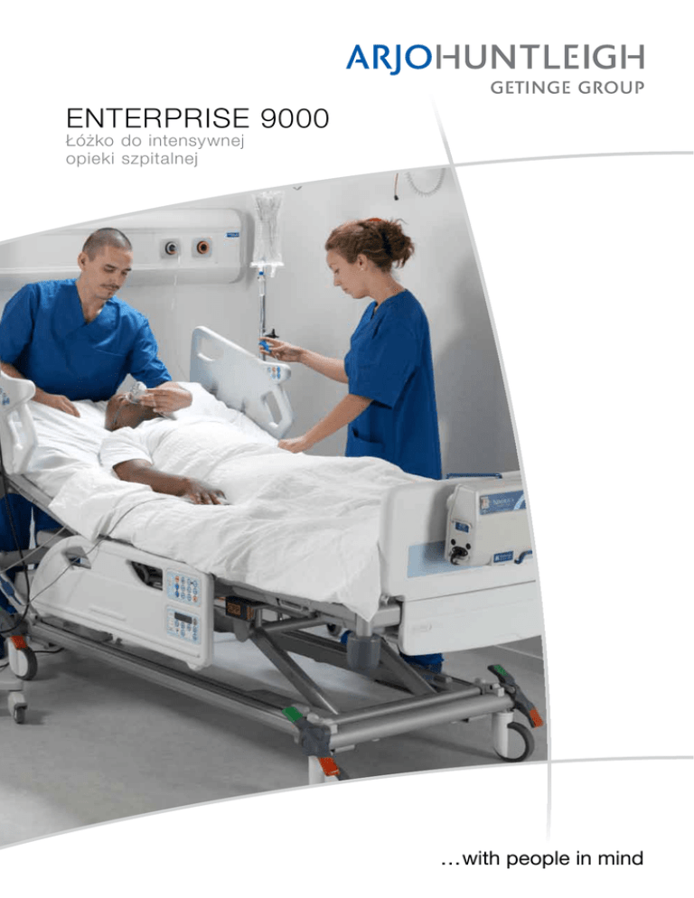 ENTERPRISE 9000 Łóżko do intensywnej opieki szpitalnej … with people in mind STWORZONE DO OPIEKI NAD PACJENTEM ŁÓŻKO, NA KTÓRYM MOŻNA POLEGAĆ Potrzeby pacjentów intensywnej opieki są złożone i stanowią wyzwanie. To dlatego niezbędne jest najnowocześniejsze łóżko szpitalne o następujących cechach: • Całkowita niezawodność • Łatwość użytkowania • Szybka regulacja podczas działań ratunkowych • Możliwość ustawiania bez wysiłku pozycji pacjenta dla potrzeb klinicznych i fizjologicznych • Możliwość stałego, dokładnego kontrolowania masy ciała • Zapewnienie bezpieczeństwa opiekunom i pacjentom • Prostota czyszczenia dla zmniejszenia ryzyka zakażeń • Łatwość konserwacji i serwisowania Łóżko Enterprise® 9000 z opatentowanym system profilowania, zintegrowaną wagą, sygnalizacją wyjścia pacjenta z łóżka oraz czujnikami antyzgnieceniowymi pod łóżkiem, zostało zaprojektowane specjalnie z myślą o powyższych potrzebach. Oznacza to możliwość zapewnienia najlepszej opieki – skutecznej, konsekwentnej i bezpiecznej. Jak zmniejszyć ryzyko? Zarządzanie ryzykiem jest aktualnie dla szpitali bardzo ważną kwestią. Łóżko Enterprise 9000 zostało zaprojektowane tak, aby zminimalizować zagrożenia związane z łóżkami szpitalnymi: : Upadki Niezwykle mała odległość platformy łóżka od podłogi, wynosząca w najniższym położeniu zaledwie 300 mm, jest podstawową zaletą redukującą ryzyko obrażeń przy upadku. Oświetlenie pod łóżkiem pomaga zmniejszyć zagrożenie upadkiem w nocy. Sygnalizacja wyjścia pacjenta z łóżka, jeśli jest włączona, alarmuje personel medyczny, gdy pacjent opuści łóżko. Odleżyny Opatentowany system profilowania Bio-Contour® stanowi unikalne połączenie zakrzywionej platformy materaca z ruchami segmentów łóżka. Udowodniono, że ten system w porównaiu z systemami w innych łóżkach szpitalnych zmniejsza nacisk na przylegające powierzchnie. Kontrola zakażeń Łóżko Enterprise 9000 zostało zaprojektowane tak, aby było to najłatwiejsze do czyszczenia i odkażania łóżko na świecie. Przemieszczanie i obsługa Łóżko Enterprise 9000 jest lekkie i łatwe do manewrowania. Jego bezpieczne obciążenie robocze wynosi 250 kg, co oznacza możliwość umieszczenia cięższych pacjentów. Przygniecenie Łóżko wyposażone jest w system antyzgnieceniowy, który wykrywa obiekty pod łóżkiem, zmniejszając w ten sposób ryzyko przygniecenia. Ryzyko przygniecenia jest minimalizowane także dzięki konstrukcji barierek bocznych. Mapy nacisku (łóżka w pełni wyprofilowane) Standard Bed Enterprise Nacisk na przylegające powierzchnie Niski Wysoki Zapobiegaj problemom zanim się pojawią Prostota, inteligencja… Zintegrowana waga Łóżko Enterprise 9000 jest w pełni wyposażonym, elektrycznie profilowanym łóżkiem ze zintegrowaną, łatwą w obsłudze wagą. Umożliwia ona ważenie do 250 kg z dokładnością do ± 500 g. Ważenie można przeprowadzać w dowolnym ustawieniu łóżka, a mechanizm autokompensacji umożliwia dodawanie i odejmowanie obiektów bez wpływania na odczyt masy pacjenta. Czujniki antyzgnieceniowe pod łóżkiem Sygnalizacja wyjścia z łóżka Sygnalizacja wyjścia pacjenta z łóżka, jeśli jest włączona, alarmuje sygnałem akustycznym personel medyczny, gdy pacjent opuści łóżko.. System antyzgnieceniowy Czujniki antyzgnieceniowe wykrywają obiekt/osobę pod łóżkiem. Łóżko automatycznie zatrzymuje obniżanie do chwili, gdy przeszkoda zostanie usunięta, w ten sposób redukując ryzyko przygniecenia pacjenta, personelu lub sprzętu. …i bezpieczeństwo KONSTRUKCJA DZIEŁEM SZTUKI INŻYNIERII Każdy element łóżka Enterprise 9000 został zbudowany z myślą o prostocie serwisowania, długiej żywotności i łatwości użycia. Łóżko wymaga minimum konserwacji i jest zaprojektowane na lata bezawaryjnego użytkowania. Trwałość Pomimo swojej lekkości łóżko jest bardzo mocne i trwałe. Podłączane panele sterowania Panele z przyciskami dla personelu i pacjenta są zbudowane tak, aby po prostu włożyć je w gniazdo, zatrzasnąć, a następnie używać. Dzięki temu wymiana i konserwacja są wyjątkowo szybkie i łatwe. Modelowane elementy plastikowe Przedni i tylny panel, platforma materaca oraz składane barierki boczne wykonane są z tworzyw sztucznych formowanych rozdmuchowo. Są one łatwe w czyszczeniu, lekkie i bardzo odporne. Serwisowanie Zaprojektowane do szybkiej obsługi (ang. „pit stop”) – otwarty dostęp oznacza, że wymiana siłownika, panelu sterowania czy, akumulatora może być przeprowadzona na miejscu, w ciągu kilku minut, przez jedną osobę. CHCIAŁBYŚ, ABY PEWNE RZECZY BYŁY MNIEJ SKOMPLIKOWANE? Łóżko szpitalne powinno być jak najbardziej przyjazne dla użytkownika, tak aby można było skoncentrować się na najważniejszym zadaniu, jakim jest opieka nad pacjentem. Przyciski sterowania łóżka Enterprise 9000 są intuicyjne, bardzo proste w użyciu a nauka ich obsługi szybka. Usytuowanie paneli sterowania Wszystkie panele sterowania znajdują się w miejscach zapewniających łatwy dostęp. Panel sterowania dla pacjenta znajdujący się na składanej barierce bocznej został zaprojektowany tak, by pozostawał w tym samym położeniu względem pacjenta niezależnie od ustawienia kąta oparcia. Funkcja Auto-contour Pojedynczy przycisk Auto-contour powoduje ułożenie pacjenta w doskonałej pozycji krzesla, w najniższej pozycji łóżka. Opiekun może wybrać, czy podczas profilowania łóżka część podtrzymująca podudzia ma być uniesiona, czy obniżona. Blokady Opiekun, w zależności od potrzeb, może wybrać wyłączenie niektórych lub wszystkich funkcji łóżka. Funkcja CPR Płaską pozycję CPR można szybko uzyskać, naciskając jeden przycisk pilota opiekuna lub pociągając za jedną z dźwigni CPR znajdujących się po obu stronach łóżka. Waga Przyciski sterujące zint