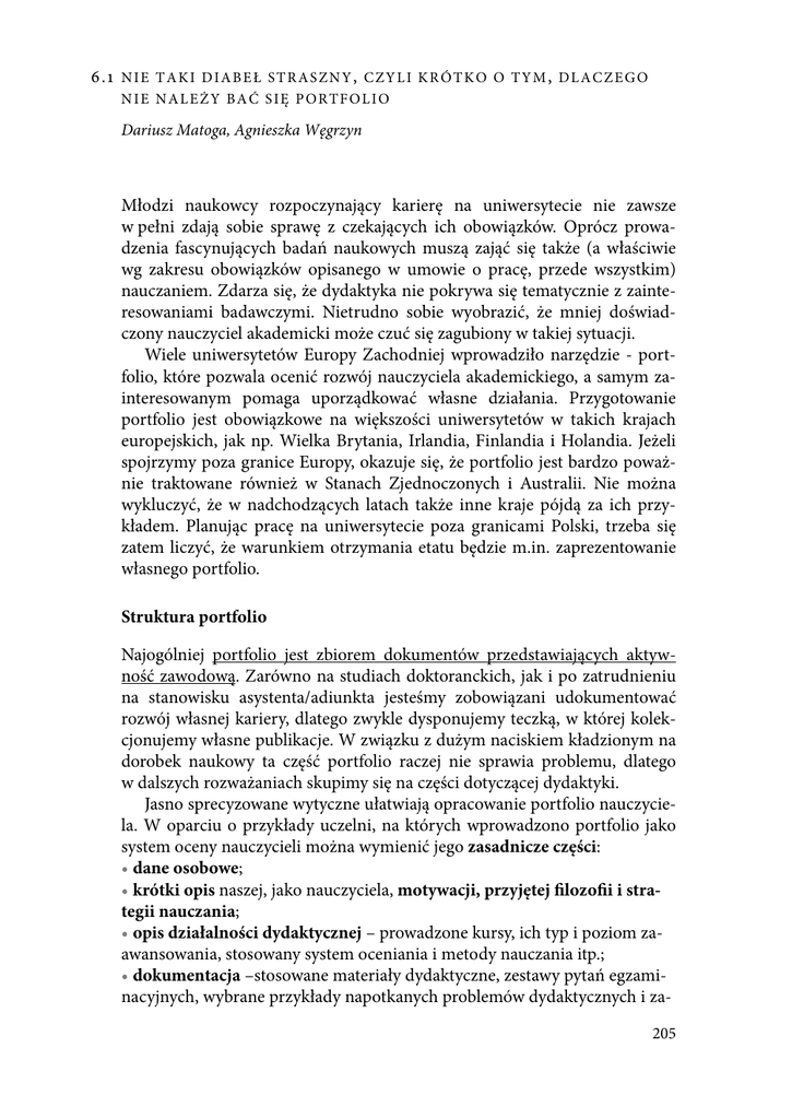 6.1 N I E T A K I D I A B E Ł S T R A S Z N Y , C Z Y L I K R Ó T K O O T Y M , D L A C Z E G O NIE NALEŻY BAĆ SIĘ PORTFOLIO Dariusz Matoga, Agnieszka Węgrzyn Młodzi naukowcy rozpoczynający karierę na uniwersytecie nie zawsze w pełni zdają sobie sprawę z czekających ich obowiązków. Oprócz prowadzenia fascynujących badań naukowych muszą zająć się także (a właściwie wg zakresu obowiązków opisanego w umowie o pracę, przede wszystkim) nauczaniem. Zdarza się, że dydaktyka nie pokrywa się tematycznie z zainteresowaniami badawczymi. Nietrudno sobie wyobrazić, że mniej doświadczony nauczyciel akademicki może czuć się zagubiony w takiej sytuacji. Wiele uniwersytetów Europy Zachodniej wprowadziło narzędzie - portfolio, które pozwala ocenić rozwój nauczyciela akademickiego, a samym zainteresowanym pomaga uporządkować własne działania. Przygotowanie portfolio jest obowiązkowe na większości uniwersytetów w takich krajach europejskich, jak np. Wielka Brytania, Irlandia, Finlandia i Holandia. Jeżeli spojrzymy poza granice Europy, okazuje się, że portfolio jest bardzo poważnie traktowane również w Stanach Zjednoczonych i Australii. Nie można wykluczyć, że w nadchodzących latach także inne kraje pójdą za ich przykładem. Planując pracę na uniwersytecie poza granicami Polski, trzeba się zatem liczyć, że warunkiem otrzymania etatu będzie m.in. zaprezentowanie własnego portfolio. Struktura portfolio Najogólniej portfolio jest zbiorem dokumentów przedstawiających aktywność zawodową. Zarówno na studiach doktoranckich, jak i po zatrudnieniu na stanowisku asystenta/adiunkta jesteśmy zobowiązani udokumentować rozwój własnej kariery, dlatego zwykle dysponujemy teczką, w której kolekcjonujemy własne publikacje. W związku z dużym naciskiem kładzionym na dorobek naukowy ta część portfolio raczej nie sprawia problemu, dlatego w dalszych rozważaniach skupimy się na części dotyczącej dydaktyki. Jasno sprecyzowane wytyczne ułatwiają opracowanie portfolio nauczyciela. W oparciu o przykłady uczelni, na których wprowadzono portfolio jako system oceny nauczycieli można wymienić jego zasadnicze części: • dane osobowe; • krótki opis naszej, jako nauczyciela, motywacji, przyjętej filozofii i strategii nauczania; • opis działalności dydaktycznej – prowadzone kursy, ich typ i poziom zaawansowania, stosowany system oceniania i metody nauczania itp.; • dokumentacja –stosowane materiały dydaktyczne, zestawy pytań egzaminacyjnych, wybrane przykłady napotkanych problemów dydaktycznych i za205 stosowanych rozwiązań itp.; • wyniki ewaluacji – samoocena, opinie kolegów, ankiety studenckie; • plan rozwoju zawodowego, zamierzone innowacje. Stosowanie elektronicznego systemu gromadzenia danych lub wręcz tworzenie portfolio bezpośrednio przy użyciu specjalnego oprogramowania, ułatwia zarówno przygotowanie takiego dokumentu, jak i jego ewaluację. Przykład platformy elektronicznej do tworzenia portfolio można znaleźć na stronie Uniwersytetu Newcastle (http://www.eportfolios.ac.uk/). Choć na pierwszy rzut oka może się wydawać, że przygotowanie portfolio wymaga ogromnego nakładu pracy, spróbujmy przyjrzeć się naszym codziennym działaniom. Opis prowadzonych kursów i ich dokumentacja W częściach portfolio dotyczących prowadzonych zajęć oraz ich dokumentacji, jak wspomniano wcześniej, umieścić można wszelkiego rodzaju załączniki, którym mogą być wydruki slajdów, kopie instrukcji, zestawy pytań sprawdzających wiedzę studentów, przykładowe raporty studenckie z wystawionymi przez nas ocenami i dołączonym komentarzem, a nawet opracowane strony internetowe, komentarze z blogów i materiały audiowizualne. Zwykle każdy z nas posiada chociaż część z tych materiałów: zestaw instrukcji, materiały do wykładów, prezentacje itp. Od indywidualnego zaangażowania zależy, co jeszcze uda nam się zgromadzić. Ewaluacja Ewaluacja jest bardzo istotną częścią portfolio, ponieważ powstaje na podstawie refleksji nad: • przygotowaniem merytorycznym, czyli zakresem wiedzy, która potrzebna jest nam do nauczania danej dyscypliny na odpowiednim poziomie; • przygotowaniem dydaktycznym, czyli umiejętnością przekazywania wiedzy; • umiejętnościami organizacyjnymi – projektowanie i koordynacja kursów, komunikacja ze studentami; • podnoszeniem jakości nauczania poprzez łączenie badań naukowych i dydaktyki, wprowadzanie innowacji. W praktyce, podczas przygotowywania się do zajęć, niektórzy mają zwyczaj sporządzać „konspekty” z najistotniejszymi zagadnieniami do przekazania lub planem wykładu. Samoocena może być prosto przeprowadzona poprzez przeanalizowanie i zapisanie wniosków dotyczących realizacji tematu, organizacji zajęć, problemów jakie się pojawiły oraz jak zostały rozwiązane. Niezwykle cenne jest korzystanie z opinii studentów, można także poprosić o pomoc bardziej doświadczonych kolegów, którzy ocenią naszą pracę obiektywnie, a swoje uwagi przedstawią „na piśmie”. 206 Podczas prowadzenia zajęć, zwłaszcza natrafiając na problemy, często w notatkach na marginesie zaznaczamy tego nie robić nigdy więcej!, zmienić… itd. Na użytek portfolio wystarczy przekształcić „notatki na marginesie” w spójny tekst i umieścić w rozdziale dotyczącym własnych spostrzeżeń na temat organizacji pracy, realizacji tematu lub planów dotyczących poprawy efektywności i skuteczności nauczania. Przeanalizowanie zakresu wykładanego materiału i odpowiedzi zwrotnej ze strony studentów przynosi korzyści również prowadzącemu – poprzez zmniejszenie nakładu czasu i pracy podczas kolejnych zajęć. Oczywiste jest, że niniejszy artykuł nie wyczerpuje tematu portfolio a jedynie porusza wybrane jego aspekty. Na zakończenie podajemy kilka wskazówek, które mogą pozytywnie wpłynąć na odbiór przygotowanego przez nas port