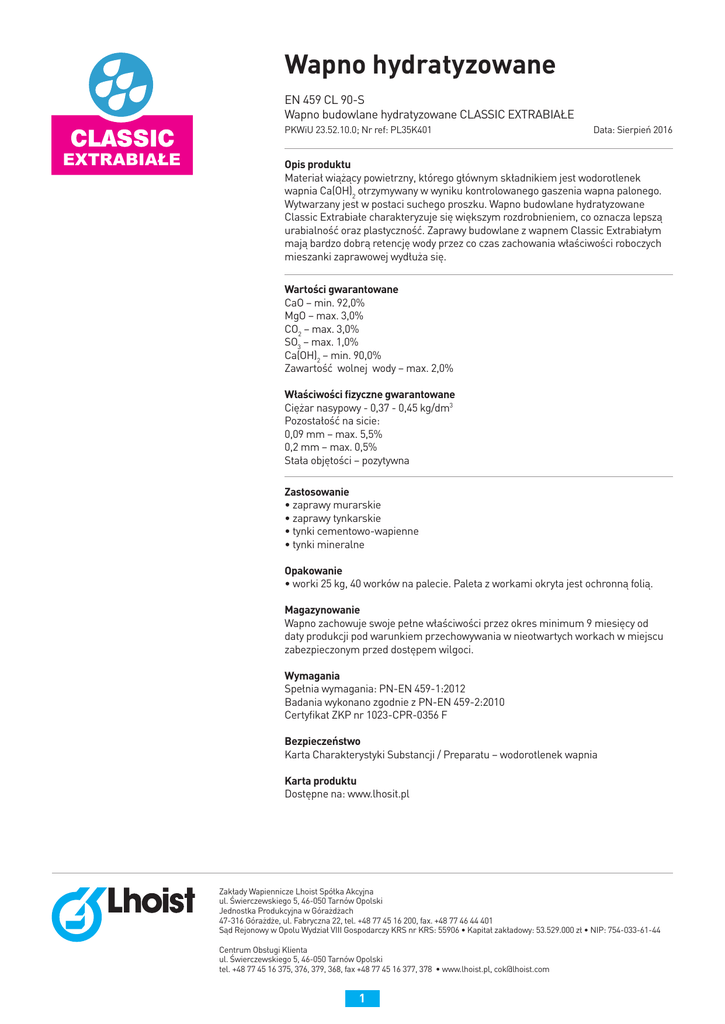 Wapno hydratyzowane EN 459 CL 90-S Wapno budowlane hydratyzowane CLASSIC EXTRABIAŁE PKWiU 23.52.10.0; Nr ref: PL35K401 EXTRABIAŁE Data: Sierpień 2016 Opis produktu Materiał wiążący powietrzny, którego głównym składnikiem jest wodorotlenek wapnia Ca(OH)2 otrzymywany w wyniku kontrolowanego gaszenia wapna palonego. Wytwarzany jest w postaci suchego proszku. Wapno budowlane hydratyzowane Classic Extrabiałe charakteryzuje się większym rozdrobnieniem, co oznacza lepszą urabialność oraz plastyczność. Zaprawy budowlane z wapnem Classic Extrabiałym mają bardzo dobrą retencję wody przez co czas zachowania właściwości roboczych mieszanki zaprawowej wydłuża się. Wartości gwarantowane CaO – min. 92,0% MgO – max. 3,0% CO2 – max. 3,0% SO3 – max. 1,0% Ca(OH)2 – min. 90,0% Zawartość wolnej wody – max. 2,0% Właściwości fizyczne gwarantowane Ciężar nasypowy - 0,37 - 0,45 kg/dm3 Pozostałość na sicie: 0,09 mm – max. 5,5% 0,2 mm – max. 0,5% Stała objętości – pozytywna Zastosowanie • zaprawy murarskie • zaprawy tynkarskie • tynki cementowo-wapienne • tynki mineralne Opakowanie • worki 25 kg, 40 worków na palecie. Paleta z workami okryta jest ochronną folią. Magazynowanie Wapno zachowuje swoje pełne właściwości przez okres minimum 9 miesięcy od daty produkcji pod warunkiem przechowywania w nieotwartych workach w miejscu zabezpieczonym przed dostępem wilgoci. Wymagania Spełnia wymagania: PN-EN 459-1:2012 Badania wykonano zgodnie z PN-EN 459-2:2010 Certyfikat ZKP nr 1023-CPR-0356 F Bezpieczeństwo Karta Charakterystyki Substancji / Preparatu – wodorotlenek wapnia Karta produktu Dostępne na: www.lhosit.pl Zakłady Wapiennicze Lhoist Spółka Akcyjna ul. Świerczewskiego 5, 46-050 Tarnów Opolski Jednostka Produkcyjna w Górażdżach 47-316 Górażdże, ul. Fabryczna 22, tel. +48 77 45 16 200, fax. +48 77 46 44 401 Sąd Rejonowy w Opolu Wydział VIII Gospodarczy KRS nr KRS: 55906 • Kapitał zakładowy: 53.529.000 zł • NIP: 754-033-61-44 Centrum Obsługi Klienta ul. Świerczewskiego 5, 46-050 Tarnów Opolski tel. +48 77 45 16 375, 376, 379, 368, fax +48 77 45 16 377, 378 • www.lhoist.pl, [email protected] 1 Wapno hydratyzowane Wapno hydratyzowane EN 459 CL 90-S ENWapno 459 CL 90-S budowlane hydratyzowane „SUPERBIAŁE” Wapno budowlane PKWiU 23.52.10.0;hydratyzowane Nr ref: PL21K183„CLASSIC EXTRABIAŁE” PKWiU Nr ref: PL35K401 Data:23.52.10.0; Styczeń 2016 Data: Sierpień 2016 Wapno hydratyzowane EN 459 CL 90-S EXTRABIAŁE Wapno budowlane hydratyzowane „SUPERBIAŁE” Rola wapna Extrabiałego w zaprawach Rola wapna Superbiałego w zaprawach Dzięki unikatowej kamienia i najnowszej technologii produkcji, wapno Właściwości zapraw tynkarskichPKWiU 23.52.10.0; Nrjakości ref: PL21K183 Dzięki jakości kamienia i najnowszej technologii wapno hydratyzowane Extrabiałe cechuje się wyjątkową białościąprodukcji, i wydajnością. Data: Styczeńunikatowej 2016Classic hydratyzowane Superbiałe cechuje sięmurarskie wyjątkowąi tynkarskie białością i wydajnością. Dzięki Dzięki tym cechom wytwarzane zaprawy charakteryzuje jasna barwa oraz niski koszt wytworzenia. tym cechom wytwarzane zaprawy murarskie i tynkarskie charakteryzuje jasna barwa oraz niski koszt wytworzenia. • Wapno Classic Extrabiałe charakteryzuje się wysokim współczynnikiem Rola wapna Superbiałego zaprawach Właściwości zapraw tynkarskich właściwejw cząstek oraz wyróżnia się stopniem białości Rd.powierzchni Parametry powierzchni Wapno Superbiałe charakteryzuje się wysokim współczynnikiem Dzięki teunikatowej jakości kamienia najnowszej technologii produkcji, wapno bardzo korzystnie wpływają na iwłaściwości zapraw tynkarskich. Tynki te z użyciem właściwej cząstek oraz wyróżnia się stopniem białości Rd. Parametry bardzo hydratyzowane Superbiałe cechuje się wyjątkową białością i wydajnością. wapna Classic Extrabiałego charakteryzują dużą wydajnością, korzystnie wpływają na właściwości zaprawsię tynkarskich. Tynki z elastycznością użyciemDzięki wapna Wodożądność tym cechom wytwarzane zaprawy murarskie charakteryzuje oraz wysoką przyczepnością dosię podłoża. Superbiałego charakteryzują dużąi tynkarskie wydajnością, elastycznościąjasna orazbarwa wysoką oraz niski kosztstopień wytworzenia. • Wprzyczepnością ysoki białości Rd pozwala uzyskać tynki o wyjątkowo jasnej barwie. do podłoża. Retencja Stopień wody białości wykonane Extrabiałego Tynki Wysoki stopieńz wapna białościClassic Rd pozwala uzyskaćz białym tynki o cementem wyjątkowo pozwalają jasnej barwie. zminimalizować koszty ścian. Wapno Superbiałe charakteryzuje się wysokim zwspółczynnikiem powierzchni Tynki wykonane z malowania wapna Superbiałego białym cementem pozwalają Właściwości zapraw murarskich zminimalizować koszty malowania ścian. właściwej cząstek oraz wyróżnia się stopniem białości Rd. Parametry te bardzo Elastyczność Urabilaność Stosowanie bardzo wydajnego wapna Classic Extrabiałego znacznie obniża koszty Stosowanie bardzo wydajnego wapna Superbiałego znacznie obniża koszty korzystnie wpływają na właściwości zapraw tynkarskich. Tynki z użyciem wapna wytworzenia zapraw murarskich i tynkarskich. Dzięki właściwości dużej retencji wytworzenia zapraw murarskich i tynkarskich. Dzięki właściwości dużej retencji Superbiałego charakteryzują się dużą wydajnością, elastycznością oraz wysoką wody podczas przygotowania zaprawa przez długi czas zachowuje swoje właściwości wody podczas przygotowania zaprawa przez długi czas zachowuje swoje przyczepnością do podłoża. Przyczepność Napowietrzenie robocze, a zgromadzona w niej woda służywdoniej procesu wiązania cementu w zaprawie, właściwości robocze, a zgromadzona woda służy do procesu wiązania Wysoki stopień białości Rd pozwala uzyskać tynki o wyjątkowo jasnej barwie. co pozw