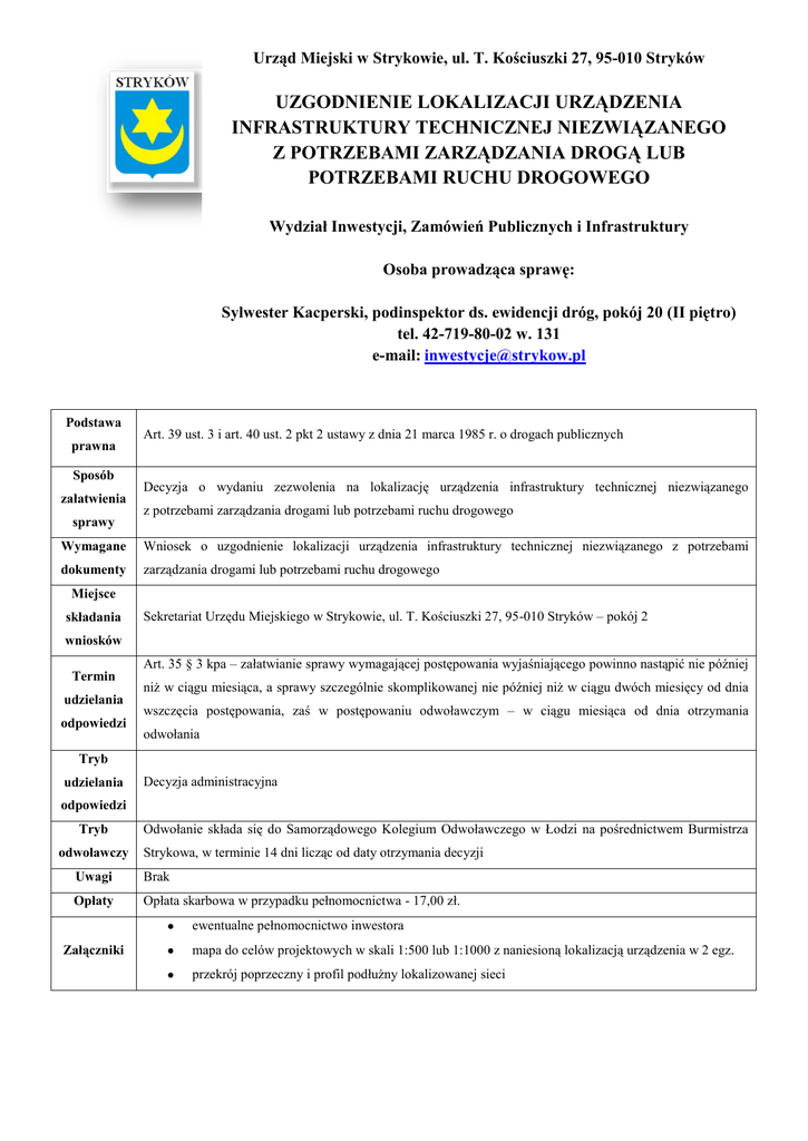 Urząd Miejski w Strykowie, ul. T. Kościuszki 27, 95-010 Stryków UZGODNIENIE LOKALIZACJI URZĄDZENIA INFRASTRUKTURY TECHNICZNEJ NIEZWIĄZANEGO Z POTRZEBAMI ZARZĄDZANIA DROGĄ LUB POTRZEBAMI RUCHU DROGOWEGO Wydział Inwestycji, Zamówień Publicznych i Infrastruktury Osoba prowadząca sprawę: Sylwester Kacperski, podinspektor ds. ewidencji dróg, pokój 20 (II piętro) tel. 42-719-80-02 w. 131 e-mail: [email protected] Podstawa prawna Sposób załatwienia sprawy Art. 39 ust. 3 i art. 40 ust. 2 pkt 2 ustawy z dnia 21 marca 1985 r. o drogach publicznych Decyzja o wydaniu zezwolenia na lokalizację urządzenia infrastruktury technicznej niezwiązanego z potrzebami zarządzania drogami lub potrzebami ruchu drogowego Wymagane Wniosek o uzgodnienie lokalizacji urządzenia infrastruktury technicznej niezwiązanego z potrzebami dokumenty zarządzania drogami lub potrzebami ruchu drogowego Miejsce składania Sekretariat Urzędu Miejskiego w Strykowie, ul. T. Kościuszki 27, 95-010 Stryków – pokój 2 wniosków Termin udzielania odpowiedzi Art. 35 § 3 kpa – załatwianie sprawy wymagającej postępowania wyjaśniającego powinno nastąpić nie później niż w ciągu miesiąca, a sprawy szczególnie skomplikowanej nie później niż w ciągu dwóch miesięcy od dnia wszczęcia postępowania, zaś w postępowaniu odwoławczym – w ciągu miesiąca od dnia otrzymania odwołania Tryb udzielania Decyzja administracyjna odpowiedzi Tryb odwoławczy Odwołanie składa się do Samorządowego Kolegium Odwoławczego w Łodzi na pośrednictwem Burmistrza Strykowa, w terminie 14 dni licząc od daty otrzymania decyzji Uwagi Brak Opłaty Opłata skarbowa w przypadku pełnomocnictwa - 17,00 zł. ewentualne pełnomocnictwo inwestora Załączniki mapa do celów projektowych w skali 1:500 lub 1:1000 z naniesioną lokalizacją urządzenia w 2 egz. przekrój poprzeczny i profil podłużny lokalizowanej sieci