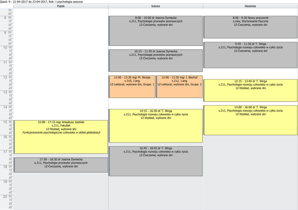Zjazd: 9 - 21-04-2017 do 23-04-2017, Rok: I psychologia zaoczna Piątek 8 9 10 11 12 13 14 15 16 17 18 19 20 30 45 00 15 30 45 00 15 30 45 00 15 30 45 00 15 30 45 00 15 30 45 00 15 30 45 00 15 30 45 00 15 30 45 00 15 30 45 00 15 30 45 00 15 30 45 00 15 30 45 00 15 30 45 Sobota Niedziela 8:00 - 10:00 dr Joanna Dymecka s.211, Psychologia procesów poznawczych 1Z-Ćwiczenia, wybrane dni 8:00 - 9:30 Nowy pracownik s.zew, Wychowanie fizyczne 1Z-Ćwiczenia, wybrane dni 10:15 - 11:45 dr Joanna Dymecka s.211, Psychologia procesów poznawczych 1Z-Ćwiczenia, wybrane dni 12:00 - 13:30 mgr M. Nicieja s.310, J.ang 1Z-Lektorat, wybrane dni, Grupa: 1 12:00 - 13:30 mgr J. Bischof s.212, J.ang 1Z-Lektorat, wybrane dni, Grupa: 2 14:15 - 16:30 dr T. Wirga s.211, Psychologia rozwoju człowieka w cyklu życia 1Z-Wykład, wybrane dni 15:00 - 17:15 mgr Arkadiusz Jasiński s.211, Fakultet 1Z-Wykład, wybrane dni Funkcjonowanie psychologiczne człowieka w dobie globalizacji 16:45 - 18:45 dr T. Wirga s.211, Psychologia rozwoju człowieka w cyklu życia 1Z-Ćwiczenia, wybrane dni 17:30 - 18:30 dr Joanna Dymecka s.211, Psychologia procesów poznawczych 1Z-Ćwiczenia, wybrane dni 9:45 - 11:30 dr T. Wirga s.211, Psychologia rozwoju człowieka w cyklu życia 1Z-Ćwiczenia, wybrane dni 12:15 - 13:45 dr T. Wirga s.211, Psychologia rozwoju człowieka w cyklu życia 1Z-Wykład, wybrane dni 14:00 - 16:00 dr T. Wirga s.211, Psychologia rozwoju człowieka w cyklu życia 1Z-Wykład, wybrane dni