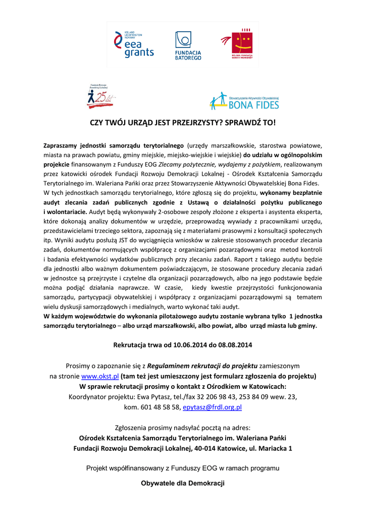 CZY TWÓJ URZĄD JEST PRZEJRZYSTY? SPRAWDŹ TO! Zapraszamy jednostki samorządu terytorialnego (urzędy marszałkowskie, starostwa powiatowe, miasta na prawach powiatu, gminy miejskie, miejsko-wiejskie i wiejskie) do udziału w ogólnopolskim projekcie finansowanym z Funduszy EOG Zlecamy pożytecznie, wydajemy z pożytkiem, realizowanym przez katowicki ośrodek Fundacji Rozwoju Demokracji Lokalnej - Ośrodek Kształcenia Samorządu Terytorialnego im. Waleriana Pańki oraz przez Stowarzyszenie Aktywności Obywatelskiej Bona Fides. W tych jednostkach samorządu terytorialnego, które zgłoszą się do projektu, wykonamy bezpłatnie audyt zlecania zadań publicznych zgodnie z Ustawą o działalności pożytku publicznego i wolontariacie. Audyt będą wykonywały 2-osobowe zespoły złożone z eksperta i asystenta eksperta, które dokonają analizy dokumentów w urzędzie, przeprowadzą wywiady z pracownikami urzędu, przedstawicielami trzeciego sektora, zapoznają się z materiałami prasowymi z konsultacji społecznych itp. Wyniki audytu posłużą JST do wyciągnięcia wniosków w zakresie stosowanych procedur zlecania zadań, dokumentów normujących współpracę z organizacjami pozarządowymi oraz metod kontroli i badania efektywności wydatków publicznych przy zlecaniu zadań. Raport z takiego audytu będzie dla jednostki albo ważnym dokumentem poświadczającym, że stosowane procedury zlecania zadań w jednostce są przejrzyste i czytelne dla organizacji pozarządowych, albo na jego podstawie będzie można podjąć działania naprawcze. W czasie, kiedy kwestie przejrzystości funkcjonowania samorządu, partycypacji obywatelskiej i współpracy z organizacjami pozarządowymi są tematem wielu dyskusji samorządowych i medialnych, warto wykonać taki audyt. W każdym województwie do wykonania pilotażowego audytu zostanie wybrana tylko 1 jednostka samorządu terytorialnego – albo urząd marszałkowski, albo powiat, albo urząd miasta lub gminy. Rekrutacja trwa od 10.06.2014 do 08.08.2014 Prosimy o zapoznanie się z Regulaminem rekrutacji do projektu zamieszonym na stronie www.okst.pl (tam też jest umieszczony jest formularz zgłoszenia do projektu) W sprawie rekrutacji prosimy o kontakt z Ośrodkiem w Katowicach: Koordynator projektu: Ewa Pytasz, tel./fax 32 206 98 43, 253 84 09 wew. 23, kom. 601 48 58 58, [email protected] Zgłoszenia prosimy nadsyłać pocztą na adres: Ośrodek Kształcenia Samorządu Terytorialnego im. Waleriana Pańki Fundacji Rozwoju Demokracji Lokalnej, 40-014 Katowice, ul. Mariacka 1 Projekt współfinansowany z Funduszy EOG w ramach programu Obywatele dla Demokracji