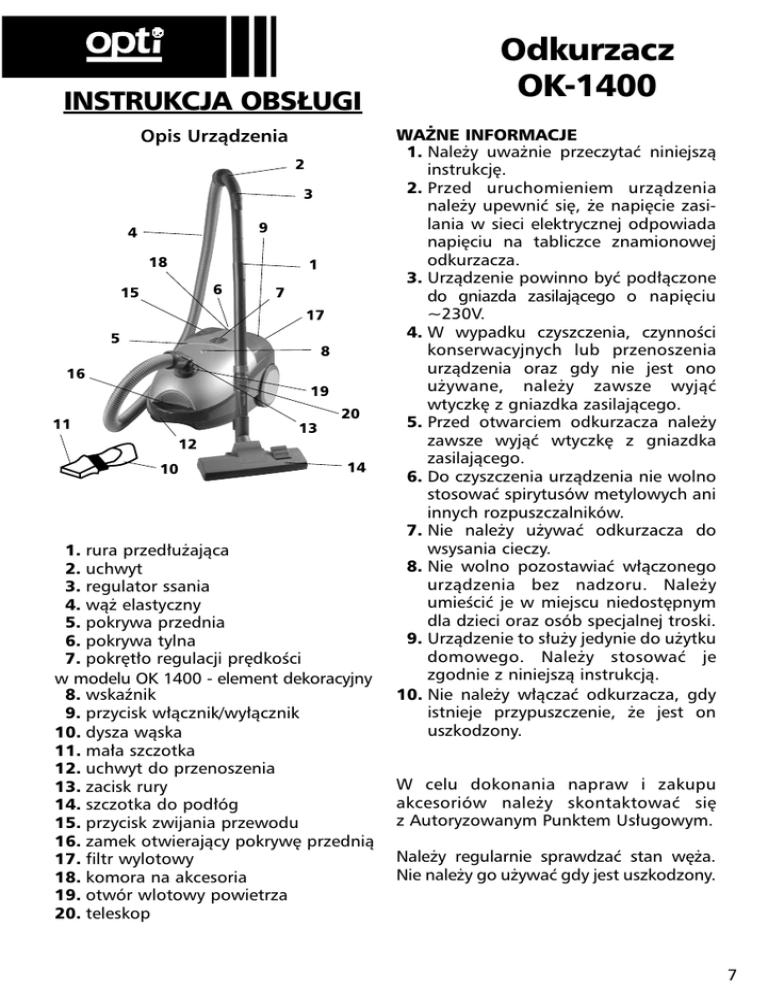 INSTRUKCJA OBSŁUGI Opis Urządzenia 2 3 9 4 18 1 6 15 7 17 5 8 16 19 20 11 13 12 10 14 1. rura przedłużająca 2. uchwyt 3. regulator ssania 4. wąż elastyczny 5. pokrywa przednia 6. pokrywa tylna 7. pokrętło regulacji prędkości w modelu OK 1400 - element dekoracyjny 8. wskaźnik 9. przycisk włącznik/wyłącznik 10. dysza wąska 11. mała szczotka 12. uchwyt do przenoszenia 13. zacisk rury 14. szczotka do podłóg 15. przycisk zwijania przewodu 16. zamek otwierający pokrywę przednią 17. filtr wylotowy 18. komora na akcesoria 19. otwór wlotowy powietrza 20. teleskop Odkurzacz OK-1400 WAŻNE INFORMACJE 1. Należy uważnie przeczytać niniejszą instrukcję. 2. Przed uruchomieniem urządzenia należy upewnić się, że napięcie zasilania w sieci elektrycznej odpowiada napięciu na tabliczce znamionowej odkurzacza. 3. Urządzenie powinno być podłączone do gniazda zasilającego o napięciu ~230V. 4. W wypadku czyszczenia, czynności konserwacyjnych lub przenoszenia urządzenia oraz gdy nie jest ono używane, należy zawsze wyjąć wtyczkę z gniazdka zasilającego. 5. Przed otwarciem odkurzacza należy zawsze wyjąć wtyczkę z gniazdka zasilającego. 6. Do czyszczenia urządzenia nie wolno stosować spirytusów metylowych ani innych rozpuszczalników. 7. Nie należy używać odkurzacza do wsysania cieczy. 8. Nie wolno pozostawiać włączonego urządzenia bez nadzoru. Należy umieścić je w miejscu niedostępnym dla dzieci oraz osób specjalnej troski. 9. Urządzenie to służy jedynie do użytku domowego. Należy stosować je zgodnie z niniejszą instrukcją. 10. Nie należy włączać odkurzacza, gdy istnieje przypuszczenie, że jest on uszkodzony. W celu dokonania napraw i zakupu akcesoriów należy skontaktować się z Autoryzowanym Punktem Usługowym. Należy regularnie sprawdzać stan węża. Nie należy go używać gdy jest uszkodzony. 7 • Nie należy wyciągać wtyczki z gniazdka poprzez ciągnięcie za przewód zasilający lub za odkurzacz. • Nie należy przesuwać urządzenia po kablu zasiającym. • Nie należy używać odkurzacza do wsysania igieł, pinezek czy też sznurka. MONTAŻ ODKURZACZA • Wcisnąć końcówkę węża do otworu wlotowego powietrza, aż do zatrzaśnięcia (kliknięcia). • Po zakończeniu odkurzania wcisnąć przycisk i wyciągnąć końcówkę węża. • Nie wolno używać urządzenia do wsysania zapalonych zapałek, niedopałków papierosa lub gorącego popiołu. • Nie należy używać urządzenia do czyszczenia mokrych powierzchni. 1. Mocowanie rury przedłużającej w uchwycie. 2. Łączenie rur przedłużających. • Nie umieszczać urządzenia w pobliżu źródeł ciepła. 3. Mocowanie końcówek przedłużającej. do rury INSTRUKCJA UŻYTKOWANIA • Przed uruchomieniem urządzenia, rozwinąć wystarczającą długość przewodu zasilającego, a następnie włożyć wtyczkę do gniazdka zasilającego. 8 ŻÓŁTE oznaczenie na kablu zasilającym wskazuje optymalną długość kabla. Nie należy rozwijać przewodu ponad CZERWONE oznaczenie. • Uszkodzony odkurzacz należy oddać do naprawy w autoryzowanym punkcie serwisowym. • Po użyciu należy odkurzacz wyłączyć. czerwony żółty • Wcisnąć przycisk WŁĄCZNIK/WYŁĄCZNIK, aby uruchomić urządzenie. • Po zakończeniu odkurzania wcisnąć przycisk włącznika, aby wyłączyć urządzenie; wyciągnąć wtyczkę z gniazda zasilania, a następnie nacisnąć przycisk zwijania przewodu, aby go równomiernie zwinąć. • W celu zwinięcia przewodu zasilającego, należy jedną ręką nacisnąć przycisk zwijania, a drugą prowadzić przewód tak, aby o nic nie uderzył. • Można posłużyć się przy tym poniższymi ilustracjami. pozycja postojowa (pionowa lub pozioma) ZASADY BEZPIECZNEGO UŻYTKOWANIA • Nie używać odkurzacza, gdy filtr lub worek są uszkodzone, gdyż może to spowodować uszkodzenia silnika. • Nie stosować odkurzacza do innych celów niż te, do jakich jest przeznaczony. • Nie zanurzać odkurzacza i kabla w wodzie. • Nie używać urządzenia w przypadku jego uszkodzenia lub uszkodzenia kabla. KONSERWACJA • Należy regularnie opróżniać płócienny worek na kurz. • Gdy filtr powietrza jest zakurzony, należy go wyczyścić lub wymienić. Nie wolno prać filtra w pralce, ani suszyć grzejnikami elektrycznymi. Należy go ponownie zamocować po uprzednim wyczyszczeniu. • Nie należy czyścić obudowy zewnętrznej odkurzacza przy pomocy benzyny lub innych produktów ropopochodnych. Należy przetrzeć ją szmatką zamoczoną w wodzie z detergentami. Nie wolno myć odkurzacza obficie zmoczoną szmatką. Nie należy także dopuścić do przedostania się wody do wnętrza odkurzacza. • Nie należy włączać przycisku na odkurzaczu za pomocą stopy. WYMIANA WORKA NA KURZ Gdy worek na kurz jest pełen, kolor wskaźnika zmienia się na czerwony. Wówczas należy wymienić lub opróżnić worek. Otworzyć pokrywę przednią. Wyjąć i opróżnić lub wymienić worek. Worki do odkurzacza są dostępne w sprzedaży detalicznej oraz we wszystkich autoryzowanych punktach serwisowych. ZASTOSOWANIE KOŃCÓWEK CZYSZCZĄCYCH • Dwupozycyjna szczotka do dywanów i podłóg. Poz. 1 włosie wysunięte - do pwierzchni twardych. 9 Poz. 2 włosie schowane – do dywanów. • Mała szczotka. Do czyszczenia zasłon, półek, książek, mebli tapicerskich, lamp oraz innych delikatnych przedmiotów. • Dysza wąska. Do czyszczenia grzejników, narożników i krawędzi. • Po zakończeniu odkurzania należy umieścić wąską dyszę oraz małą szczotkę w komorze na akcesoria. 10 Odkurzacz OK-1400 DANE TECHNICZNE: MOC: 1200W NAPIĘCIE: ~230V CZĘSTOTLIWOŚĆ: 50 Hz POZIOM HAŁASU: do 82 dB/A/ SPRAWNOŚĆ: 19% PODCIŚNIENIE: max 17,5 Kpa 11