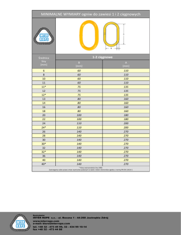 MINIMALNE WYMIARY ogniw do zawiesi 1 i 2 cięgnowych 1-2 cięgnowe Średnica liny [mm] B [mm] A [mm] 6 8 10 11 11* 12 12* 13 14 16 18 20 22 24 60 60 60 60 75 75 75 80 80 80 80 100 100 110 110 110 110 110 135 135 135 160 160 160 160 180 180 200 24* 26 28 30 30* 32 32* 36 40 40* 110 140 140 140 140 140 140 140 140 140 200 270 270 270 270 270 270 270 270 270 * Klasa wytrzymałości liny 1960. Zastrzegamy sobie prawo zmian wymiarów podanych w tabeli. Dobór elementów zgodny z normą PN-EN 13414-1 Dystrybutor INTER ROPE s.c. - ul. Boczna 1 - 44-268 Jastrzębie Zdrój www.interrope.com e-mail: [email protected] tel. +48 32 - 473 45 99, 32 - 434 99 10-14 fax +48 32 - 473 44 88
