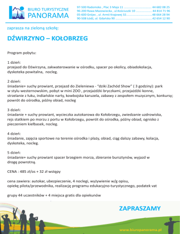 BIURO TURYSTYCZNE PANORAMA 97-500 Radomsko , Plac 3 Maja 11 ................................. 44 682 08 25 96-200 Rawa Mazowiecka , ul.Koœciuszki 10 ................... 44 814 71 96 05-600 Grójec , ul. Armii Krajowej 32...............................48 664 28 94 90-508 £ódŸ, ul. Gdañska 90 ............................................42 654 12 90 zaprasza na zielon¹ szko³ê: DWIRZYNO – KO£OBRZEG Program pobytu: 1 dzieñ: przejazd do DŸwirzyna, zakwaterowanie w oœrodku, spacer po okolicy, obiadokolacja, dyskoteka powitalna, nocleg. 2 dzieñ: œniadanie+ suchy prowiant, przejazd do Zieleniewa - “dziki Zachód Show” ( 3 godziny): park w stylu westernowskim, pobyt w mini ZOO , przeja¿d¿ki bryczkami, przeja¿d¿ki konne, strzelanie z ³uku, indiañskie narty, kowbojska karuzela, zabawy z zespo³em muzycznym, konkursy; powrót do oœrodka, póŸny obiad, nocleg 3 dzieñ: œniadanie + suchy prowiant, wycieczka autokarowa do Ko³obrzegu, zwiedzanie uzdrowiska, rejs statkiem po morzu z portu w Ko³obrzegu, powrót do oœrodka, póŸny obiad, ognisko z pieczeniem kie³basek, nocleg. 4 dzieñ: œniadanie, zajêcia sportowe na terenie oœrodka i pla¿y, obiad, ci¹g dalszy zabawy, kolacja, dyskoteka, nocleg. 5 dzieñ: œniadanie+ suchy prowiant spacer brzegiem morza, zbieranie bursztynów, wyjazd w drogê powrotn¹. CENA : 485 z³/os + 32 z³ wstêpy cena zawiera: autokar, ubezpieczenie, 4 noclegi, wy¿ywienie w/g opisu, opiekê pilota/przewodnika, realizacjê programu edukacyjno-turystycznego, podatek vat grupy 44 uczestników + 4 miejsca gratis dla opiekunów ZAPRASZAMY www.biuropanorama.pl