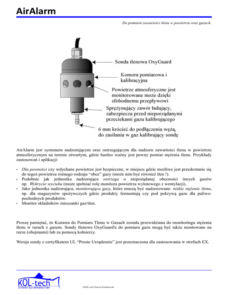AirAlarm Do pomiaru zawartości tlenu w powietrzu oraz gazach. AirAlarm jest systemem nadzorującym oraz ostrzegającym dla nadzoru zawartości tlenu w powietrzu atmosferycznym na terenie otwartym, gdzie bardzo ważny jest pewny pomiar stężenia tlenu. Przykłady zastosowań i aplikacji: • • • • Dla pewności czy wdychane powietrze jest bezpieczne, w miejscu gdzie możliwe jest przedostanie się do tegoż powietrza różnego rodzaju “obce” gazy (może nim być również tlen !). Podobnie jak jednostka nadzorująca ostrzega o niepożądanej obecności innych gazów np. Wykrycie wycieku (może spełniać rolę monitora powietrza wylotowego z wentylacji). Jako jednostka nadzorująca, monitorująca gazy, które muszą być nadzorowane: niskie stężenie tlenu, np. dla magazynów spożywczych gdzie produkty fermentują czy pod pokrywą gazu dla paliwopochodnych produktów. Monitor składników mieszanki gaz/tlen. Proszę pamiętać, że Komora do Pomiaru Tlenu w Gazach została przewidziana do monitoringu stężenia tlenu w rurach z gazem. Sondy tlenowe OxyGuard'a do pomiaru gazu mogą być także montowane na rurze (obejmami) lub za pomocą kołnierzy. Wersja sondy z certyfikatem UL “Proste Urządzenie” jest przeznaczona dla zastosowania w strefach EX. . ©KOL-tech Tomasz Kolankowski Dane techniczne Walory techniczne: AirAlarm składa się z sondy do pomiaru tlenu w specjalnej komorze pomiarowo – kalibracyjnej, jak to pokazano na rysunku na poprzedniej stronie. AirAlarm jest łatwy w użyciu oraz bardzo dokładny. Podłączenie kalibracyjne do gazu – w celu kalibracji lub sprawdzenia systemu wystarczy odkręcić przepływ gazu kalibracyjnego. Sprężynujący zawór ładujący zabezpiecza przed nie pożądanymi wyciekami gazu kalibracyjnego z rur po zakończeniu kalibracji. Kalibracja i/lub sprawdzenie czy wszystko działa poprawnie zajmuje zaledwie kilka minut ! Sondy OxyGuard'a mogą poprawnie mierzyć poziom tlenu w powietrzu, o bardzo dużej zawartości tlenu, bardzo długo, bez potrzeby konserwacji. Niezrównana powtarzalność czyni system wyjątkowo użytecznym i niezastąpionym w zastosowaniu do nadzoru (kontroli) oraz detekcji (bezpieczeństwa). Błędy sondy: takie jak np. Zanikanie sygnału wyjściowego, a tym samym częstsze wyzwalanie alarmu spowodowane jest brakiem konserwacji. AirAlarm może być także zamontowany na sondach Modeli: 420 oraz 840. Obie mają 2-przewodowe przetworniki 4 – 20 mA, jednostki zasilane są z własnego obwodu pomiarowego (4 – 20 mA). Specyfikacja: Wymiary: Średnica 65 mm, wysokość 160 mm (ze standardową sondą). Podłączenie gazu kalibracyjnego: 6 mm podłączenie węża z gazem kalibracyjnym. Materiał: PCV. (inne na życzenie klienta). Informacje do zamówienia: E011: AirAlarm – komora pomiarowa i kalibracyjna. Sonda oraz przetwornik muszą być zamawiane osobno!. Proszę zapoznać się z kartami katalogowymi sondy Standardowej, Modelu 420, Modelu 840, w celu uzyskania szczegółów dotyczących sond oraz przetworników lub jednostek monitorująco – alarmujących. KOL-tech Tomasz Kolankowski ul. Wenus 18, 80-299 Gdańsk strona: www.tlenomierz.pl Tel: +48 607 24 81 84 fax: +4858 555 00 58 e-mail: [email protected]