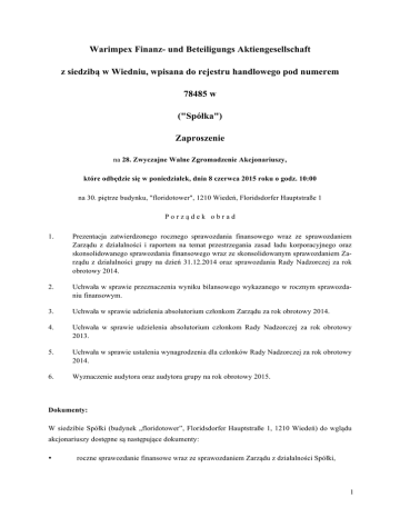 dokumenty będą dostępne do wglądu akcjonariuszy w siedzibie Spółki, jak również na stronie internetowej Spółki (www.warimpex.com). Dokumenty te zostaną także udostępnione na zwyczajnym