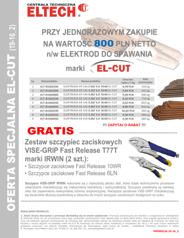 (19-16_2) OFERTA SPECJALNA EL-CUT PRZY JEDNORAZOWYM ZAKUPIE NA WARTOŚĆ 800 PLN NETTO n/w ELEKTROD DO SPAWANIA marki Lp. Kod produktu 1 2 3 4 5 6 7 8 9 ELT-R1462550 ELT-R1463260 ELT-R1464060 ELT-B1462540 ELT-B1463250 ELT-B1464050 ELT-B1502540 ELT-B1503250 ELT-B1504050 Nazwa produktu ELEKTRODA ER 146 2.50/ 5.0 ELEKTRODA ER 146 3.20/ 6.0 ELEKTRODA ER 146 4.00/ 6.0 ELEKTRODA EB 146 2.50/ 4.0 ELEKTRODA EB 146 3.20/ 5.0 ELEKTRODA EB 146 4.00/ 5.0 ELEKTRODA EB 150 2.50/ 4.0 ELEKTRODA EB 150 3.20/ 5.0 ELEKTRODA EB 150 4.00/ 5.0 GRATIS R146 EL-CUT R146 EL-CUT R146 EL-CUT B146 EL-CUT B146 EL-CUT B146 EL-CUT B150 EL-CUT B150 EL-CUT B150 EL-CUT Cena kat. netto / 1 kg Ilość promocyjna 9,78 PLN 9,44 PLN 9,38 PLN 9,18 PLN 9,02 PLN 8,98 PLN 10,02 PLN 9,58 PLN 9,38 PLN 150 kg 235 kg 696 kg 716 kg 855 kg 810 kg 340 kg 680 kg 680 kg !!! ZAPYTAJ O RABAT !!! ----------------------------------------------------- Zestaw szczypiec zaciskowych VISE-GRIP Fast Release T77T marki IRWIN (2 szt.): • Szczypce zaciskowe Fast Release 10WR • Szczypce zaciskowe Fast Release 6LN Szczypce VISE-GRIP IRWIN wykonane są z najwyższej jakości stali, która dzięki technicznemu procesowi utwardzania charakteryzuje się maksymalną twardością i wytrzymałością. Szczypce powlekaną są warstwą niklu dla zapewnienia maksymalnej ochrony antykorozyjnej. Narzędzia zaciskowe VISE-GRIP charakteryzują się dwukrotnie dłuższą żywotnością w stosunku do innych szczypiec zaciskowych dostępnych na rynku. ------------------------------------------------------------------------------------REGULAMIN PROMOCJI: 1. Jeżeli chcesz skorzystać z promocji skontaktuj się ze swoim opiekunem. Promocja przeznaczona dla klientów o uregulowanych płatnościach 2. Ważność oferty do: do wyczerpania stanu mag. produktów promocyjnych i/lub nagród (stan na dzień 08.07.2016). Ilość nagród ograniczona (25szt.). Liczy się kolejność zgłoszeń promocyjnych 3. Promocja dot. jednorazowego zakupu na określoną wartość netto po rabatach 4. Promocja nie może być łączona z innymi akcjami na produkty marki EL-CUT 5. Promocja nie stanowi oferty handlowej w rozumieniu art. 66 § 1 KC oraz innych właściwych przepisów prawnych, ma jedynie charakter informacyjny 6. Zastrzegamy sobie prawo do korekty i modyfikacji informacji zawartych w ulotce 7. Szczegóły: Ewa Miśków-Zych, tel. 74 858 27 10, 506 192 721, [email protected] PROMOCJA 19-16_2