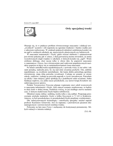 FOTON 97, Lato 2007 1 Orły specjalnej troski Okazuje się, że w praktyce problem równoczesnego nauczania i edukacji tzw. „zwykłych” uczniów i elit napotyka na ogromne trudności i bardzo rzadko jest z sukcesem realizowany. W sztukach pięknych młodzież uzdolnioną kształci się na ogół w osobnych szkołach, np. muzycznych, plastycznych czy baletowych. W nauczaniu matematyki i fizyki, gdzie rozrzut zdolności i zainteresowań jest równie pokaźny jak w sztuce, z dużą pewnością można stwierdzić, że armia wyizolowanych singli więdnie w szkołach, w których kształci się „ogół”. Wiele zrobiono dobrego, choć raczej tylko w sferze idei, by poprawić nauczanie w matematyce i fizyce, lecz równocześnie pod wpływem populistycznych nacisków poprawa ta łączy się ze zminimalizowaniem czasu nauczania. Po latach zaniedbywania najzdolniejszych, z powodu wiary iż oni sobie i tak sami poradzą, nadeszła pora, by się nad nimi uważniej pochylić. Oni, ambitni najzdolniejsi, są zwykłymi nastolatkami. Jak kania dżdżu potrzebują aprobaty rówieśniczej, mają silną potrzebę rywalizacji. Czekają na uznanie ze strony szkoły, rodziców, czekają na przyszłą nagrodę w życiu zawodowym. Potrzebne są szkoły i inne miejsca, gdzie spotkają się z podobnymi sobie uczniami. Jedna fundacja rządowa, czy jedno nasze przedszkole, czy nawet Grupa Kwarków nie załatwiają jeszcze sprawy. Polskie Towarzystwo Fizyczne planuje wspieranie sieci szkół wzorcowych w nauczaniu informatyki i fizyki. Jeśli zamysł zostanie zrealizowany, to będzie to duży krok w dobrą stronę. Osobiście wierzę, że już niedługo znowu nastanie czas, w którym studiowanie fizyki będzie nobilitować. Młodzież mamy dobrą i ambitną, trzeba tylko o nią zadbać. Proponuję przeczytanie artykułu studentów fizyki o kółku fizycznym w V LO w Krakowie. Autorzy, to byli przedszkolacy (o przedszkolach fizyki pisaliśmy wielokrotnie). Dla zafascynowanych kosmologią i astrofizyką specjalny artykuł napisał profesor Kazimierz Grotowski. Jest on napisany z prawdziwym pazurem dramaturgicznym i zawiera kawał rzetelnej wiedzy. Polecamy na lato nasz Foton i zachęcamy do kontynuacji prenumeraty. Miłych wakacji w imieniu redakcji. Z.G.-M.