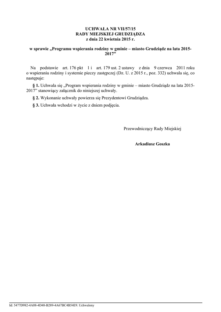 UCHWAŁA NR VII/57/15 RADY MIEJSKIEJ GRUDZIĄDZA z dnia 22 kwietnia 2015 r. w sprawie „Programu wspierania rodziny w gminie – miasto Grudziądz na lata 20152017” Na podstawie art. 176 pkt 1 i art. 179 ust. 2 ustawy z dnia 9 czerwca 2011 roku o wspieraniu rodziny i systemie pieczy zastępczej (Dz. U. z 2015 r., poz. 332) uchwala się, co następuje: § 1. Uchwala się „Program wspierania rodziny w gminie – miasto Grudziądz na lata 20152017” stanowiący załącznik do niniejszej uchwały. § 2. Wykonanie uchwały powierza się Prezydentowi Grudziądza. § 3. Uchwała wchodzi w życie z dniem podjęcia. Przewodniczący Rady Miejskiej Arkadiusz Goszka Id: 5477D982-4A08-4D48-B289-4A67BC4B54E9. Uchwalony Załącznik do Uchwały Nr VII/57/15 Rady Miejskiej Grudziądza z dnia 22 kwietnia 2015 r. PROGRAM WSPIERANIA RODZINY W GMINIE - MIASTO GRUDZIĄDZ NA LATA 2015-2017 GRUDZIĄDZ, 2015 ROK 1 Id: 5477D982-4A08-4D48-B289-4A67BC4B54E9. Uchwalony SPIS TREŚCI strona I. Wstęp …………………………………………………………………………………. 3 II. Podstawy prawne ……………………………………………………………………... 3 III. Diagnoza stanu aktualnego w zakresie wspierania rodziny ………………………….. 3 1. Charakterystyka rodzin przeżywających trudności w wypełnianiu funkcji opiekuńczo wychowawczych objętych wsparciem społecznym……………………………………… 3 2. Infrastruktura w zakresie pomocy i wspierania rodzin w Grudziądzu ……………………4 IV. Cel główny ………………………………………………………………………….. 11 V. Cele operacyjne ………………………………………………………………………11 1. Podnoszenie świadomości społeczności lokalnej w zakresie znaczenia rodziny i jej prawidłowego funkcjonowania………………………………………………………… 11 2. Doskonalenie systemu wsparcia rodziny oraz praca z rodziną dysfunkcyjną ………….12 3. Doskonalenie współpracy i umiejętności osób wykonujących zadania z zakresu wspierania rodziny …………………………………………………………………….. 14 VI. Monitorowanie programu i sprawozdawczość ……………………………………… 14 2 Id: 5477D982-4A08-4D48-B289-4A67BC4B54E9. Uchwalony I. WSTĘP Celem „Programu wspierania rodziny w gminie miasto Grudziądz na lata 2015 – 2017” jest kompleksowe zapewnienie wsparcia dziecku i rodzinie przeżywającej trudności w wypełnianiu funkcji opiekuńczo - wychowawczych w gminie - miasto Grudziądz. Realizacja niniejszego Programu powinna prowadzić do ograniczenia zjawisk patologii społecznych wśród rodzin, podejmowania szeregu działań profilaktycznych i edukacyjnych, rozbudowy systemu opieki nad dzieckiem oraz pracy z rodziną. II. PODSTAWY PRAWNE „Program wspierania rodziny w gminie miasto Grudziądz na lata 2015-2017” opracowano w oparciu o przepisy ustawy z dnia 9 czerwca 2011 roku o wspieraniu rodziny i systemie pieczy zastępczej (Dz. U. z 2015 roku, poz. 332). Zgodnie z art. 176 pkt 1 wyżej cytowanej ustawy do zadań własnych gminy należy opracowanie i realizacja 3 – letnich gminnych programów wspierania rodziny. Pozostałe akty prawne, w oparciu o które program będzie realizowany: ustawa z dnia 12 marca 2004 roku o pomocy społecznej (Dz. U. z 2015 roku, poz.163 z późn. zm.), ustawa z dnia 29 lipca 2005 roku o przeciwdziałaniu przemocy w rodzinie (Dz. U. Nr 180, poz. 1493 z późn. zm.), ustawa z dnia 25 lutego 1964 roku - kodeks rodzinny i opiekuńczy (Dz. U. z 2012 roku, poz. 788 z późn. zm.). „Program wspierania rodziny w gminie miasto Grudziądz na lata 2015-2017” jest zgodny ze Strategią rozwiązywania problemów społecznych miasta Grudziądza w latach 2004-2015, z Celem operacyjnym 5: Doskonalenie systemu pomocy dziecku oraz rodzinie dysfunkcyjnej i problemowej oraz z działaniem 5.3 w ramach wspomnianego celu: Kompleksowe wspieranie dzieci i rodziny celem odbudowy więzi wewnątrzrodzinnych i przywrócenia właściwego funkcjonowania w społeczeństwie. III. DIAGNOZA STANU AKTUALNEGO W ZAKRESIE WSPIERANIA RODZINY 1. Charakterystyka rodzin przeżywających trudności w wypełnianiu funkcji opiekuńczo -wychowawczych objętych wsparciem społecznym Rodziny z trudnościami opiekuńczo-wychowawczymi nadal stanowią znaczną część klientów pomocy społecznej. Najczęściej niezaradność rodziny w opiece i wychowaniu oraz problemy w pełnieniu ról rodzicielskich łączą się z innymi dysfunkcjami takimi jak: uzależnienie od alkoholu i środków psychoaktywnych, przemoc domowa, przestępczość młodocianych, zaburzenia równowagi systemu rodzinnego w sytuacjach kryzysowych, małżeńskich, zawodowych. Problemy rodzin niewydolnych wychowawczo są niezwykle złożone i często zdarza się, że jedna rodzina dotknięta jest wieloma dysfunkcjami. Specyfika tych rodzin wymaga od służb pomocowych zintensyfikowanych działań podejmowanych wielokierunkowo. Świadczą o tym m.in. najczęstsze powody przyznawania pomocy społecznej. Dane za rok 2014 ilustruje poniższa tabela (źródło: sprawozdania MPiPS-03 za rok 2014). 3 Id: 5477D982-4A08-4D48-B289-4A67BC4B54E9. Uchwalony Powód trudnej sytuacji życiowej ubóstwo sieroctwo bezdomność potrzeba ochrony macierzyństwa w tym: wielodzietność bezrobocie niepełnosprawność długotrwała lub ciężka choroba bezradność w sprawach opiek.- wych. i prowadzenia gosp. dom.- ogółem w tym: rodziny niepełne rodziny wielodzietne przemoc w rodzinie alkoholizm narkomania trudności w przystosowaniu do życia po zwolnieniu z zakładu karnego trudności w integracji osób, które otrzymały status uchodźcy lub ochronę uzupełniającą zdarzenie losowe sytuacja kryzysowa liczba rodzin ogółem liczba osób w rodzinach 1 2 3 4 3975 1 183 8749 1 219 463 2088 4.1 5 6 7 278 3529 1678 1156 1465 8360