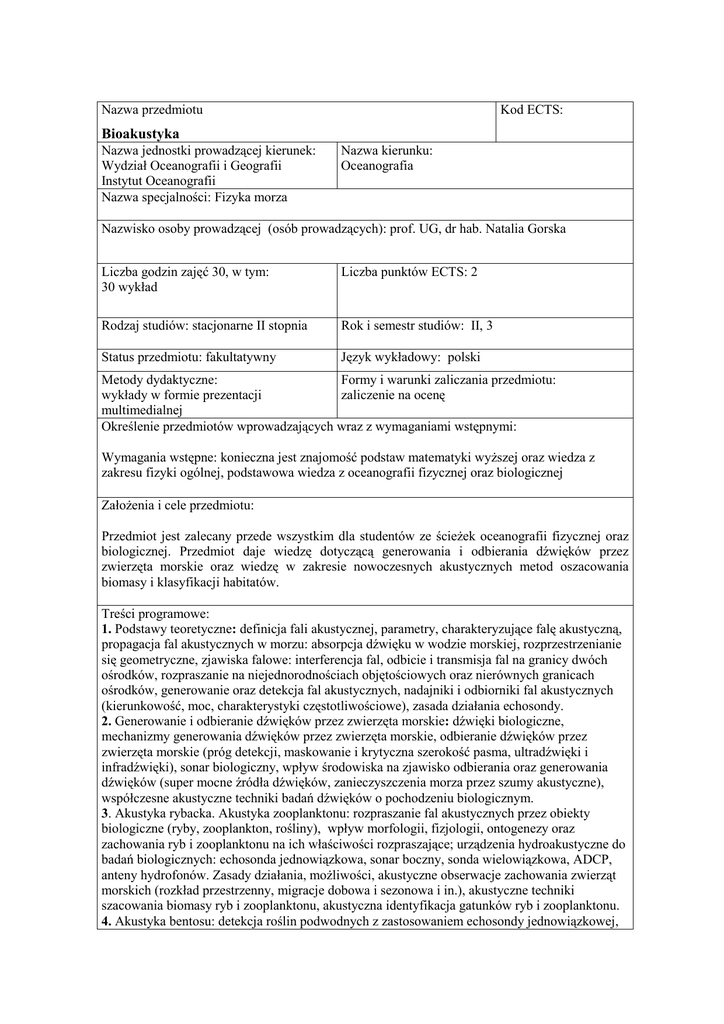 Nazwa przedmiotu Kod ECTS: Bioakustyka Nazwa jednostki prowadzącej kierunek: Wydział Oceanografii i Geografii Instytut Oceanografii Nazwa specjalności: Fizyka morza Nazwa kierunku: Oceanografia Nazwisko osoby prowadzącej (osób prowadzących): prof. UG, dr hab. Natalia Gorska Liczba godzin zajęć 30, w tym: 30 wykład Liczba punktów ECTS: 2 Rodzaj studiów: stacjonarne II stopnia Rok i semestr studiów: II, 3 Status przedmiotu: fakultatywny Język wykładowy: polski Metody dydaktyczne: Formy i warunki zaliczania przedmiotu: wykłady w formie prezentacji zaliczenie na ocenę multimedialnej Określenie przedmiotów wprowadzających wraz z wymaganiami wstępnymi: Wymagania wstępne: konieczna jest znajomość podstaw matematyki wyŜszej oraz wiedza z zakresu fizyki ogólnej, podstawowa wiedza z oceanografii fizycznej oraz biologicznej ZałoŜenia i cele przedmiotu: Przedmiot jest zalecany przede wszystkim dla studentów ze ścieŜek oceanografii fizycznej oraz biologicznej. Przedmiot daje wiedzę dotyczącą generowania i odbierania dźwięków przez zwierzęta morskie oraz wiedzę w zakresie nowoczesnych akustycznych metod oszacowania biomasy i klasyfikacji habitatów. Treści programowe: 1. Podstawy teoretyczne: definicja fali akustycznej, parametry, charakteryzujące falę akustyczną, propagacja fal akustycznych w morzu: absorpcja dźwięku w wodzie morskiej, rozprzestrzenianie się geometryczne, zjawiska falowe: interferencja fal, odbicie i transmisja fal na granicy dwóch ośrodków, rozpraszanie na niejednorodnościach objętościowych oraz nierównych granicach ośrodków, generowanie oraz detekcja fal akustycznych, nadajniki i odbiorniki fal akustycznych (kierunkowość, moc, charakterystyki częstotliwościowe), zasada działania echosondy. 2. Generowanie i odbieranie dźwięków przez zwierzęta morskie: dźwięki biologiczne, mechanizmy generowania dźwięków przez zwierzęta morskie, odbieranie dźwięków przez zwierzęta morskie (próg detekcji, maskowanie i krytyczna szerokość pasma, ultradźwięki i infradźwięki), sonar biologiczny, wpływ środowiska na zjawisko odbierania oraz generowania dźwięków (super mocne źródła dźwięków, zanieczyszczenia morza przez szumy akustyczne), współczesne akustyczne techniki badań dźwięków o pochodzeniu biologicznym. 3. Akustyka rybacka. Akustyka zooplanktonu: rozpraszanie fal akustycznych przez obiekty biologiczne (ryby, zooplankton, rośliny), wpływ morfologii, fizjologii, ontogenezy oraz zachowania ryb i zooplanktonu na ich właściwości rozpraszające; urządzenia hydroakustyczne do badań biologicznych: echosonda jednowiązkowa, sonar boczny, sonda wielowiązkowa, ADCP, anteny hydrofonów. Zasady działania, moŜliwości, akustyczne obserwacje zachowania zwierząt morskich (rozkład przestrzenny, migracje dobowa i sezonowa i in.), akustyczne techniki szacowania biomasy ryb i zooplanktonu, akustyczna identyfikacja gatunków ryb i zooplanktonu. 4. Akustyka bentosu: detekcja roślin podwodnych z zastosowaniem echosondy jednowiązkowej, sonaru bocznego oraz sondy wielowiązkowej; akustyczne oszacowanie biomasy roślin bentosowych; akustyczna klasyfikacja habitatów bentosowych, akustyczne obserwacje fotosyntezy roślin podwodnych. 5. Metodologia opracowania akustycznych technik badań flory i fauny morskiej: organizacja akustyczno – biologicznego rejsu naukowo – badawczego; metodologia wspólnych pomiarów akustyczno - biologicznych. 6. Badania akustyczne flory i fauny Bałtyckiej: zadania, trudności, perspektywy 7. Wykorzystanie metod akustycznych w czynnej ochronie zasobów morskich. Umiejętności i kompetencje: 1. kurs wprowadza we współczesne zagadnienia bioakustyki; 2. kurs demonstruje moŜliwości współczesnych metod akustycznych stosowanych do badań ekosystemów morskich; 3. kurs wprowadza w metodologię opracowania metod akustycznych stosowanych do badań biologicznych w morzu; 4. kurs nadaje szczególną wagę zrozumieniu fizycznych podstaw metod akustycznych, bez czego nie jest moŜliwa prawidłowa interpretacja otrzymanych danych biologicznych; 5. kurs uczy kreatywnego myślenia. Wykaz literatury - podstawowej: 1. MacLennan D. N. and Simmonds E. J., 2005. Fisheries Acoustics Theory and Practice. Blackwell Publishing Limited; 2 edition (September 1, 2005), 437. 2. Lurton X., 2002. An Introduction to Underwater Acoustics. Principles and Applications. Springer, 347. 3. Medwin H. and Clay C. S., 1998. Fundamentals of Acoustical Oceanography. Academic Press, Boston, 712. 4. Medwin H., 2005. Sounds in the Sea. From Ocean Acoustics to Acoustical Oceanography. Cambridge University Press, New York, 643. 5. Stepnowski A., 2001. Systemy akustycznego monitoringu środowiska morskiego. Gd. Tow. Nauk., Gdańsk, 283. - uzupełniającej: 1. Śliwiński A., 2001. Ultradźwięki i ich zastosowania. Wyd. Nauk.-Tech., Warszawa, 426. 2. Urick R. J., 1975. Principles of underwater sound. McGraw-Hill. 3. Clay C. S. and Medwin H., 1977. Acoustical Oceanography: Principles and Applications. Wiley, New York, 544.