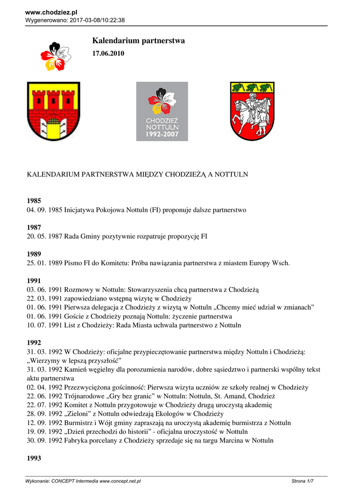 www.chodziez.pl Wygenerowano: 2017-03-08/10:22:38 Kalendarium partnerstwa 17.06.2010 KALENDARIUM PARTNERSTWA MIĘDZY CHODZIEŻĄ A NOTTULN 1985 04. 09. 1985 Inicjatywa Pokojowa Nottuln (FI) proponuje dalsze partnerstwo 1987 20. 05. 1987 Rada Gminy pozytywnie rozpatruje propozycję FI 1989 25. 01. 1989 Pismo FI do Komitetu: Próba nawiązania partnerstwa z miastem Europy Wsch. 1991 03. 06. 1991 Rozmowy w Nottuln: Stowarzyszenia chcą partnerstwa z Chodzieżą 22. 03. 1991 zapowiedziano wstępną wizytę w Chodzieży 01. 06. 1991 Pierwsza delegacja z Chodzieży z wizytą w Nottuln „Chcemy mieć udział w zmianach” 01. 06. 1991 Goście z Chodzieży poznają Nottuln: życzenie partnerstwa 10. 07. 1991 List z Chodzieży: Rada Miasta uchwala partnerstwo z Nottuln 1992 31. 03. 1992 W Chodzieży: oficjalne przypieczętowanie partnerstwa między Nottuln i Chodzieżą: „Wierzymy w lepszą przyszłość” 31. 03. 1992 Kamień węgielny dla porozumienia narodów, dobre sąsiedztwo i partnerski wspólny tekst aktu partnerstwa 02. 04. 1992 Przezwyciężona gościnność: Pierwsza wizyta uczniów ze szkoły realnej w Chodzieży 22. 06. 1992 Trójnarodowe „Gry bez granic” w Nottuln: Nottuln, St. Amand, Chodzież 22. 07. 1992 Komitet z Nottuln przygotowuje w Chodzieży drugą uroczystą akademię 28. 09. 1992 „Zieloni” z Nottuln odwiedzają Ekologów w Chodzieży 12. 09. 1992 Burmistrz i Wójt gminy zapraszają na uroczystą akademię burmistrza z Nottuln 19. 09. 1992 „Dzień przechodzi do historii” - oficjalna uroczystość w Nottuln 30. 09. 1992 Fabryka porcelany z Chodzieży sprzedaje się na targu Marcina w Nottuln 1993 Wykonanie: CONCEPT Intermedia www.concept.net.pl Strona 1/7 www.chodziez.pl Wygenerowano: 2017-03-08/10:22:38 19. 02. 1993 Rodzina Kolpinga z Nottuln rozpoczyna zbiórkę datków dla Chodzieży 17. 04. 1993 Przewodniczący Komitetu Krukenberg spotyka się z burmistrzem Nowaczykiem 17. 06. 1993 Chór męski z Nottuln po raz pierwszy odwiedza Chodzież 25. 06. 1993 Młodzież „Fundacji Marcina” z odwiedzinami z Nottuln: projekt socjalny 02. 07. 1993 Burmistrz Nowaczyk po raz pierwszy w Nottuln 16. 07. 1993 Siostry zakonne z Chodzieży odwiedzają Nottuln 26. 08. 1993 Znaki przy wjeździe do Chodzieży informują teraz o partnerstwie z Nottuln 07. 09. 1993 Rodzina Kolpinga pomaga szpitalowi w Chodzieży 22. 10. 1993 Inicjatywa Pokojowa (FI) sadzi w Chodzieży dąb pokoju: „Pozwólmy rosnąć przyjaźni i pokojowi” 22. 12. 1993 Uczniowie ze szkoły realnej pomagają niepełnosprawnym dzieciom w Polsce 1994 25. 01. 1994 Rodzina Kolpinga urządza kuchnię parafialną w Chodzieży „Ciepły stół' 13. 04. 1994 Młodzież Kolpinga i ministranci odwiedzają Chodzież 03. 05. 1994 26 nauczycieli ze Szkoły Zawodowej z Chodzieży odwiedza Nottuln 18. 05. 1994 Praktyki: Uczniowie szkoły Zawodowej gośćmi u „Hagemeistra” 04. 06. 1994 Towarzystwo drogowe i Ojczyzny przyjmuje gości z Chodzieży 23. 07. 1994 Tenisiści z Chodzieży goszczą w Nottuln 30. 08. 1994 Proboszcz Stanisławski otrzymuje po kazaniu spontaniczne oklaski Młodzież z Chodzieży wraca zadowolona do Polski 1995 10. 01. 1995 Wspólne posiedzenie komitetów w Chodzieży: Obszerny program wymiany! 14. 01. 1995 Złoty chomik jako nagroda główna: Spojrzenie wstecz na wspaniałą podróż do Chodzieży 11. 02. 1995 Gimnazjaliści z Nottuln jadą pierwszy raz do Chodzieży 08. 05. 1995 50 lat od zakończenia II Wojny Światowej: Uczestnicy wojny z Polski, Francji i Czech spotykają się w Nottuln 27. 05. 1995 W międzyczasie wiele prywatnych kontaktów na linii Nottuln – Chodzież 24. 06. 1995 Chór dziecięcy św. Floriana z Chodzieży odwiedza Nottuln 17. 08. 1995 Niezapomniane wrażenia: Tenisiści z Nottuln wracają z Chodzieży 05. 10. 1995 28 uczniów z Chodzieży gośćmi gimnazjum w Nottuln 06. 10. 1995 Pracownicy Urzędu Miejskiego z Chodzieży odwiedzają Urząd Gminy w Nottuln 20. 10. 1995 CDU z Nottuln odwiedza Chodzież: „Partnerstwo stoi na mocnym fundamencie” 27. 11. 1995 Służba Ratownictwa Wodnego i Pogotowia przyjmuje gości z Chodzieży na zawodach pływackich 1996 07. 01. 1996 Wspólne posiedzenie komitetów w Chodzieży: Obszerny program wymiany! 28. 06. 1996 Utworzono Rodzinę Kolpinga w Chodzieży: mieszkańcy Nottuln zagrali „położników” 26. 08. 1996 Drugie trójnarodowe „Gry bez granic” w Nottuln 28. 04. 1996 Rada Parafialna z Nottuln odwiedza Chodzież: Gościnność i interesujący program 10. 10. 1996 Bogata w przeżycia podróż: Gimnazjaliści z Nottuln wracają z Chodzieży 02. 11. 1996 Pierwsze małżeństwo z partnerstwa między Nottuln i Chodzieżą 02. 11. 1996 Żałoba po śmierci ks. K. Józefiaka również w Nottuln 1997 24. 05. 1997 Pięć lat Chodzież – Nottuln: Wielkie święto w Chodzieży. 140 mieszkańców Nottuln w Wykonanie: CONCEPT Intermedia www.concept.net.pl Strona 2/7 www.chodziez.pl Wygenerowano: 2017-03-08/10:22:38 Polsce 24. 05. 1997 Nadzieje się spełniły: Spojrzenie wstecz na partnerstwo 24. 05. 1997 „Pozytywne uczucie, czuć się na obczyźnie jak w domu” Osobiste wrażenia z pobytu w Chodzieży 23. 05. 1997 Strażacy z Nottuln i Chodzieży pogłębiają swoje kontakty 20. 05. 1997 FI Nottuln i „Oś” z Chodziezy nawiązują kontakty 02. 07. 1997 Wielki propagator partnerstwa: Proboszcz Jan Stanisławski opuszcza Chodzież 01. 08. 1997 Urlop w partnerstwie: Coraz więcej prywatnych odwiedzin 21. 10. 1997 Spotkanie Rodzin Kolpinga z Chodzieży i z Nottuln 21. 10. 1997 Kuchnia karmi dziennie 200 mieszkańców Chodzieży: Kolping jedzie przez północną Polskę 27. 10. 1997 Wspólne posiedzenie komitetów w Nottuln: Rodzinna atmosfera 27. 10. 1997 Program odwiedzin na rok 1998: Coraz więcej grup zainteresowanych kontaktami 1998 12. 03. 1998 Pierwsza wizyta w Chodzieży uczniów ze szkoły głównej z Nottuln: Gospodynie rolne z Appelhülsen sponsorami 22. 04. 1998 Rodzina Kolpinga z Nottuln nadal wspiera szpital w