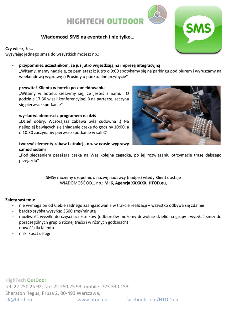 Wiadomości SMS na eventach i nie tylko… Czy wiesz, że… wysyłając jednego smsa do wszystkich możesz np.: -‐ przypomnieć uczestnikom, że już jutro wyjeżdżają na imprezę integracyjną „Witamy, mamy nadzieję, że pamiętasz iż jutro o 9:00 spotykamy się na parkingu pod biurem i wyruszamy na weekendową wyprawę :) Prosimy o punktualne przybycie” -‐ przywitać Klienta w hotelu po zameldowaniu „Witamy w hotelu, cieszymy się, że jesteś z nami. O godzinie 17:30 w sali konferencyjnej B na parterze, zaczyna się pierwsze spotkanie” -‐ wysłać wiadomości z programem na dziś „Dzień dobry. Wczorajsza zabawa była cudowna :) Na najlepiej bawiących się śniadanie czeka do godziny 10:00, a o 10:30 zaczynamy pierwsze spotkanie w sali C” -‐ tworzyć elementy zabaw i atrakcji, np. w czasie wyprawy samochodami „Pod siedzeniem pasażera czeka na Was kolejna zagadka, po jej rozwiązaniu otrzymacie trasę dalszego przejazdu” SMSy możemy uzupełnić o nazwę nadawcy (nadpis) wtedy Klient dostaje WIADOMOŚĆ OD… np.: MI 6, Agencja XXXXXX, HTOD.eu, Zalety systemu: -‐ nie wymaga on od Ciebie żadnego zaangażowania w trakcie realizacji – wszystko odbywa się zdalnie -‐ bardzo szybka wysyłka: 3600 sms/minutę -‐ możliwość wysyłki do części uczestników (odbiorców możemy dowolnie dzielić na grupy i wysyłać smsy do poszczególnych grup o różnej treści i w różnych godzinach) -‐ nowość dla Klienta -‐ niski koszt usługi HighTech OutDoor tel: 22 250 25 92; fax: 22 250 25 93; mobile: 723 330 153; Sheraton Regus, Prusa 2, 00-‐493 Warszawa, [email protected] www.htod.eu facebook.com/HTOD.eu