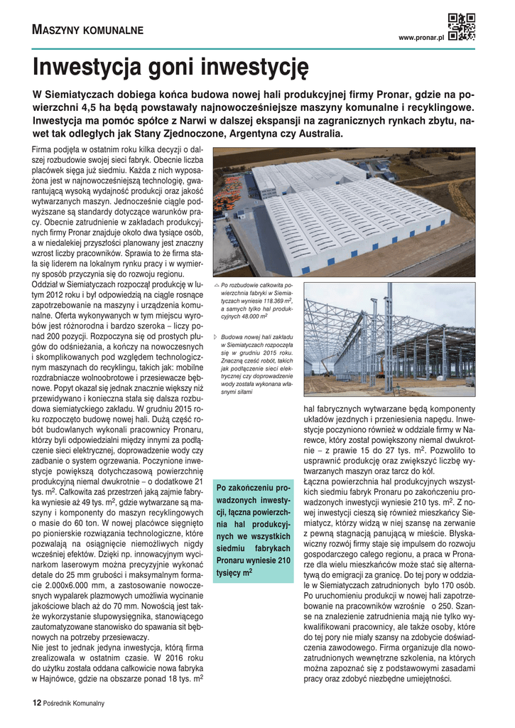 MASZYNY KOMUNALNE www.pronar.pl Inwestycja goni inwestycję W Siemiatyczach dobiega końca budowa nowej hali produkcyjnej firmy Pronar, gdzie na powierzchni 4,5 ha będą powstawały najnowocześniejsze maszyny komunalne i recyklingowe. Inwestycja ma pomóc spółce z Narwi w dalszej ekspansji na zagranicznych rynkach zbytu, nawet tak odległych jak Stany Zjednoczone, Argentyna czy Australia. Firma podjęła w ostatnim roku kilka decyzji o dalszej rozbudowie swojej sieci fabryk. Obecnie liczba placówek sięga już siedmiu. Każda z nich wyposażona jest w najnowocześniejszą technologię, gwarantującą wysoką wydajność produkcji oraz jakość wytwarzanych maszyn. Jednocześnie ciągle podwyższane są standardy dotyczące warunków pracy. Obecnie zatrudnienie w zakładach produkcyjnych firmy Pronar znajduje około dwa tysiące osób, a w niedalekiej przyszłości planowany jest znaczny wzrost liczby pracowników. Sprawia to że firma stała się liderem na lokalnym rynku pracy i w wymierny sposób przyczynia się do rozwoju regionu. Oddział w Siemiatyczach rozpoczął produkcję w lutym 2012 roku i był odpowiedzią na ciągle rosnące zapotrzebowanie na maszyny i urządzenia komunalne. Oferta wykonywanych w tym miejscu wyrobów jest różnorodna i bardzo szeroka – liczy ponad 200 pozycji. Rozpoczyna się od prostych pługów do odśnieżania, a kończy na nowoczesnych i skomplikowanych pod względem technologicznym maszynach do recyklingu, takich jak: mobilne rozdrabniacze wolnoobrotowe i przesiewacze bębnowe. Popyt okazał się jednak znacznie większy niż przewidywano i konieczna stała się dalsza rozbudowa siemiatyckiego zakładu. W grudniu 2015 roku rozpoczęto budowę nowej hali. Dużą część robót budowlanych wykonali pracownicy Pronaru, którzy byli odpowiedzialni między innymi za podłączenie sieci elektrycznej, doprowadzenie wody czy zadbanie o system ogrzewania. Poczynione inwestycje powiększą dotychczasową powierzchnię produkcyjną niemal dwukrotnie – o dodatkowe 21 tys. m2. Całkowita zaś przestrzeń jaką zajmie fabryka wyniesie aż 49 tys. m2, gdzie wytwarzane są maszyny i komponenty do maszyn recyklingowych o masie do 60 ton. W nowej placówce sięgnięto po pionierskie rozwiązania technologiczne, które pozwalają na osiągnięcie niemożliwych nigdy wcześniej efektów. Dzięki np. innowacyjnym wycinarkom laserowym można precyzyjnie wykonać detale do 25 mm grubości i maksymalnym formacie 2.000x6.000 mm, a zastosowanie nowoczesnych wypalarek plazmowych umożliwia wycinanie jakościowe blach aż do 70 mm. Nowością jest także wykorzystanie słupowysięgnika, stanowiącego zautomatyzowane stanowisko do spawania sit bębnowych na potrzeby przesiewaczy. Nie jest to jednak jedyna inwestycja, którą firma zrealizowała w ostatnim czasie. W 2016 roku do użytku została oddana całkowicie nowa fabryka w Hajnówce, gdzie na obszarze ponad 18 tys. m2 12 Pośrednik Komunalny a Po rozbudowie całkowita powierzchnia fabryki w Siemiatyczach wyniesie 118.369 m2, a samych tylko hal produkcyjnych 48.000 m2 f Budowa nowej hali zakładu w Siemiatyczach rozpoczęła się w grudniu 2015 roku. Znaczną cześć robót, takich jak podłączenie sieci elektrycznej czy doprowadzenie wody została wykonana własnymi siłami Po zakończeniu prowadzonych inwestycji, łączna powierzchnia hal produkcyjnych we wszystkich siedmiu fabrykach Pronaru wyniesie 210 tysięcy m2 hal fabrycznych wytwarzane będą komponenty układów jezdnych i przeniesienia napędu. Inwestycje poczyniono również w oddziale firmy w Narewce, który został powiększony niemal dwukrotnie – z prawie 15 do 27 tys. m2. Pozwoliło to usprawnić produkcję oraz zwiększyć liczbę wytwarzanych maszyn oraz tarcz do kół. Łączna powierzchnia hal produkcyjnych wszystkich siedmiu fabryk Pronaru po zakończeniu prowadzonych inwestycji wyniesie 210 tys. m2. Z nowej inwestycji cieszą się również mieszkańcy Siemiatycz, którzy widzą w niej szansę na zerwanie z pewną stagnacją panującą w mieście. Błyskawiczny rozwój firmy staje się impulsem do rozwoju gospodarczego całego regionu, a praca w Pronarze dla wielu mieszkańców może stać się alternatywą do emigracji za granicę. Do tej pory w oddziale w Siemiatyczach zatrudnionych było 170 osób. Po uruchomieniu produkcji w nowej hali zapotrzebowanie na pracowników wzrośnie do 250. Szanse na znalezienie zatrudnienia mają nie tylko wykwalifikowani pracownicy, ale także osoby, które do tej pory nie miały szansy na zdobycie doświadczenia zawodowego. Firma organizuje dla nowozatrudnionych wewnętrzne szkolenia, na których można zapoznać się z podstawowymi zasadami pracy oraz zdobyć niezbędne umiejętności.