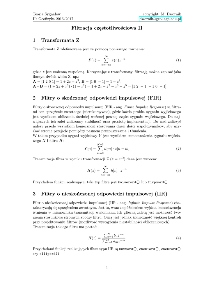 Teoria Sygnałów IIr Geofizyka 2016/2017 copyright: M. Dwornik [email protected] Filtracja częstotliwościowa II 1 Transformata Z Transformata Z zdefiniowana jest za pomocą poniższego równania: ∞ X F (z) = x(n)z −n (1) n=−∞ gdzie z jest zmienną zespoloną. Korzystając z transformaty, filtrację można zapisać jako iloczyn dwóch widm Z, np.: A = [1 2 0 1] = 1 + 2z + z 3 , B = [1 0 − 1] = 1 − z 2 , A ∗ B = (1 + 2z + z 3 ) · (1 − z 2 ) = 1 + 2z − z 2 − z 3 − z 5 = [1 2 − 1 − 1 0 − 1] 2 Filtry o skończonej odpowiedzi impulsowej (FIR) Filtry o skonczonej odpowiedzi impulsowej (FIR - ang. Finite Impulse Response) są filtrami bez sprzężenie zwrotnego (nierekursywne), gdzie każda próbka sygnału wyjściowego jest wynikiem obliczenia średniej ważonej pewnej części sygnału wejściowego. Do największych ich zalet zaliczamy stabilność oraz prostotę implementacji. Do wad zaliczyć należy przede wszystkim konieczność stosowania dużej ilości współczynników, aby uzyskać strome przejście pomiędzy pasmem przepuszczania i tłumienia. W takim przypadku sygnał wyjściowy Y jest wynikiem sumomnożenia sygnału wejściowego X i filtru H: Y [n] = N −1 X h[m] · x[n − m] (2) m=0 Transmitacja filtra w wyniku transformacji Z (z = eiΩ ) dana jest wzorem: H(z) = ∞ X h[n] · z −n (3) n=−∞ Przykładem funkcji realizującej taki typ filtra jest kaiserord() lub firpmord(). 3 Filtry o nieskończonej odpowiedzi impulsowej (IIR) Filtr o nieskończonej odpowiedzi impulsowej (IIR - ang. Infinite Impulse Response) charakteryzują się sprzężeniem zwrotnym. Jest to, wraz z opóźnieniem wyjścia, konsekwencja istnienia w mianowniku transmitacji wielomianu. Ich główną zaletą jest możliwość tworzenia stosunkowo stromych zboczy filtru. Ceną jest jednak konieczność większej kontroli przy projektowaniu filtrów (możliwość wystąpienia niestabilności obliczeniowych). Transmitacja takiego filtru ma postać: PN bn z −n −m m=1 am z H(z) = PMn=1 (4) Przykładami funkcji realizujących filtru typu IIR są buttord(), cheb1ord(), cheb2ord() czy ellipord(). 1 Teoria Sygnałów IIr Geofizyka 2016/2017 4 copyright: M. Dwornik [email protected] Okna Okna w analizie częstotliwościowej stosowane są głównie w dwóch przypadkach: poprawie jakości analizy spektralnej oraz poprawie jakości tworzenia filtrów typu FIR. W obu tych przypadkach mają za zadanie zmniejszenie efektu fenomenu Gibbsa. W pakiecie MatLAB dostępne jest kilkanaście okien czasowych. Ich implementację można albo poprzez wywołanie konkretnej funkcji albo poprzez narzędzie wintool. Do najważniejszych okien zaliczamy: • barthannwin(M) - okno Barletta-Hanna o długości M dane wzorem (dla N=M-1 i n=0:N): n w(n) = 0.62 − 0.48 N − 0.5 + 0.38 cos 2π n − 0.5 N (5) • bartlett(M) - okno Bartletta o długości M dane jest wzorem (dla N=M-1): ( 2n 0 ¬ n ¬ N/2 N, w(n) = 2 − 2n , N/2 ¬n¬N N • blackman(M) - M-punktowe okno Blackmana dane jest wzorem: n w(n) = 0.42 − 0.5 · cos 2π N n + 0.08 · cos 4π N , (6) dla n<N i N=M-1; • bohmanwin(M) - okno Bohmana o długości M ( x - wektor liniowy o długości M o wartościach od -1 do 1) w(x) = (1 − |x|) cos(π|x|) + sin(π|x|) π (7) • czebwin(M,R) - M-punktowe okno Czebyszewa o magnitudzie zbocza R (domyślnie 100 dB). • gausswin(M,α) - okno Gaussowskie (dla m=<-(M-1)/2, (M-1)/2>) −1 w(m) = exp 2 2αm M 2 ! ; σ= M 2α (8) • hamming(M) - M-punktowe okno Hamminga, dane jest wzorem: w(n) = 0.54 − 0.46 cos 2π n N (9) • hann(M) - M-punktowe okno Hanninga n w(n) = 0.5 · 1 − cos 2π N (10) • kaiser(M,beta) - M-punktowe okno Kaisera z parametrem β. Domyślna wartość β = 0.5. • parzenwin(M) - M-punktowe okno Parzena (dla m=<-(M-1)/2, (M-1)/2>) 2 3 1 − 6 2|m| + 6 2|m| M M 3 w(m) = 2|m| 2 1− M 2 dla 0 ¬ |m| ¬ (M − 1)/4 dla (M − 1)/4 < |m| ¬ (M − 1)/2 (11) Teoria Sygnałów IIr Geofizyka 2016/2017 copyright: M. Dwornik [email protected] • rectwin(M) - okno prostokątne. Tożsame z poleceniem ones(M,1). W praktyce oznacza to, że filtr nie jest okienkowany (brak zmian w filtrze); • taylorwin(M) - Okno Taylora, zbliżone efektem do okna Czebyszewa. • triang(M) - okno trójkątne o długości M. Jeżeli M jest nieparzyste jest tożsame z oknem bartletta. 5 Zadania 1. Policz transformatę Z ciągów: y1 [n] = an oraz y2 [n] = (−1)n · an . P n Pamiętaj, że dla |x|<1 prawdziwe jest: ∞ n (x ) = 1/(1 − x); 2. Korzystając z rozwiązania zad.1 i właściwości różniczkowalności szeregów wewnątrz obszarów zbieżności policz transformatę ciągów: y1 [n] = n, y2 [n] = n2 3. Korzystając z metody rozkładu na ułamki proste policz transformatę odwrotną Z: Z(z) = Z(z) = z − z − 2) (12) 8z + 4 − 2z − 3 (13) (z 2 z2 4. Korzystając z narzędzia fdatool porównaj działanie i wygląd wybranych filtrów IIR i FIR. Jako sygnał wejściowy wykorzystaj (T = 10s, Fs = 20Hz): sygnał prostokątny (środek = 5, amp. =√ 1, szer. = 2), sumę sygnałów harmonicznych (amp1.=1, f1=6, amp2.=0.01 f2= 2); 5. Korzystając z narzędzia wintool porównaj wygląd wybranych okien. 6. Sprawdź działanie wybranych okien na wybrane sygnały wejściowe. 3