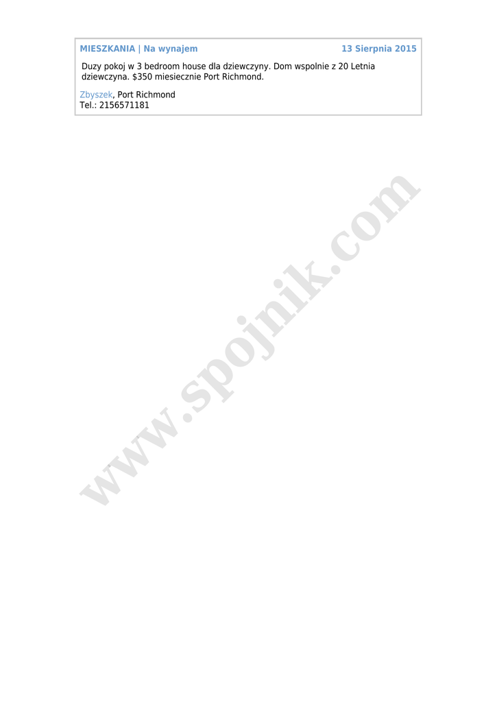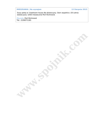MIESZKANIA | Na wynajem 13 Sierpnia 2015 Duzy pokoj w 3 bedroom house dla dziewczyny. Dom wspolnie z 20 Letnia dziewczyna. $350 miesiecznie Port Richmond. w w w .s po jn ik .c o m Zbyszek, Port Richmond Tel.: 2156571181