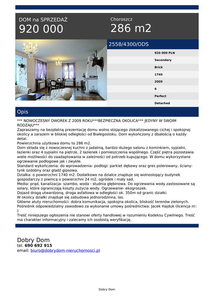 Choroszcz DOM na SPRZEDAŻ 286 m2 920 000 2558/4300/ODS 920 000 PLN Secondary Brick 1740 2009 6 Perfect Detached Opis *** NOWOCZESNY DWOREK Z 2009 ROKU***BEZPIECZNA OKOLICA*** JEDYNY W SWOIM RODZAJU*** Zapraszamy na bezpłatną prezentację domu wolno stojącego zlokalizowanego cichej i spokojnej okolicy a zarazem w bliskiej odległości od Białegostoku. Dom wykończony z dbałością o każdy detal. Powierzchnia użytkowa domu to 286 m2. Dom składa się z nowoczesnej kuchni z jadalnią, bardzo dużego salonu z kominkiem, sypialni, łazienki oraz 4 sypialni na piętrze, 2 łazienek i pomieszczenia wspólnego. Część piętra pozostawia wiele możliwości do zaadaptowania w zależności od potrzeb kupującego. W domu wykorzystane ogrzewanie podłogowe jak i zwykłe. Standard wykończenia: do wprowadzenia- podłogi: parkiet dębowy oraz gres polerowany, ścianytynk ozdobny oraz gładź gipsowa. Działka: o powierzchni 1740 m2. Dodatkowo na działce znajduje się wolnostojący budynek gospodarczy z piwnicą o powierzchni 24 m2, ogródek i mały sad. Media: prąd, kanalizacja- szambo, woda - studnia głębinowa. Do ogrzewania wody zastosowane są solary, które ograniczają koszty zużycia wody. Ogrzewanie- ekogroszek. Dojazd drogą utwardzoną, droga asfaltowa w odległości ok. 350m od granic działki. W okolicy działki znajduje się zabudowa jednorodzinna, las. Główne atuty nieruchomości: dobra komunikacja, spokojna okolica, bliskość terenów zielonych. Pośrednik odpowiedzialny zawodowo za wykonanie umowy pośrednictwa: Jacek Hajduk (licencja nr: ) Treść niniejszego ogłoszenia nie stanowi oferty handlowej w rozumieniu Kodeksu Cywilnego. Treść ma charakter informacyjny i zalecamy ich osobistą weryfikację. Dobry Dom tel. 690 692 915 email: [email protected] Dobry Dom Powered by TCPDF (www.tcpdf.org)