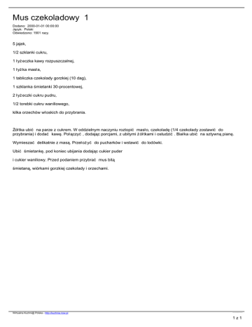 Mus czekoladowy 1 Dodano: 2000-01-01 00:00:00 Język: Polski Odwiedzono: 1901 razy. 5 jajek, 1/2 szklanki cukru, 1 łyżeczka kawy rozpuszczalnej, 1 łyżka masła, 1 tabliczka czekolady gorzkiej (10 dag), 1 szklanka śmietanki 30-procentowej, 2 łyżeczki cukru pudru, 1/2 torebki cukru waniliowego, kilka orzechów włoskich do przybrania. Żółtka ubić na parze z cukrem. W oddzielnym naczyniu roztopić masło, czekoladę (1/4 czekolady zostawić do przybrania) i dodać kawę. Połączyć, dodając porcjami, z ubitymi żółtkami i ostudzić. Białka ubić na sztywną pianę. Wymieszać delikatnie z masą. Przełożyć do pucharków i wstawić do lodówki. Ubić śmietankę, pod koniec ubijania dodając cukier puder i cukier waniliowy. Przed podaniem przybrać mus bitą śmietaną, wiórkami gorzkiej czekolady i orzechami. Wirtualna Kuchni@ Polska - http://kuchnia.now.pl przepis nr 394, plik wygenerowano 2017.03.08 10:22 1z1