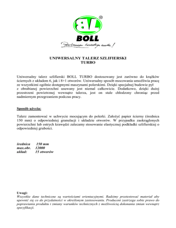 UNIWERSALNY TALERZ SZLIFIERSKI TURBO Uniwersalny talerz szlifierski BOLL TURBO dostosowany jest zarówno do krążków ściernych z układem 6, jak i 8+1 otworów. Uniwersalny sposób mocowania umożliwia pracę ze wszystkimi ogólnie dostępnymi maszynami polerskimi. Dzięki specjalnej budowie pył z obrabianej powierzchni usuwany jest niemal całkowicie. Dodatkowo, dzięki dużej przestrzeni powietrznej wewnątrz talerza, jest on stale chłodzony chroniąc przed nadmiernym przegrzaniem podczas pracy. Sposób użycia: Talerz zamontować w uchwycie mocującym do polerki. Założyć papier ścierny (średnica 150 mm) o odpowiedniej granulacji i układzie otworów. W przypadku zaokrąglonych powierzchni lub ostrych krawędzi zalecamy stosowanie elastycznej podkładki szlifierskiej o odpowiedniej grubości. średnica max.obr. układ: 150 mm 12000 15 otworów Uwagi: Wszystkie dane techniczne są wartościami orientacyjnymi. Radzimy przetestować materiał aby upewnić się co do przydatności w określonym zastosowaniu. Producent zastrzega sobie prawo do poprawiania produktu i zmiany warunków technicznych z możliwością dokonania zmian wewnątrz specyfikacji.