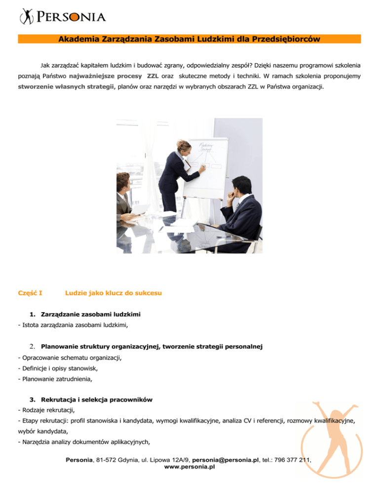 Akademia Zarządzania Zasobami Ludzkimi dla Przedsiębiorców Jak zarządzać kapitałem ludzkim i budować zgrany, odpowiedzialny zespół? Dzięki naszemu programowi szkolenia poznają Państwo najważniejsze procesy ZZL oraz skuteczne metody i techniki. W ramach szkolenia proponujemy stworzenie własnych strategii, planów oraz narzędzi w wybranych obszarach ZZL w Państwa organizacji. Część I Ludzie jako klucz do sukcesu 1. Zarządzanie zasobami ludzkimi - Istota zarządzania zasobami ludzkimi, 2. Planowanie struktury organizacyjnej, tworzenie strategii personalnej - Opracowanie schematu organizacji, - Definicje i opisy stanowisk, - Planowanie zatrudnienia, 3. Rekrutacja i selekcja pracowników - Rodzaje rekrutacji, - Etapy rekrutacji: profil stanowiska i kandydata, wymogi kwalifikacyjne, analiza CV i referencji, rozmowy kwalifikacyjne, wybór kandydata, - Narzędzia analizy dokumentów aplikacyjnych, Personia, 81-572 Gdynia, ul. Lipowa 12A/9, [email protected], tel.: 796 377 211, www.personia.pl - Zadania symulacyjne 4. Wprowadzenie nowych pracowników do organizacji 5. Motywowanie - Rodzaje motywacji – indywidualne uwarunkowania, - Motywacja finansowa oraz pozafinansowa, - Tworzenie systemów motywacyjnych, - Nagradzanie pracowników, 6. Oceny okresowe - Cel oceny, - Narzędzia i kryteria oceny, - Błędy w ocenianiu - Badanie satysfakcji z pracy Część II Rozwój ludzi i organizacji 1. Szkolenia - Identyfikacja potrzeb szkoleniowych, - Ewaluacja szkoleń, 2. Organizacja ucząca się - Czym jest? - Pięć wartości: mistrzostwo osobiste, modele myślowe, wspólna wizja, zespołowe uczenie się, myślenie systemowe, 3. Budowanie zespołu (teambuilding) - Metody i techniki, - Regulamin pracowniczy, 4. Sytuacje kryzysowe – jak sobie z nimi radzić i im przeciwdziałać? - Stres w miejscu pracy, - Wypalenie zawodowe, - Zwolnienia pracowników, - Zarządzanie konfliktem Personia, 81-572 Gdynia, ul. Lipowa 12A/9, [email protected], tel.: 796 377 211, www.personia.pl