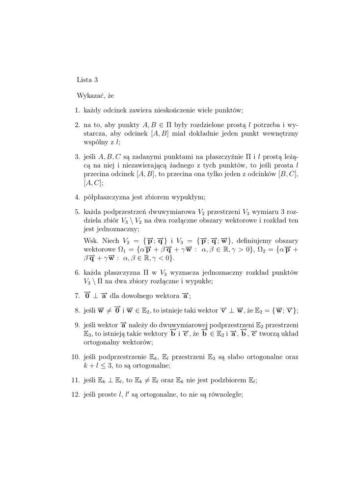 5. każda podprzestrzeń dwuwymiarowa V2 przestrzeni V3 wymiaru 3 rozdziela zbiór V3 \ V2 na dwa rozłączne obszary wektorowe i rozkład ten
