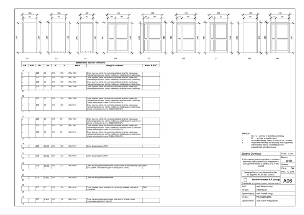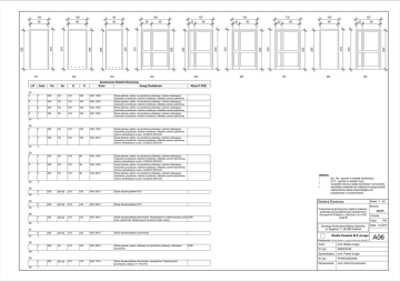 L/P D2 Ilość Ho So D3 H S D4 Zestawienie Stolarki Drzwiowej Kolor Uwagi Dodatkowe D1 L 1 205 90 210 100 RAL 1003 P 1 205 90 210 100 RAL 1003 L 4 205 90 210 100 RAL 7030 P 1 205 90 210 100 RAL 7030 D1 7 D2 L 1 205 90 210 100 RAL 7030 L 1 205 90 210 100 RAL 9010 D2 2 D3 L 1 205 80 210 90 RAL 1003 P 1 205 80 210 90 RAL 1003 L 1 205 80 210 90 RAL 9010 D3 3 D5 Drzwi płytowe, pełne, na oscieżnicy stalowej z ramka maskującą; malowane proszkowo; klamka metalowa; wkładka zamek łazienkowy, otwory wentylacyjne o pow. 0,022m2 (50m3/h) Drzwi płytowe, pełne, na oscieżnicy stalowej z ramka maskującą; malowane proszkowo; klamka metalowa; wkładka zamek łazienkowy, otwory wentylacyjne o pow. 0,022m2 (50m3/h) Drzwi płytowe, pełne, na oscieżnicy stalowej z ramka maskującą; malowane proszkowo; klamka metalowa; wkładka zamek łazienkowy, otwory wentylacyjne o pow. 0,022m2 (50m3/h) 1 1 205 140 90+50 210 150 RAL 9010 Drzwi dwuskrzydłowe PCV 1 1 205 122 90+32 210 132 RAL 9010 Drzwi dwuskrzydłowe PCV 1 205 122 90+32 210 132 RAL 9010 Drzwi dwuskrzydłowe aluminiowe. Wyposażone w elektrozaczep p.poż EI60 oraz czytnik kart zbliżeniowych od strony Hallu szkoły. D7 90 D8 205 210 210 205 205 210 32 D9 So, Ho - wymiar w świetle ościerznicy S, H - wymiar w świetle muru wszystkie otwory należy domierzyć na budowie wszystkie materiały do realizacji muszą posiadć odpowiednie atesty stwierdzające ich przydatność w budownictwie. Dyrekcja Rozbudowy Miasta Gdańska, ul. Żaglowa 11, 80-560 Gdańsk 1 1 205 122 90+32 210 132 RAL 9010 Pracownia: 90 210 100 RAL 9010 Drzwi płytowe, pełne, stalowen na ościeżnicy stalowej; malowane proszkowo 1 1 EI60 80-150 Gdańsk ul. Legnicka 15/6 tel./fax. 660-80-27 Autor: arch. Beata Jurago Nr Upr.: 5969/GD/94 Sprawdzający: arch. Paweł Jurago D9 1 205 122 90+32 210 132 RAL 7016 Data: 12.2015 Drzwi dwuskrzydłowe aluminiowe Studio Kwadrat B.P.Jurago 205 Skala: 1 : 50 Branża: Przebudowa sali gimnastycznej i zaplecza szatniowo arch. sanitarnego oraz docieplenie ścian zewnętrznych w Gimnazjum Nr 8 Gdańsk, ul. Żabi Kruk 5, dz. nr 200, Umowa: obręb 99 Faza: PW 1 1 D9 90 Stolarka Drzwiowa D8 D8 D6 90 UWAGA: • • • • D7 D7 32 Drzwi płytowe, pełne, na oscieżnicy stalowej z ramka maskującą; malowane proszkowo; klamka metalowa; wkładka zamek patentowy, otwory wentylacyjne o pow. 0,022m2 (50m3/h) Drzwi płytowe, pełne, na oscieżnicy stalowej z ramka maskującą; malowane proszkowo; klamka metalowa; wkładka zamek patentowy, otwory wentylacyjne o pow. 0,022m2 (50m3/h) D6 D6 90 132 Drzwi płytowe, pełne, na oscieżnicy stalowej z ramka maskującą; malowane proszkowo; klamka metalowa; wkładka zamek patentowy Drzwi płytowe, pełne, na oscieżnicy stalowej z ramka maskującą; malowane proszkowo; klamka metalowa; wkładka zamek patentowy Drzwi płytowe, pełne, na oscieżnicy stalowej z ramka maskującą; malowane proszkowo; klamka metalowa; wkładka zamek patentowy Drzwi płytowe, pełne, na oscieżnicy stalowej z ramka maskującą; malowane proszkowo; klamka metalowa; wkładka zamek patentowy D5 D5 32 100 Klasa P.POŻ. D4 D4 90 132 205 32 210 90 132 210 205 205 205 D1 50 205 80 205 90 132 210 90 150 210 90 210 100 210 100 Drzwi dwuskrzydłowe aluminiowe, zewnętrzne; Współczynnik przenikania ciepła U=1.1W/m²K; Nr Upr.: PO/KK/205/2008 Opracowanie: arch. Karol Wyrzykowski A06