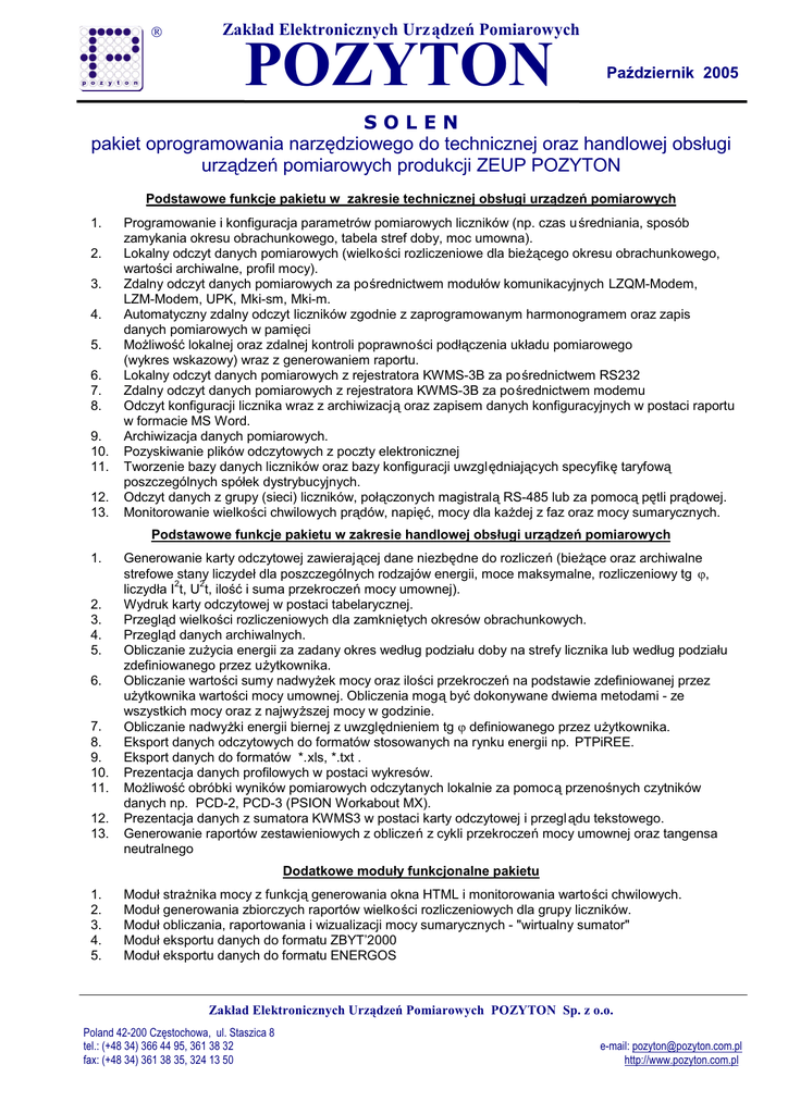 POZYTON Zakład Elektronicznych Urządzeń Pomiarowych Październik 2005 SOLEN pakiet oprogramowania narzędziowego do technicznej oraz handlowej obsługi urządzeń pomiarowych produkcji ZEUP POZYTON 1. 2. 3. 4. 5. 6. 7. 8. 9. 10. 11. 12. 13. 1. 2. 3. 4. 5. 6. 7. 8. 9. 10. 11. 12. 13. 1. 2. 3. 4. 5. Podstawowe funkcje pakietu w zakresie technicznej obsługi urządzeń pomiarowych Programowanie i konfiguracja parametrów pomiarowych liczników (np. czas u średniania, sposób zamykania okresu obrachunkowego, tabela stref doby, moc umowna). Lokalny odczyt danych pomiarowych (wielkości rozliczeniowe dla bieżącego okresu obrachunkowego, wartości archiwalne, profil mocy). Zdalny odczyt danych pomiarowych za pośrednictwem modułów komunikacyjnych LZQM-Modem, LZM-Modem, UPK, Mki-sm, Mki-m. Automatyczny zdalny odczyt liczników zgodnie z zaprogramowanym harmonogramem oraz zapis danych pomiarowych w pamięci Możliwość lokalnej oraz zdalnej kontroli poprawności podłączenia układu pomiarowego (wykres wskazowy) wraz z generowaniem raportu. Lokalny odczyt danych pomiarowych z rejestratora KWMS-3B za pośrednictwem RS232 Zdalny odczyt danych pomiarowych z rejestratora KWMS-3B za pośrednictwem modemu Odczyt konfiguracji licznika wraz z archiwizacją oraz zapisem danych konfiguracyjnych w postaci raportu w formacie MS Word. Archiwizacja danych pomiarowych. Pozyskiwanie plików odczytowych z poczty elektronicznej Tworzenie bazy danych liczników oraz bazy konfiguracji uwzględniających specyfikę taryfową poszczególnych spółek dystrybucyjnych. Odczyt danych z grupy (sieci) liczników, połączonych magistralą RS-485 lub za pomocą pętli prądowej. Monitorowanie wielkości chwilowych prądów, napięć, mocy dla każdej z faz oraz mocy sumarycznych. Podstawowe funkcje pakietu w zakresie handlowej obsługi urządzeń pomiarowych Generowanie karty odczytowej zawierającej dane niezbędne do rozliczeń (bieżące oraz archiwalne strefowe stany liczydeł dla poszczególnych rodzajów energii, moce maksymalne, rozliczeniowy tg M, 2 2 liczydła I t, U t, ilość i suma przekroczeń mocy umownej). Wydruk karty odczytowej w postaci tabelarycznej. Przegląd wielkości rozliczeniowych dla zamkniętych okresów obrachunkowych. Przegląd danych archiwalnych. Obliczanie zużycia energii za zadany okres według podziału doby na strefy licznika lub według podziału zdefiniowanego przez użytkownika. Obliczanie wartości sumy nadwyżek mocy oraz ilości przekroczeń na podstawie zdefiniowanej przez użytkownika wartości mocy umownej. Obliczenia mogą być dokonywane dwiema metodami - ze wszystkich mocy oraz z najwyższej mocy w godzinie. Obliczanie nadwyżki energii biernej z uwzględnieniem tg M definiowanego przez użytkownika. Eksport danych odczytowych do formatów stosowanych na rynku energii np. PTPiREE. Eksport danych do formatów *.xls, *.txt . Prezentacja danych profilowych w postaci wykresów. Możliwość obróbki wyników pomiarowych odczytanych lokalnie za pomocą przenośnych czytników danych np. PCD-2, PCD-3 (PSION Workabout MX). Prezentacja danych z sumatora KWMS3 w postaci karty odczytowej i przegl ądu tekstowego. Generowanie raportów zestawieniowych z obliczeń z cykli przekroczeń mocy umownej oraz tangensa neutralnego Dodatkowe moduły funkcjonalne pakietu Moduł strażnika mocy z funkcją generowania okna HTML i monitorowania wartości chwilowych. Moduł generowania zbiorczych raportów wielkości rozliczeniowych dla grupy liczników. Moduł obliczania, raportowania i wizualizacji mocy sumarycznych - "wirtualny sumator" Moduł eksportu danych do formatu ZBYT’2000 Moduł eksportu danych do formatu ENERGOS Zakład Elektronicznych Urządzeń Pomiarowych POZYTON Sp. z o.o. Poland 42-200 Częstochowa, ul. Staszica 8 tel.: (+48 34) 366 44 95, 361 38 32 fax: (+48 34) 361 38 35, 324 13 50 e-mail: [email protected] http://www.pozyton.com.pl