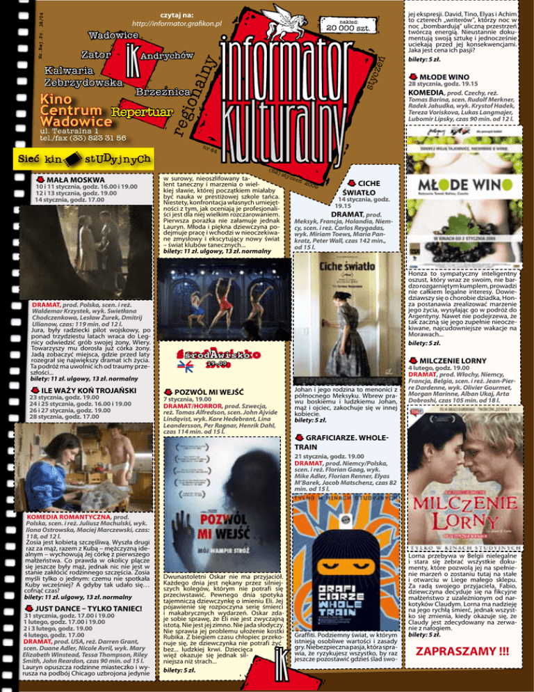 Zator Kino Centrum Wadowice sty cze n Kalwaria Zebrzydowska ‘ Nr.Rej.Pr. 38/04 czytaj na: http://informator.grafikon.pl ' Brzeznica jej ekspresji. David, Tino, Elyas i Achim to czterech „writerów”, którzy noc w noc „bombardują” uliczną przestrzeń twórczą energią. Nieustannie dokumentują swoją sztukę i jednocześnie uciekają przed jej konsekwencjami. Jaka jest cena ich pasji? bilety: 5 zł. MŁODE WINO 28 stycznia, godz. 19.15 komedia , prod. Czechy, reż. Tomas Barina, scen. Rudolf Merkner, Radek Jahudka, wyk. Krystof Hadek, Tereza Voriskova, Lukas Langmajer, Lubomir Lipsky, czas 90 min. od 12 l. ul. Teatralna 1 tel./fax (33) 823 31 56 nr 44 (52 10 i 11 stycznia, godz. 16.00 i 19.00 12 i 13 stycznia, godz. 19.00 14 stycznia, godz. 17.00 dramat, prod. Polska, scen. i reż. Waldemar Krzystek, wyk. Swietłana Chodczenkowa, Lesław Żurek, Dmitrij Ulianow, czas: 119 min. od 12 l. Jura, były radziecki pilot wojskowy, po ponad trzydziestu latach wraca do Legnicy odwiedzić grób swojej żony, Wiery. Towarzyszy mu dorosła już córka żony. Jadą zobaczyć miejsca, gdzie przed laty rozegrał się największy dramat ich życia. Ta podróż ma uwolnić ich od traumy przeszłości... bilety: 11 zł. ulgowy, 13 zł. normalny ILE WAŻY KOŃ TROJAŃSKI 23 stycznia, godz. 19.00 24 i 25 stycznia, godz. 16.00 i 19.00 26 i 27 stycznia, godz. 19.00 28 stycznia, godz. 17.00 ) st ycz w surowy, nieoszlifowany taen 200 CICHE lent taneczny i marzenia o wiel9 kiej sławie, której początkiem miałaby ŚWIATŁO być nauka w prestiżowej szkole tańca. 14 stycznia, godz. Niestety, konfrontacja własnych umiejęt19.15 ności z tym, jak oceniają je profesjonaliści jest dla niej wielkim rozczarowaniem. dramat, prod. Pierwsza porażka nie załamuje jednak Meksyk, Francja, Holandia, NiemLauryn. Młoda i piękna dziewczyna pocy, scen. i reż. Carlos Reygadas, dejmuje pracę i wchodzi w nieoczekiwawyk. Miriam Toews, Maria Panne zmysłowy i ekscytujący nowy świat kratz, Peter Wall, czas 142 min., – świat klubów tanecznych... od 15 l. bilety: 11 zł. ulgowy, 13 zł. normalny ‘ MAŁA MOSKWA Honza to sympatyczny inteligentny oszust, który wraz ze swoim, nie bardzo rozgarniętym kumplem, prowadzi nie całkiem legalne interesy. Dowiedziawszy się o chorobie dziadka, Honza postanawia zrealizować marzenie jego życia, wysyłając go w podróż do Argentyny. Nawet nie podejrzewa, że tak zaczną się jego zupełnie nieoczekiwane, najcudowniejsze wakacje na Morawach... bilety: 5 zł. ğURG $ ZLVNR MILCZENIE LORNY POZWÓL MI WEJŚĆ 7 stycznia, 19.00 dramat/horror, prod. Szwecja, reż. Tomas Alfredson, scen. John Ajvide Lindqvist, wyk. Kare Hedebrant, Lina Leandersson, Per Ragnar, Henrik Dahl, czas 114 min. od 15 l. Johan i jego rodzina to menonici z północnego Meksyku. Wbrew prawu boskiemu i ludzkiemu Johan, mąż i ojciec, zakochuje się w innej kobiecie. bilety: 5 zł. 4 lutego, godz. 19.00 dramat, prod. Włochy, Niemcy, Francja, Belgia, scen. i reż. Jean-Pierre Dardenne, wyk. Olivier Gourmet, Morgan Marinne, Alban Ukaj, Arta Dobroshi, czas 105 min. od 18 l. GRAFICIARZE. WHOLETRAIN 21 stycznia, godz. 19.00 dramat, prod. Niemcy/Polska, scen. i reż. Florian Gaag, wyk. Mike Adler, Florian Renner, Elyas M’Barek, Jacob Matschenz, czas 82 min. od 15 l. komedia romantyczna, prod. Polska, scen. i reż. Juliusz Machulski, wyk. Ilona Ostrowska, Maciej Marczewski, czas: 118, od 12 l. Zosia jest kobietą szczęśliwą. Wyszła drugi raz za mąż, razem z Kubą – mężczyzną idealnym – wychowują Jej córkę z pierwszego małżeństwa. Co prawda w okolicy plącze się jeszcze były mąż, jednak nic nie jest w stanie zakłócić rodzinnego szczęścia. Zosia myśli tylko o jednym: czemu nie spotkała Kuby wcześniej? A gdyby tak udało się… cofnąć czas? bilety: 11 zł. ulgowy, 13 zł. normalny JUST DANCE – TYLKO TANIEC! 31 stycznia, godz. 17.00 i 19.00 1 lutego, godz. 17.00 i 19.00 2 i 3 lutego, godz. 19.00 4 lutego, godz. 17.00 dramat, prod. USA, reż. Darren Grant, scen. Duane Adler, Nicole Avril, wyk. Mary Elizabeth Winstead, Tessa Thompson, Riley Smith, John Reardon, czas 90 min. od 15 l. Lauryn opuszcza rodzinne miasteczko i wyrusza na podbój Chicago uzbrojona jedynie Dwunastoletni Oskar nie ma przyjaciół. Każdego dnia jest nękany przez silniejszych kolegów, którym nie potrafi się przeciwstawić. Pewnego dnia spotyka tajemniczą dziewczynkę o imieniu Eli. Jej pojawienie się rozpoczyna serię śmierci i makabrycznych wydarzeń. Oskar zdaje sobie sprawę, że Eli nie jest zwyczajną istotą. Nie jest jej zimno. Nie jada słodyczy. Nie sprawia jej problemu ułożenie kostki Rubika. Z biegiem czasu chłopiec przekonuje się, że dziewczynka nie potrafi żyć bez... ludzkiej krwi. Dziecięca więź okazuje się jednak silniejsza niż strach... bilety: 5 zł. Graffiti. Podziemny świat, w którym istnieją osobliwe wartości i zasady gry. Niebezpieczna pasja, która sprawia, że ryzykujesz wszystko, by raz jeszcze pozostawić gdzieś ślad swo- Lorna przebywa w Belgii nielegalne i stara się zebrać wszystkie dokumenty, które pozwolą jej na spełnienie marzeń o zostaniu tutaj na stałe i otwarciu w Liege małego sklepu. Za radą swojego przyjaciela, Fabio, dziewczyna decyduje się na fikcyjne małżeństwo z uzależnionym od narkotyków Claudym. Lorna ma nadzieję na jego rychłą śmierć, jednak wszystko się zmienia, kiedy okazuje się, że Claudy jest zdecydowany na zerwanie z nałogiem. bilety: 5 zł. ZAPRASZAMY !!! Wadowickie Centrum Kultury im. Marcina Wadowity IRAN – WYSTAWA FOTOGRAFII IWONY KUKŁY hol teatralny, od 9 do 31 stycznia 2009 IRAN za sprawą doniesień telewizyjnych kojarzy się nam przede wszystkim z bronią atomową, religijnymi rządami ajatollahów oraz z islamem ukazywanym z tej najgorszej perspektywy. Tymczasem Iwona Kukla, autorka wystawy „IRAN” zabiera nas w podróż po kraju pełnym baśniowych krajobrazów. Widzimy, więc urzekającą arch