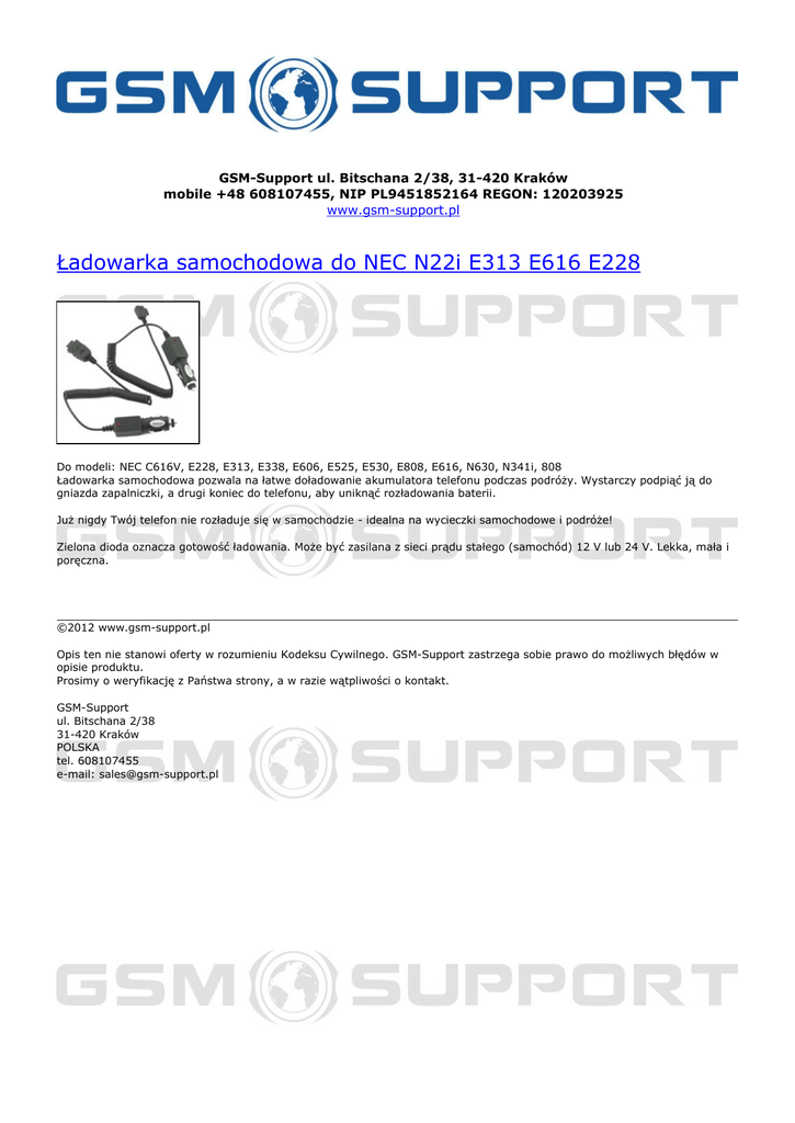 GSM-Support ul. Bitschana 2/38, 31-420 Kraków mobile +48 608107455, NIP PL9451852164 REGON: 120203925 www.gsm-support.pl Ładowarka samochodowa do NEC N22i E313 E616 E228 Do modeli: NEC C616V, E228, E313, E338, E606, E525, E530, E808, E616, N630, N341i, 808 Ładowarka samochodowa pozwala na łatwe doładowanie akumulatora telefonu podczas podróży. Wystarczy podpiąć ją do gniazda zapalniczki, a drugi koniec do telefonu, aby uniknąć rozładowania baterii. Już nigdy Twój telefon nie rozładuje się w samochodzie - idealna na wycieczki samochodowe i podróże! Zielona dioda oznacza gotowość ładowania. Może być zasilana z sieci prądu stałego (samochód) 12 V lub 24 V. Lekka, mała i poręczna. ©2012 www.gsm-support.pl Opis ten nie stanowi oferty w rozumieniu Kodeksu Cywilnego. GSM-Support zastrzega sobie prawo do możliwych błędów w opisie produktu. Prosimy o weryfikację z Państwa strony, a w razie wątpliwości o kontakt. GSM-Support ul. Bitschana 2/38 31-420 Kraków POLSKA tel. 608107455 e-mail: [email protected] Powered by TCPDF (www.tcpdf.org)