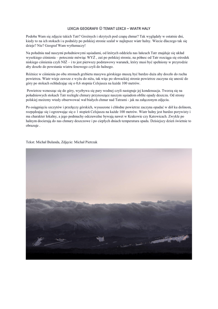 LEKCJA GEOGRAFII TEMAT LEKCJI – WIATR HALY Podoba Wam się zdjęcie takich Tatr? Groźnych i skrytych pod czapą chmur? Tak wyglądały w ostatnie dni, kiedy to na ich stokach i u podnóży po polskiej stronie szalał w najlepsze wiatr halny. Wiecie dlaczego tak się dzieje? Nie? Geograf Wam wytłumaczy! Na południu nad naszymi południowymi sąsiadami, od których oddziela nas łańcuch Tatr znajduje się układ wysokiego ciśnienia – potocznie mówiąc WYŻ , zaś po polskiej stronie, na północ od Tatr rozciąga się ośrodek niskiego ciśnienia czyli NIŻ – i to jest pierwszy podstawowy warunek, który musi być spełniony w przyrodzie aby doszło do powstania wiatru fenowego czyli do halnego. Różnice w ciśnieniu po obu stronach grzbietu masywu górskiego muszą być bardzo duża aby doszło do ruchu powietrza. Wiatr wieje zawsze z wyżu do niżu, tak więc po słowackiej stronie powietrze zaczyna się unosić do góry po stokach ochładzając się o 0,6 stopnia Celsjusza na każde 100 metrów. Powietrze wznosząc się do góry, wyzbywa się pary wodnej czyli następuje jej kondensacja. Tworzą się na południowych stokach Tatr rozległe chmury przynoszące naszym sąsiadom obfite opady deszczu. Od strony polskiej możemy wtedy obserwować wał białych chmur nad Tatrami - jak na załączonym zdjęciu. Po osiągnięciu szczytów i przełęczy górskich, wysuszone i chłodne powietrze zaczyna opadać w dół ku dolinom, rozpędzając się i ogrzewając się o 1 stopień Celsjusza na każde 100 metrów. Wiatr halny jest bardzo porywisty i ma charakter lokalny, a jego podmuchy odczuwalne bywają nawet w Krakowie czy Katowicach. Zwykle po halnym docierają do nas chmury deszczowe i po ciepłych dniach temperatura spada. Dzisiejszy dzień świetnie to obrazuje . Tekst: Michał Bulanda, Zdjęcie: Michał Pietrzak