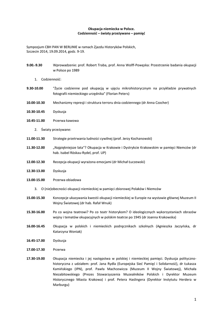 Okupacja niemiecka w Polsce. Codzienność – światy przeżywane – pamięć Sympozjum CBH PAN W BERLINIE w ramach Zjazdu Historyków Polskich, Szczecin 2014, 19.09.2014, godz. 9-19. 9.00.-9.30 1. Wprowadzenie: prof. Robert Traba, prof. Anna Wolff-Powęska: Przestrzenie badania okupacji w Polsce po 1989 Codzienność: 9.30-10.00 "Życie codzienne pod okupacją w ujęciu mikrohistorycznym na przykładzie prywatnych fotografii niemieckiego urzędnika" (Florian Peters) 10.00-10.30 Mechanizmy represji i struktura terroru dnia codziennego (dr Anna Czocher) 10.30-10.45 Dyskusja 10.45-11.00 Przerwa kawowa 2. Światy przeżywane: 11.00-11.30 Strategie przetrwania ludności cywilnej (prof. Jerzy Kochanowski) 11.30-12.00 „Najpiękniejsze lata“? Okupacja w Krakowie i Dystrykcie Krakowskim w pamięci Niemców (dr hab. Isabel Röskau-Rydel, prof. UP) 12.00-12.30 Recepcja okupacji wyrażona emocjami (dr Michał Łuczewski) 12.30-13.00 Dyskusja 13.00-15.00 Przerwa obiadowa 3. O (nie)obecności okupacji niemieckiej w pamięci zbiorowej Polaków i Niemców 15.00-15.30 Koncepcje ukazywania kwestii okupacji niemieckiej w Europie na wystawie głównej Muzeum II Wojny Światowej (dr hab. Rafał Wnuk) 15.30-16.00 Po co wojna teatrowi? Po co teatr historykom? O ideologicznych wykorzystaniach obrazów wojny i tematów okupacyjnych w polskim teatrze po 1945 (dr Joanna Krakowska) 16.00-16.45 Okupacja w polskich i niemieckich podręcznikach szkolnych (Agnieszka Jaczyńska, dr Katarzyna Woniak) 16.45-17.00 Dyskusja 17.00-17.30 Przerwa 17.30-19.00 Okupacja niemiecka i jej następstwa w polskiej i niemieckiej pamięci. Dyskusja politycznohistoryczna z udziałem: prof. Jana Rydla (Europejska Sieć Pamięć i Solidarność), dr Łukasza Kamińskiego (IPN), prof. Pawła Machcewicza (Muzeum II Wojny Światowej), Michała Niezabitowskiego (Prezes Stowarzyszenia Muzealników Polskich i Dyrektor Muzeum Historycznego Miasta Krakowa) i prof. Petera Haslingera (Dyrektor Instytutu Herdera w Marburgu) 1