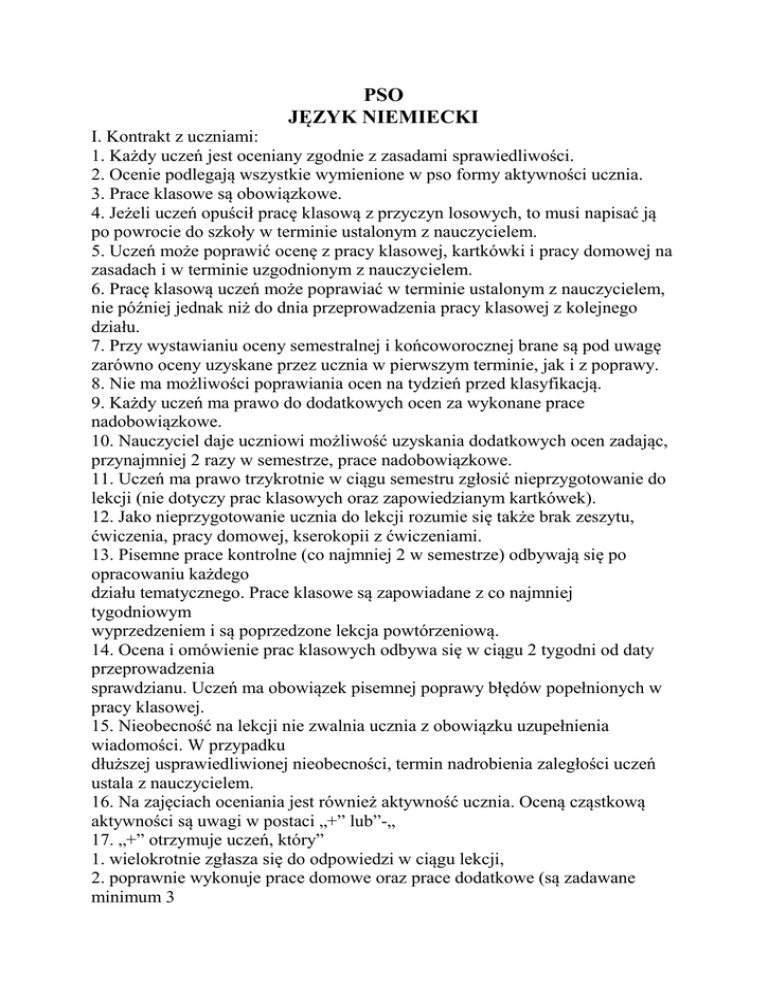 PSO JĘZYK NIEMIECKI I. Kontrakt z uczniami: 1. Każdy uczeń jest oceniany zgodnie z zasadami sprawiedliwości. 2. Ocenie podlegają wszystkie wymienione w pso formy aktywności ucznia. 3. Prace klasowe są obowiązkowe. 4. Jeżeli uczeń opuścił pracę klasową z przyczyn losowych, to musi napisać ją po powrocie do szkoły w terminie ustalonym z nauczycielem. 5. Uczeń może poprawić ocenę z pracy klasowej, kartkówki i pracy domowej na zasadach i w terminie uzgodnionym z nauczycielem. 6. Pracę klasową uczeń może poprawiać w terminie ustalonym z nauczycielem, nie później jednak niż do dnia przeprowadzenia pracy klasowej z kolejnego działu. 7. Przy wystawianiu oceny semestralnej i końcoworocznej brane są pod uwagę zarówno oceny uzyskane przez ucznia w pierwszym terminie, jak i z poprawy. 8. Nie ma możliwości poprawiania ocen na tydzień przed klasyfikacją. 9. Każdy uczeń ma prawo do dodatkowych ocen za wykonane prace nadobowiązkowe. 10. Nauczyciel daje uczniowi możliwość uzyskania dodatkowych ocen zadając, przynajmniej 2 razy w semestrze, prace nadobowiązkowe. 11. Uczeń ma prawo trzykrotnie w ciągu semestru zgłosić nieprzygotowanie do lekcji (nie dotyczy prac klasowych oraz zapowiedzianym kartkówek). 12. Jako nieprzygotowanie ucznia do lekcji rozumie się także brak zeszytu, ćwiczenia, pracy domowej, kserokopii z ćwiczeniami. 13. Pisemne prace kontrolne (co najmniej 2 w semestrze) odbywają się po opracowaniu każdego działu tematycznego. Prace klasowe są zapowiadane z co najmniej tygodniowym wyprzedzeniem i są poprzedzone lekcja powtórzeniową. 14. Ocena i omówienie prac klasowych odbywa się w ciągu 2 tygodni od daty przeprowadzenia sprawdzianu. Uczeń ma obowiązek pisemnej poprawy błędów popełnionych w pracy klasowej. 15. Nieobecność na lekcji nie zwalnia ucznia z obowiązku uzupełnienia wiadomości. W przypadku dłuższej usprawiedliwionej nieobecności, termin nadrobienia zaległości uczeń ustala z nauczycielem. 16. Na zajęciach oceniania jest również aktywność ucznia. Oceną cząstkową aktywności są uwagi w postaci „+” lub”-„ 17. „+” otrzymuje uczeń, który” 1. wielokrotnie zgłasza się do odpowiedzi w ciągu lekcji, 2. poprawnie wykonuje prace domowe oraz prace dodatkowe (są zadawane minimum 3 razy w ciągu semestru) 3. przygotowuje pomoce dydaktyczne( tabele, gazetki, plakaty..), 4. poprawnie wykonuje ćwiczenia na lekcji. „-” otrzymuje uczeń, który: 5. zapytany w czasie lekcji, kilkakrotnie nie potrafi udzielić odpowiedzi, 6. nie posiada materiałów niezbędnych do pracy na lekcji, (podręcznik, zeszyt przedmiotowy, zeszyt ćwiczeń, odbitka ksero..). Po otrzymaniu trzech „+” uczeń otrzymuje ocenę bardzo dobrą za aktywność na zajęciach. Po otrzymaniu trzech „-‘’ uczeń otrzymuje ocenę niedostateczną. . 18.. Ocena końcowa jest wystawiana na podstawie ocen cząstkowych za każdą sprawność językową: rozumienie ze słuchu, mówienie, czytanie ze zrozumieniem i pisanie. Sprawności te mogą być sprawdzane za pomocą następujących form: • odpowiedź ustna • aktywność na lekcji • zadania domowe • kartkówka z aktualnego materiału • praca klasowa z poszczególnych rozdziałów tematycznych 19. Pisemne formy testów i sprawdzianów są oceniane zgodnie z wymaganą ilością punktów na daną ocenę według następującej skali: Poniżej 40%- ocena niedostateczna 40%- 54%- ocena dopuszczająca 55%- 70%- ocena dostateczna 71%- 84%- ocena dobra 85%- 100%- ocena bardzo dobra powyżej 100%- ocena celująca Uczeń może uzyskać ocenę celującą ze sprawdzianu, jeśli poprawnie wykona wszystkie zadania, zawarte w teście oraz dodatkowe nieobowiązkowe zadania półotwarte lub otwarte, punktowane dodatkowo. 20. Brak zdolności artystycznych ucznia, np. w zakresie rysowania, śpiewania, nie ma wpływu na ocenę wykonanego zadania, jeśli cel zadania został przez niego zrealizowany, a uczeń wykazywał duże zaangażowanie w wykonanie zadania. 21. Ocena ucznia powinna być adekwatna do jego możliwości intelektualnych. Zaangażowanie uczniów w pracę, motywacja do nauki powinny znaleźć odzwierciedlenie w wyższej ocenie. 22.Udział w konkursach przedmiotowych, w zależności od uzyskanych wyników, wpływa na podwyższenie oceny końcowej.. 22.Nieprzygotowanie do pracy klasowej jest przyjmowane jedynie w przypadku dłuższej choroby lub wydarzeń losowych potwierdzonych przez rodziców (prawnych opiekunów) lub wychowawcę. W przypadku nieobecności ucznia na pracy klasowej, uczeń ma obowiązek napisać ją w wyznaczonym przez nauczyciela terminie. Sylwia Włodarczyk Podpis rodzica: …............................. Podpis ucznia ...................................