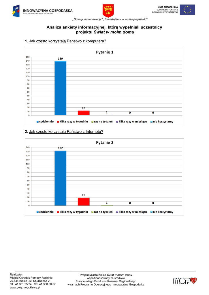 „Dotacje na innowacje” „Inwestujemy w waszą przyszłość” Analiza ankiety informacyjnej, którą wypełniali uczestnicy projektu Świat w moim domu 1. Jak często korzystają Państwo z komputera? 2. Jak często korzystają Państwo z Internetu? Realizator: Miejski Ośrodek Pomocy Rodzinie 25-544 Kielce , ul. Studzienna 2 tel. 41 331 25 24, fax. 41 368 50 57 www.poig.mopr.kielce.pl Realizator Projekt Miasta Kielce Świat w moim domu współfinansowany ze środków Europejskiego Funduszu Rozwoju Regionalnego w ramach Programu Operacyjnego Innowacyjna Gospodarka „Dotacje na innowacje” „Inwestujemy w waszą przyszłość” 3. Czy korzystacie Państwo z pakietu biurowego Open Office? 4. Czy uważają Państwo, że dzięki korzystaniu z Internetu poszerzyła się wasza wiedza i zainteresowania? Realizator: Miejski Ośrodek Pomocy Rodzinie 25-544 Kielce , ul. Studzienna 2 tel. 41 331 25 24, fax. 41 368 50 57 www.poig.mopr.kielce.pl Realizator Projekt Miasta Kielce Świat w moim domu współfinansowany ze środków Europejskiego Funduszu Rozwoju Regionalnego w ramach Programu Operacyjnego Innowacyjna Gospodarka „Dotacje na innowacje” „Inwestujemy w waszą przyszłość” 5. Czy dzięki korzystaniu z Internetu zwiększyły się Państwa szanse związane z poszukiwaniem/ zmianą pracy zawodowej? 6. Do czego używacie Państwo Internetu (może być kilka odpowiedzi)? Realizator: Miejski Ośrodek Pomocy Rodzinie 25-544 Kielce , ul. Studzienna 2 tel. 41 331 25 24, fax. 41 368 50 57 www.poig.mopr.kielce.pl Realizator Projekt Miasta Kielce Świat w moim domu współfinansowany ze środków Europejskiego Funduszu Rozwoju Regionalnego w ramach Programu Operacyjnego Innowacyjna Gospodarka „Dotacje na innowacje” „Inwestujemy w waszą przyszłość” 7. Czy korzystacie Państwo z poczty elektronicznej (email)? Informacja: Dwa gospodarstwa domowe nie zostały sklasyfikowane w ankiecie. Realizator: Miejski Ośrodek Pomocy Rodzinie 25-544 Kielce , ul. Studzienna 2 tel. 41 331 25 24, fax. 41 368 50 57 www.poig.mopr.kielce.pl Realizator Projekt Miasta Kielce Świat w moim domu współfinansowany ze środków Europejskiego Funduszu Rozwoju Regionalnego w ramach Programu Operacyjnego Innowacyjna Gospodarka