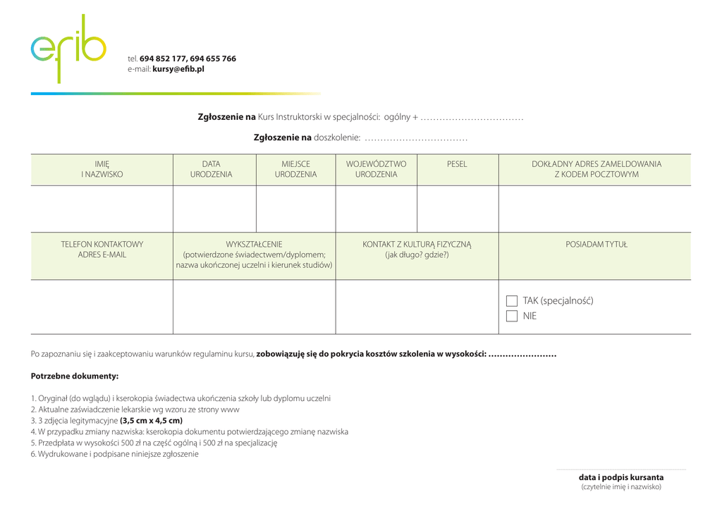 tel. 694 852 177, 694 655 766 e-mail: [email protected] Zgłoszenie na Kurs Instruktorski w specjalności: ogólny + …………………………… Zgłoszenie na doszkolenie: …………………………… IMIĘ I NAZWISKO TELEFON KONTAKTOWY ADRES E-MAIL DATA URODZENIA MIEJSCE URODZENIA WOJEWÓDZTWO URODZENIA WYKSZTAŁCENIE (potwierdzone świadectwem/dyplomem; nazwa ukończonej uczelni i kierunek studiów) PESEL DOKŁADNY ADRES ZAMELDOWANIA Z KODEM POCZTOWYM KONTAKT Z KULTURĄ FIZYCZNĄ (jak długo? gdzie?) POSIADAM TYTUŁ TAK (specjalność) NIE Po zapoznaniu się i zaakceptowaniu warunków regulaminu kursu, zobowiązuję się do pokrycia kosztów szkolenia w wysokości: …………………… Potrzebne dokumenty: 1. Oryginał (do wglądu) i kserokopia świadectwa ukończenia szkoły lub dyplomu uczelni 2. Aktualne zaświadczenie lekarskie wg wzoru ze strony www 3. 3 zdjęcia legitymacyjne (3,5 cm x 4,5 cm) 4. W przypadku zmiany nazwiska: kserokopia dokumentu potwierdzającego zmianę nazwiska 5. Przedpłata w wysokości 500 zł na część ogólną i 500 zł na specjalizację 6. Wydrukowane i podpisane niniejsze zgłoszenie .............................................................................................................. data i podpis kursanta (czytelnie imię i nazwisko) * TERMINY REALIZACJI KURSÓW SĄ UZALEŻNIONE OD NABORU UCZESTNIKÓW tel. 694 852 177, 694 655 766 e-mail: [email protected] Imię i nazwisko: ............................................................................................................................. Poznań, dnia .............................................. Ja niżej podpisany/a, oświadczam, iż: 1. Zapoznałam/em się z treścią regulaminu Efib i akceptuję go w całości .............................................................................................................. podpis 2. Posiadam ważne ubezpieczenie od następstw nieszczęśliwych wypadków na cały okres trwania kursu (polisę pakietową lub oddzielną) .............................................................................................................. podpis 3. Nie posiadam ubezpieczenia od następstw nieszczęśliwych wypadków na okres trwania kursu .............................................................................................................. podpis 4. W przypadku braku ubezpieczenia oświadczam, że zostałam/em poinformowany o konieczności dokonania takiego ubezpieczenia w własnym zakresie i jestem świadoma/y konsekwencji wynikających z jego braku. .............................................................................................................. podpis 5. Wyrażam zgodę na przetwarzanie danych osobowych przez organizatorów kursu - Efib - w rozumieniu ustawy z dnia 29 sierpnia 1997 roku o ochronie danych osobowych (dz. U. 133/97 poz. 883) .............................................................................................................. podpis 6. Wyrażam zgodę na otrzymywanie informacji drogą elektroniczną w rozumieniu ustawy z dnia 18 lipca 2002 r. o świadczeniu usług drogą elektroniczną, Dz.U. nr 144, poz. 1204. .............................................................................................................. podpis 7. Wyrażam zgodę na wykorzystanie swojego wizerunku w ramach dokumentacji fotograficznej z kursów na potrzeby reklamowo-marketingowe Efib (profil facebook, strona www i etc.) .............................................................................................................. podpis 8. Zobowiązuję się do wpłacenia pełnej kwoty należnej za udział w kursie za część ogólną i specjalistyczną w terminie podanym przez Efib .............................................................................................................. podpis