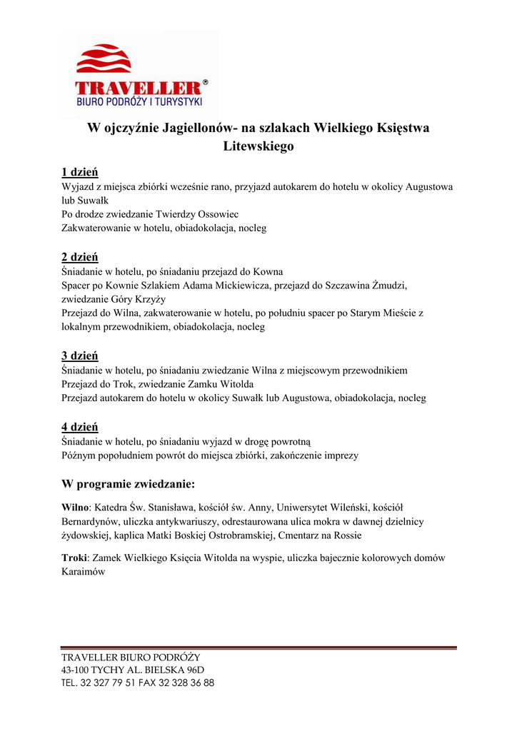 W ojczyźnie Jagiellonów- na szlakach Wielkiego Księstwa Litewskiego 1 dzień Wyjazd z miejsca zbiórki wcześnie rano, przyjazd autokarem do hotelu w okolicy Augustowa lub Suwałk Po drodze zwiedzanie Twierdzy Ossowiec Zakwaterowanie w hotelu, obiadokolacja, nocleg 2 dzień Śniadanie w hotelu, po śniadaniu przejazd do Kowna Spacer po Kownie Szlakiem Adama Mickiewicza, przejazd do Szczawina śmudzi, zwiedzanie Góry KrzyŜy Przejazd do Wilna, zakwaterowanie w hotelu, po południu spacer po Starym Mieście z lokalnym przewodnikiem, obiadokolacja, nocleg 3 dzień Śniadanie w hotelu, po śniadaniu zwiedzanie Wilna z miejscowym przewodnikiem Przejazd do Trok, zwiedzanie Zamku Witolda Przejazd autokarem do hotelu w okolicy Suwałk lub Augustowa, obiadokolacja, nocleg 4 dzień Śniadanie w hotelu, po śniadaniu wyjazd w drogę powrotną Późnym popołudniem powrót do miejsca zbiórki, zakończenie imprezy W programie zwiedzanie: Wilno: Katedra Św. Stanisława, kościół św. Anny, Uniwersytet Wileński, kościół Bernardynów, uliczka antykwariuszy, odrestaurowana ulica mokra w dawnej dzielnicy Ŝydowskiej, kaplica Matki Boskiej Ostrobramskiej, Cmentarz na Rossie Troki: Zamek Wielkiego Księcia Witolda na wyspie, uliczka bajecznie kolorowych domów Karaimów TRAVELLER BIURO PODRÓŻY 43-100 TYCHY AL. BIELSKA 96D TEL. 32 327 79 51 FAX 32 328 36 88 Cena obejmuje: PodróŜ komfortowym autokarem, opiekę pilota, 2 noclegi w Polsce w okolicy Suwałk lub Augustowa, 1 nocleg w Wilnie, 3 śniadania ,3 obiadokolacje z deserem (bez napojów), bilety wstępu do Twierdzy Ossowiec i do Zamku Witolda w Trokach, usługi lokalnych przewodników, opłaty drogowe i parkingowe, ubezpieczenie KL i NNW, podatek VAT TRAVELLER BIURO PODRÓŻY 43-100 TYCHY AL. BIELSKA 96D TEL. 32 327 79 51 FAX 32 328 36 88