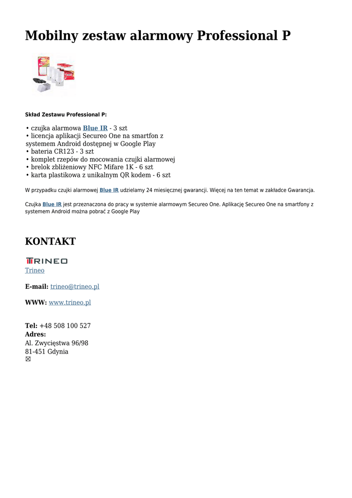 Mobilny zestaw alarmowy Professional P Skład Zestawu Professional P: • czujka alarmowa Blue IR - 3 szt • licencja aplikacji Secureo One na smartfon z systemem Android dostępnej w Google Play • bateria CR123 - 3 szt • komplet rzepów do mocowania czujki alarmowej • brelok zbliżeniowy NFC Mifare 1K - 6 szt • karta plastikowa z unikalnym QR kodem - 6 szt W przypadku czujki alarmowej Blue IR udzielamy 24 miesięcznej gwarancji. Więcej na ten temat w zakładce Gwarancja. Czujka Blue IR jest przeznaczona do pracy w systemie alarmowym Secureo One. Aplikację Secureo One na smartfony z systemem Android można pobrać z Google Play KONTAKT Trineo E-mail: [email protected] WWW: www.trineo.pl Tel: +48 508 100 527 Adres: Al. Zwycięstwa 96/98 81-451 Gdynia